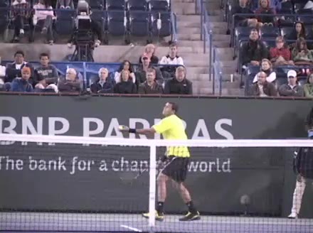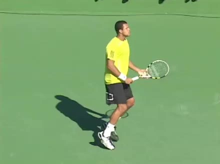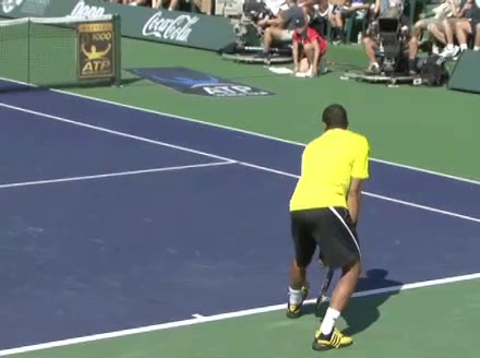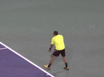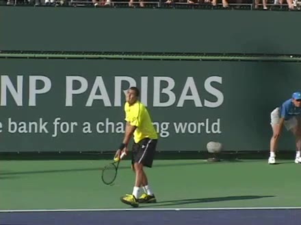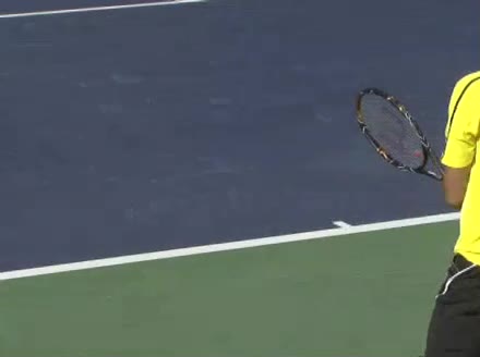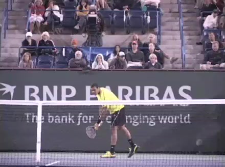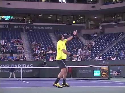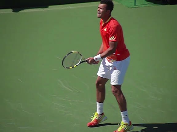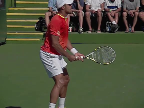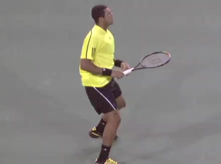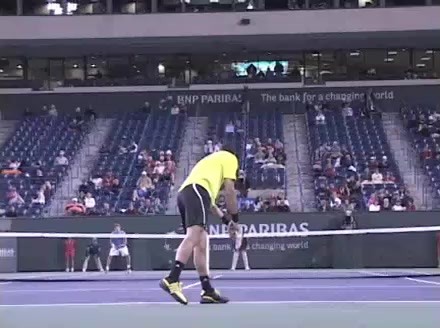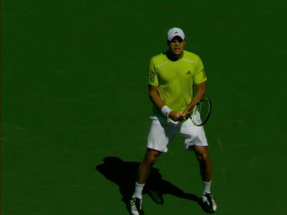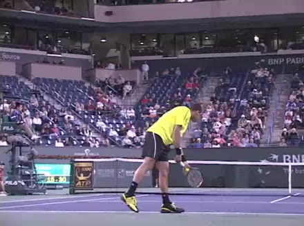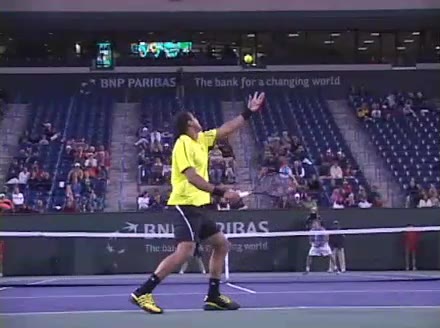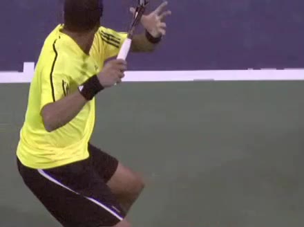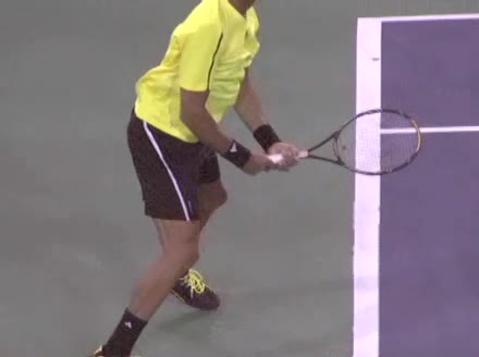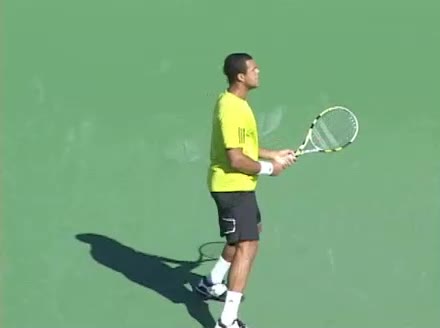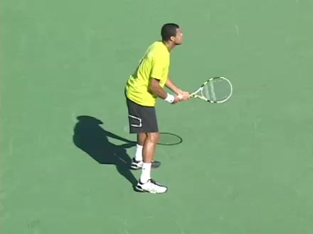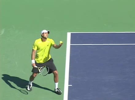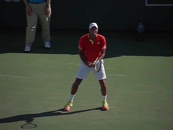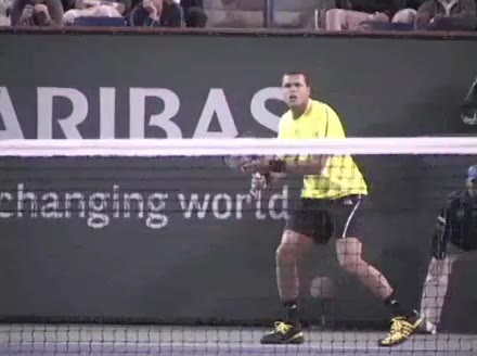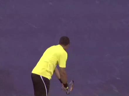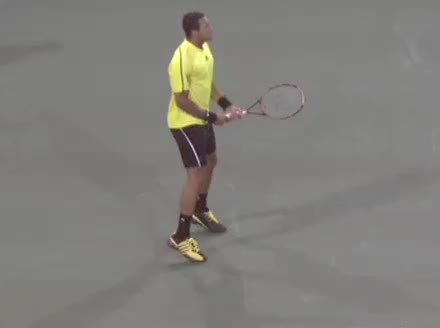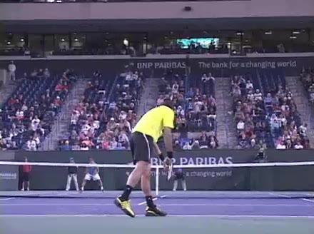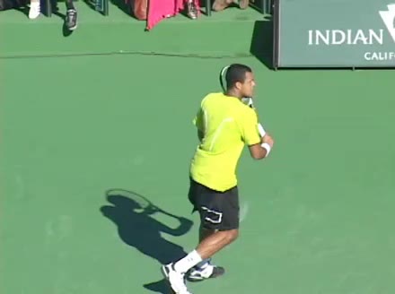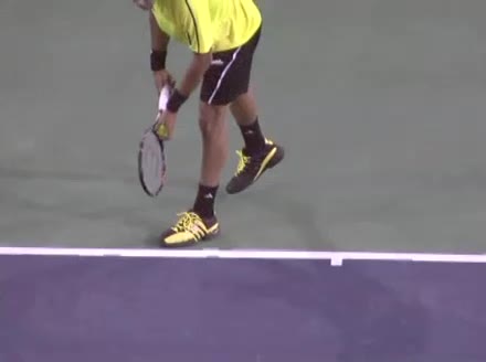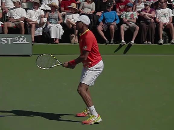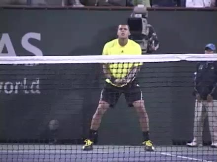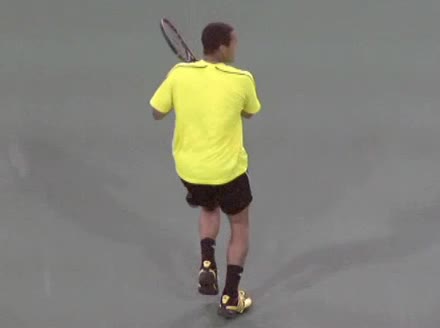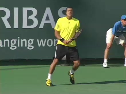 Jo-Wilfried Tsonga's second serve from the deuce court, filmed from the side. The racket moves up to contact with a slightly closed face and reaches the ball at about head height, showing a steep upward swing path for spin.