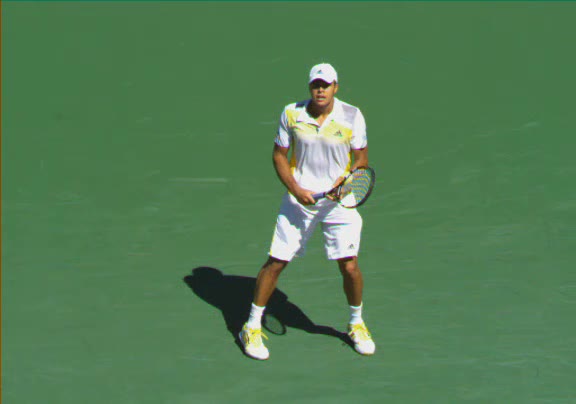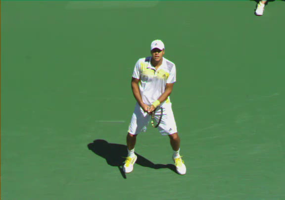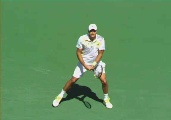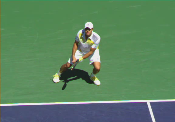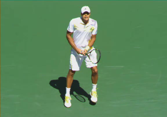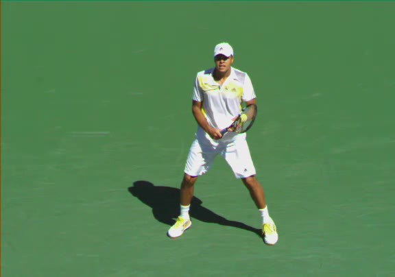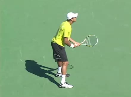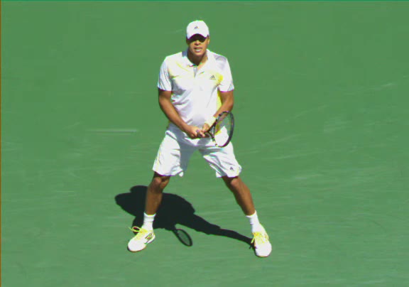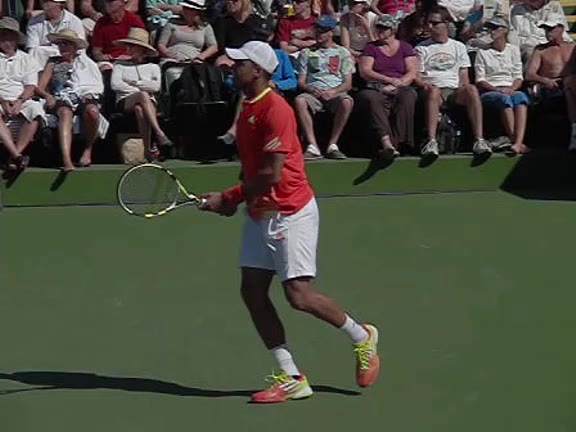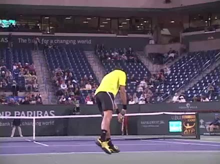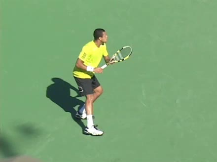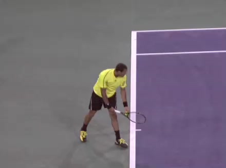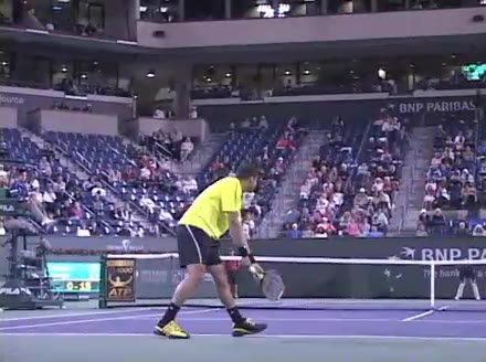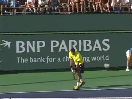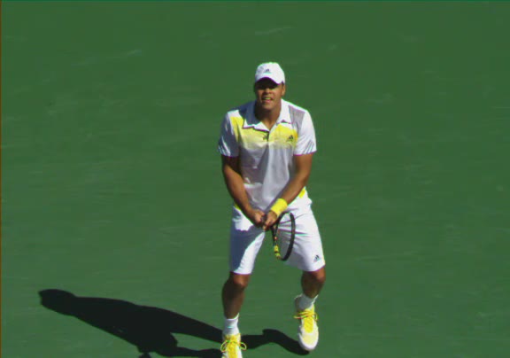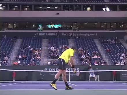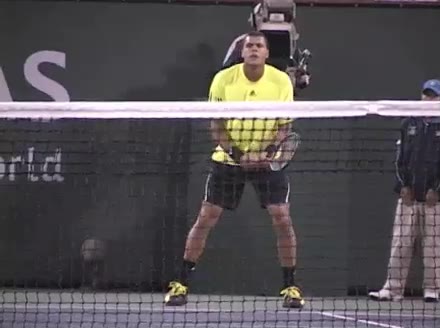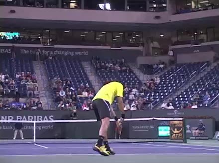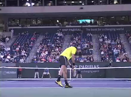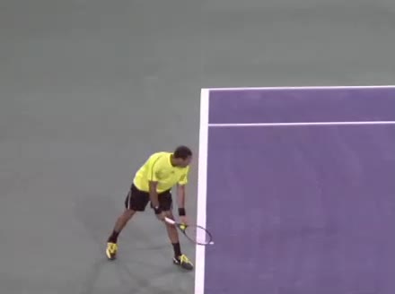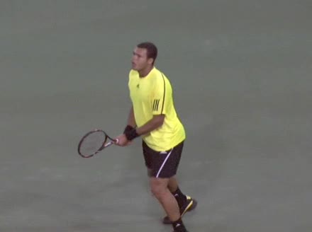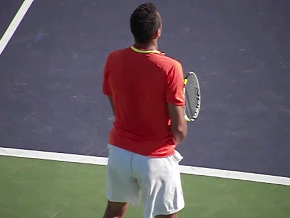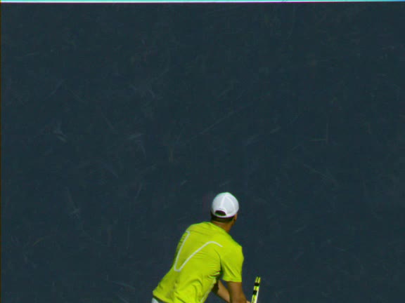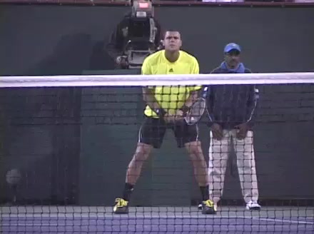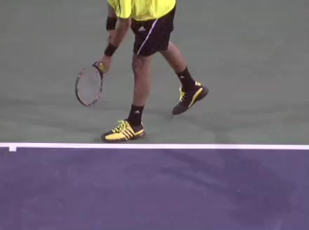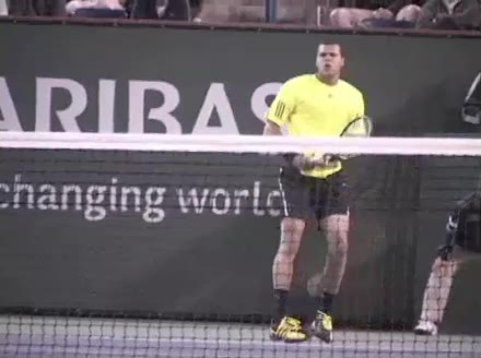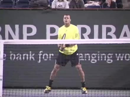 Jo-Wilfried Tsonga's second serve from the deuce court, filmed from the side. The racket moves up to contact with a slightly closed face and reaches the ball at about head height, showing a steep upward swing path for spin.