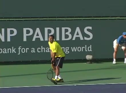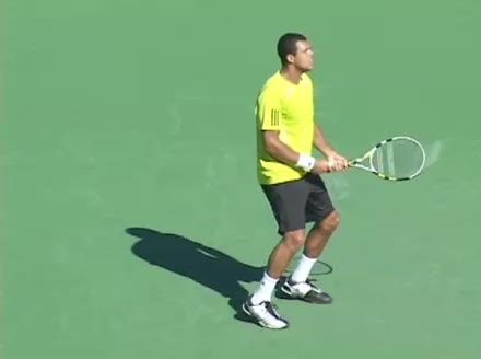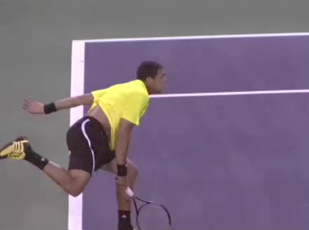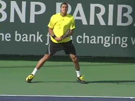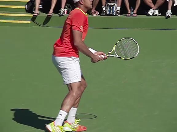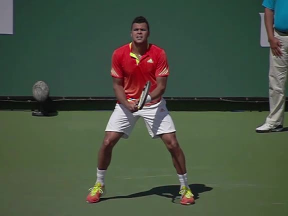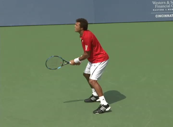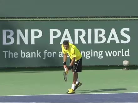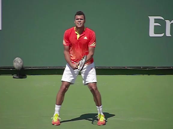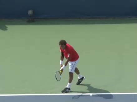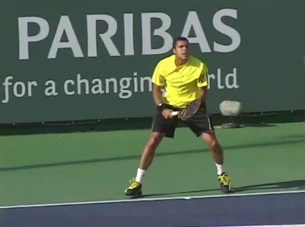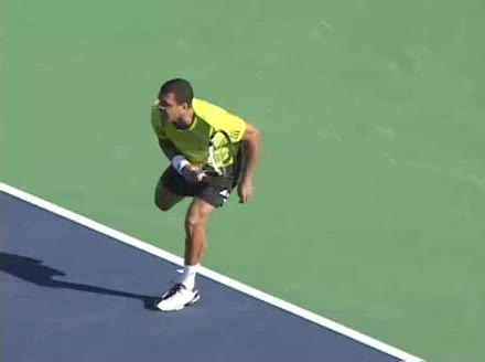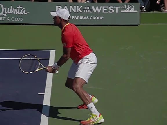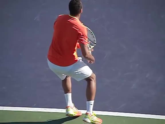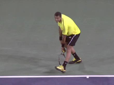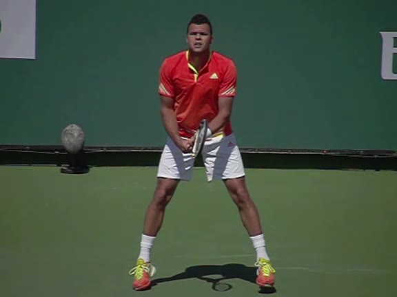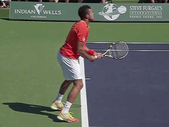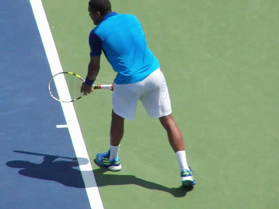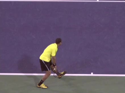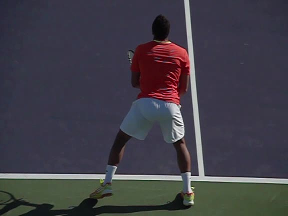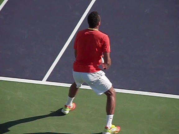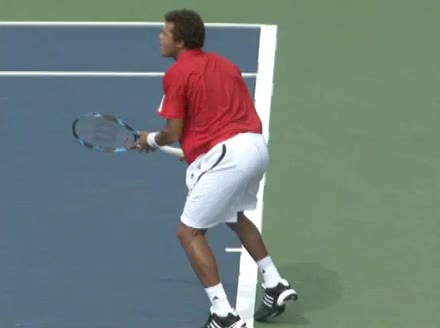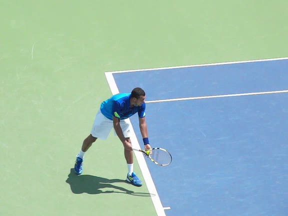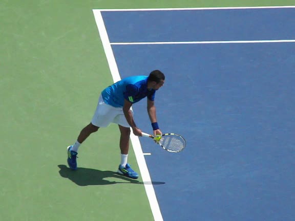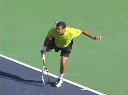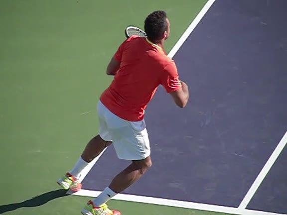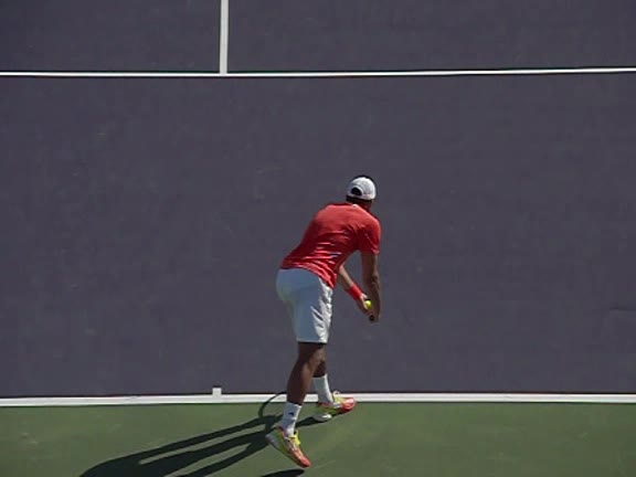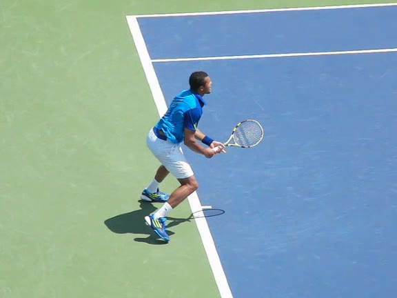 Jo-Wilfried Tsonga's second serve from the deuce side, filmed from the side. After contact he drives his weight into the court and quickly brings his non-hitting hand back toward his torso as he lands in a balanced position ready for the next shot.