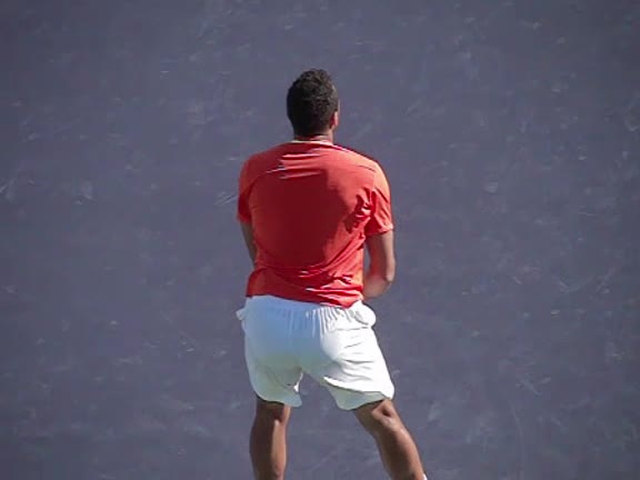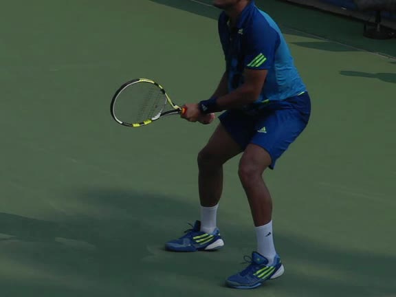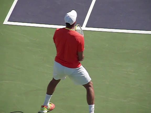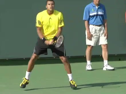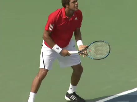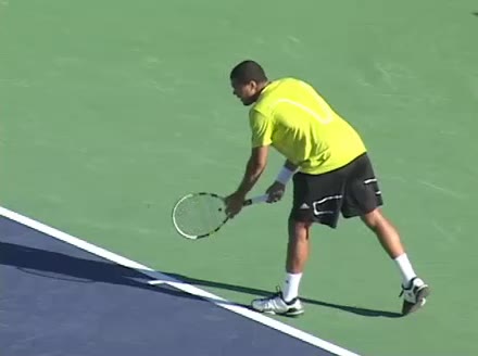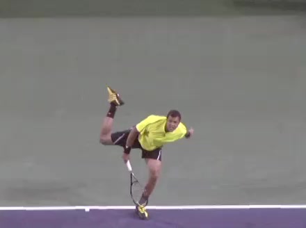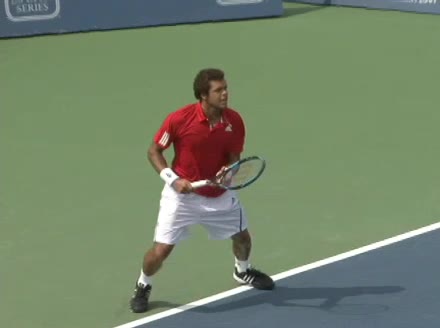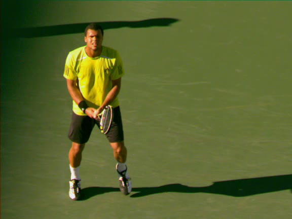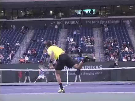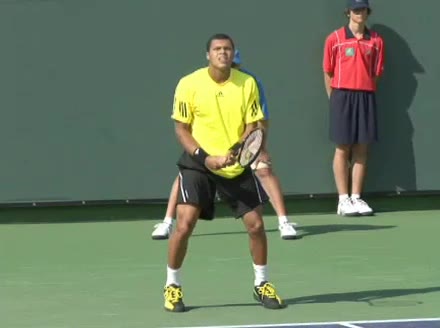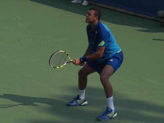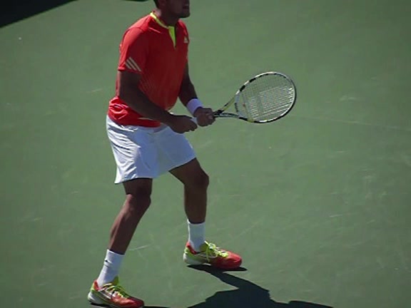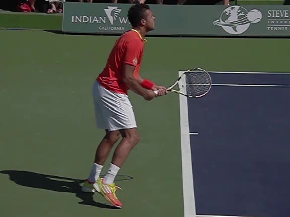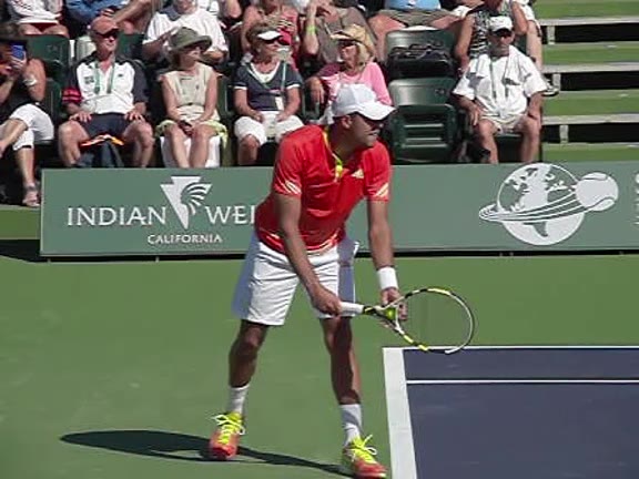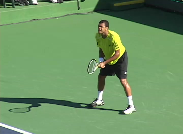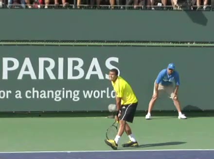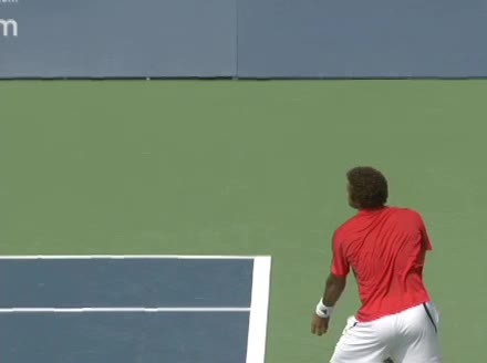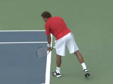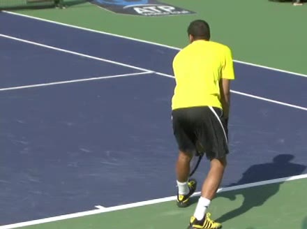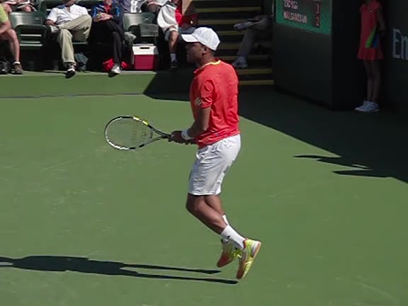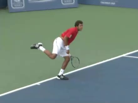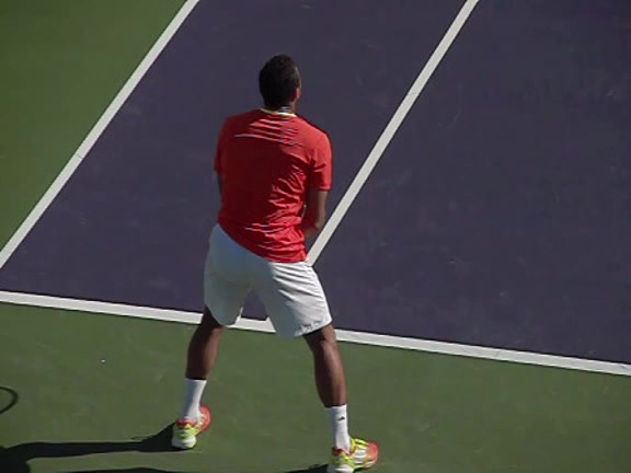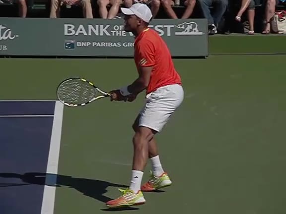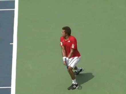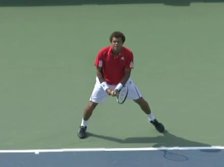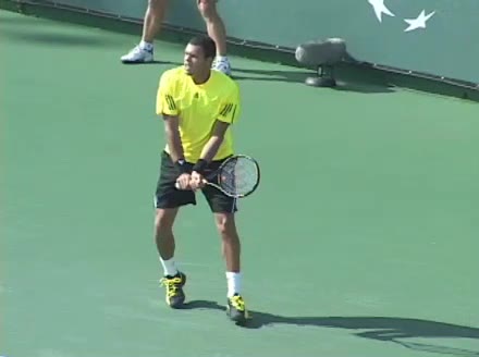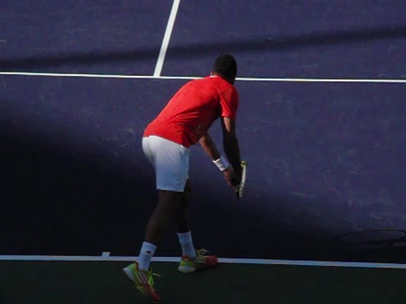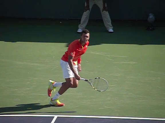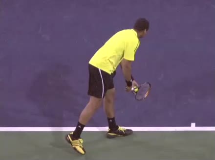Jo-Wilfried Tsonga's second serve from the deuce side, filmed from the side. After contact he drives his weight into the court and quickly brings his non-hitting hand back toward his torso as he lands in a balanced position ready for the next shot.