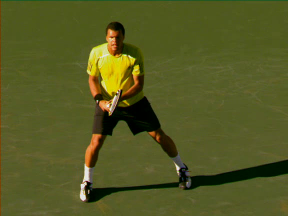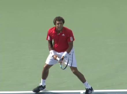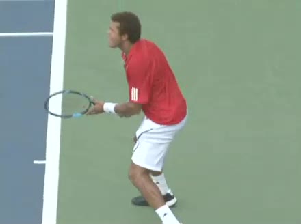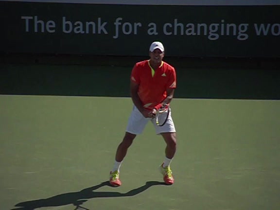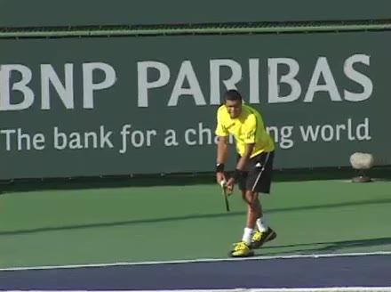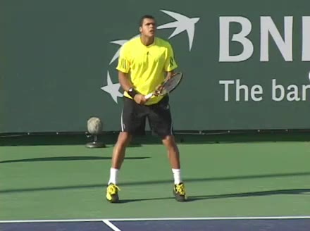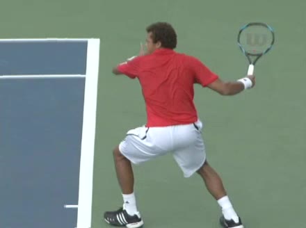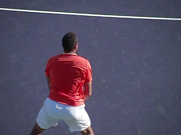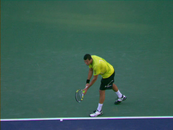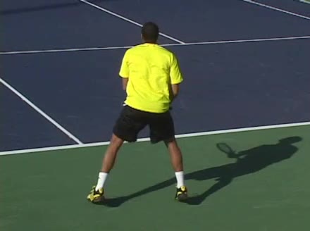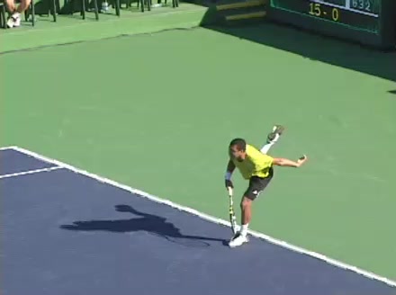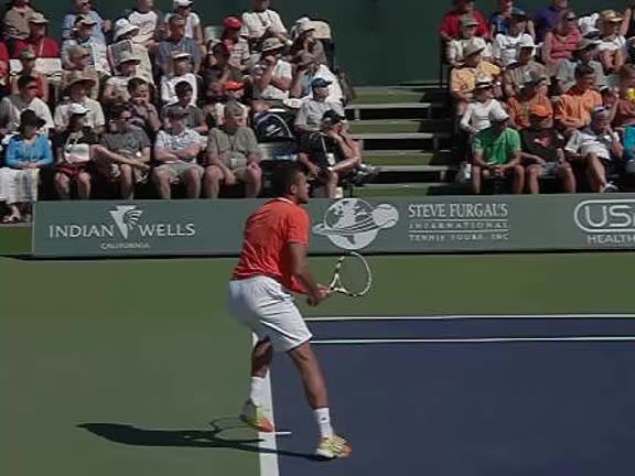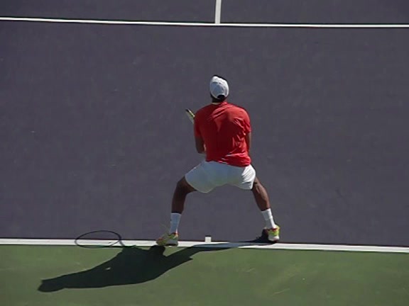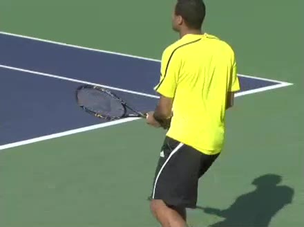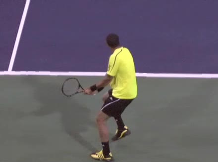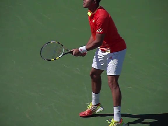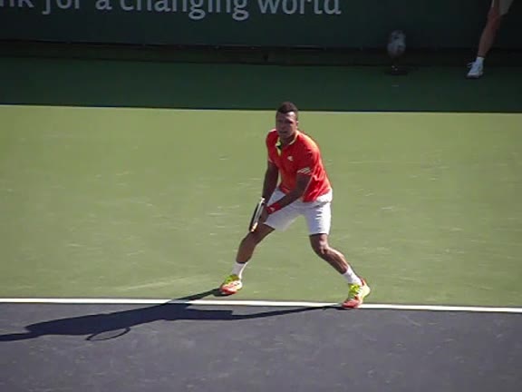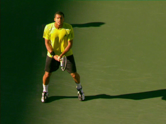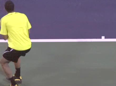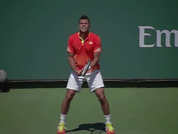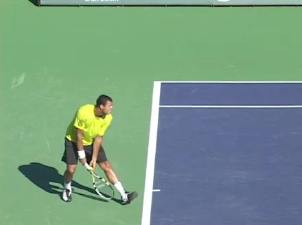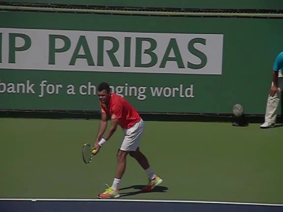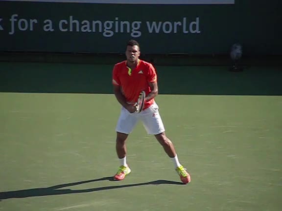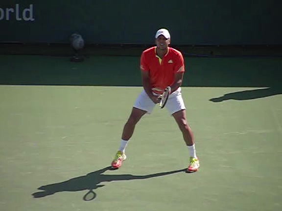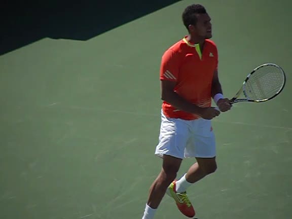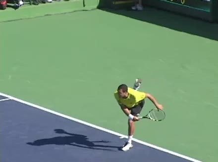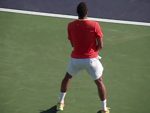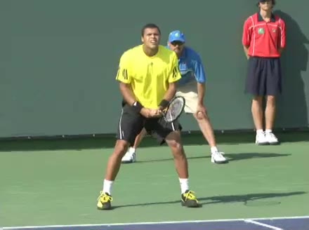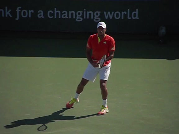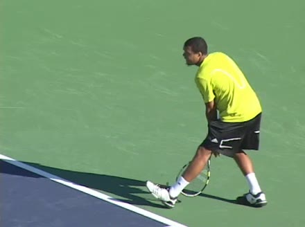 Jo-Wilfried Tsonga's second serve from the deuce side, filmed from the side. After contact he drives his weight into the court and quickly brings his non-hitting hand back toward his torso as he lands in a balanced position ready for the next shot.