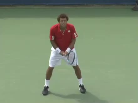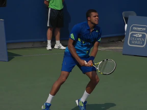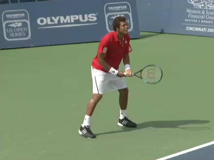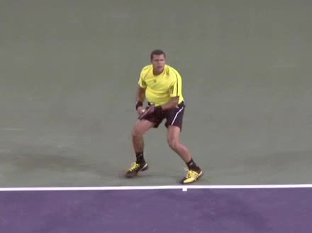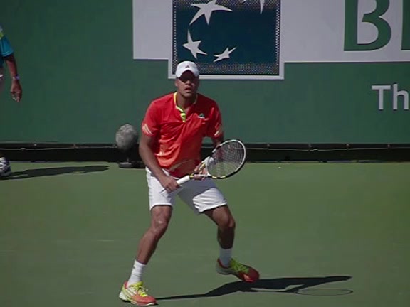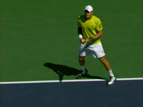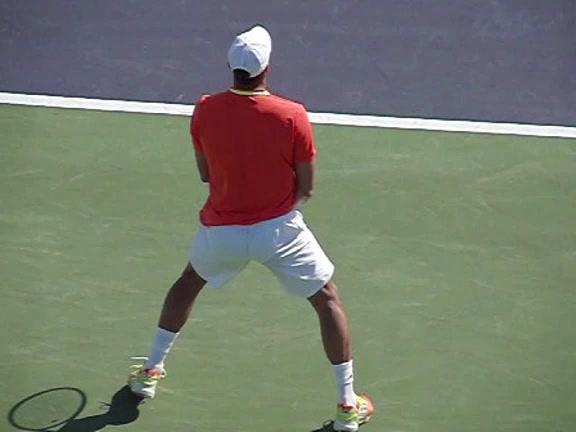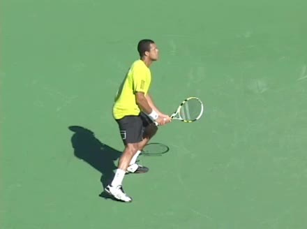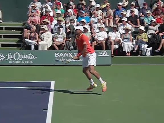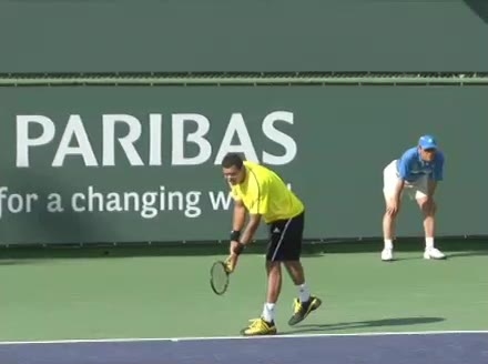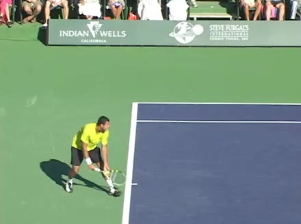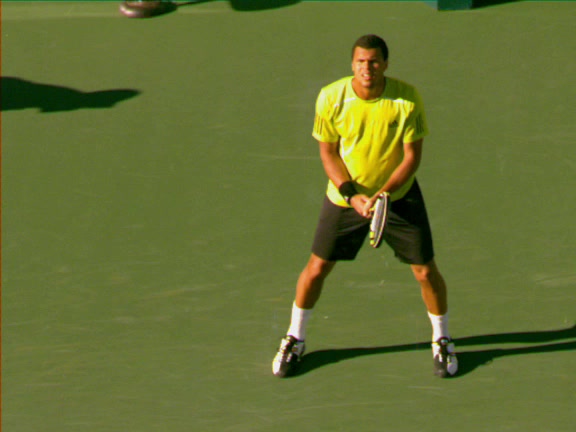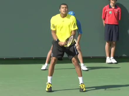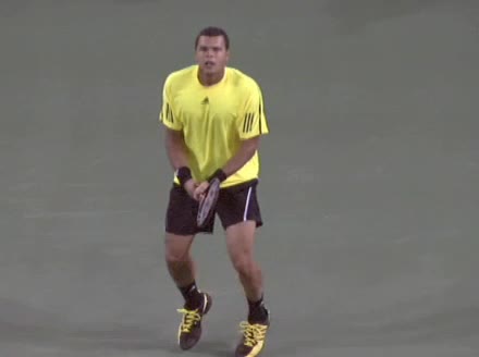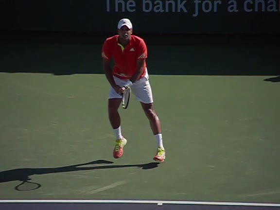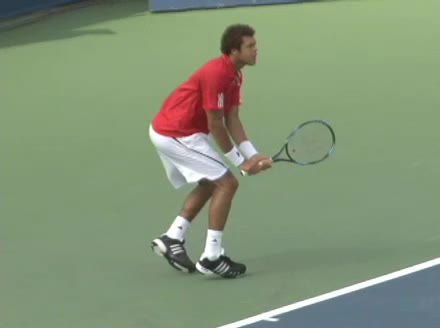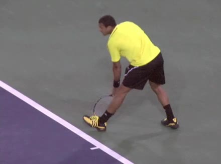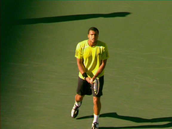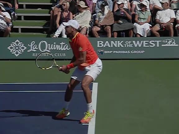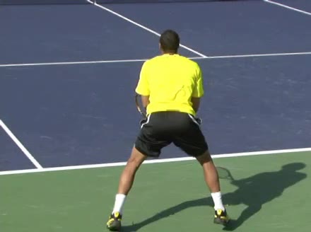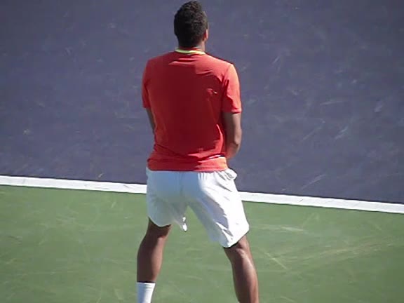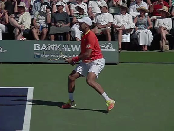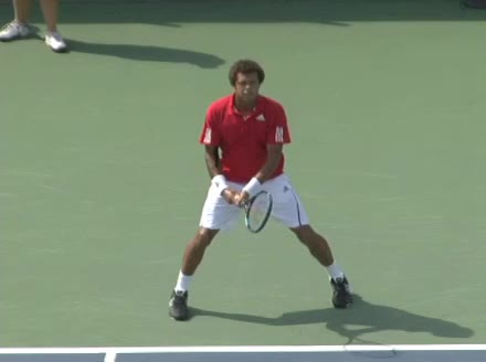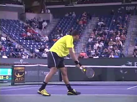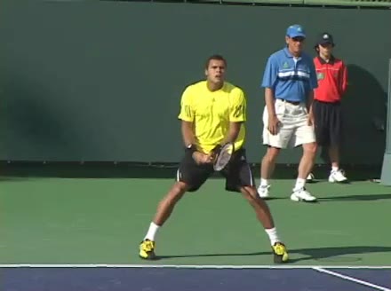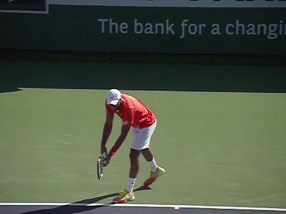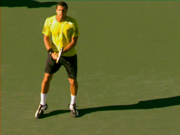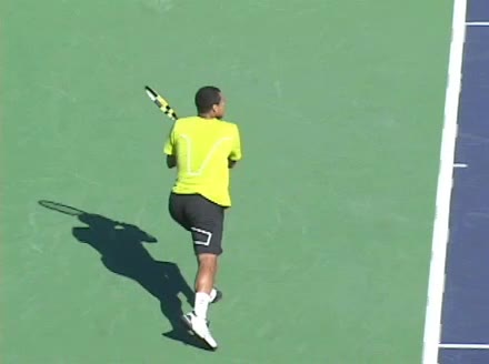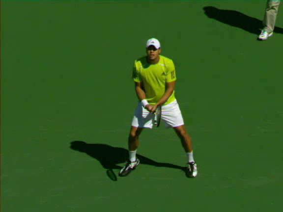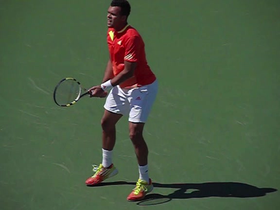 Jo-Wilfried Tsonga's second serve from the deuce side, filmed from the side. After contact he drives his weight into the court and quickly brings his non-hitting hand back toward his torso as he lands in a balanced position ready for the next shot.