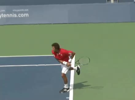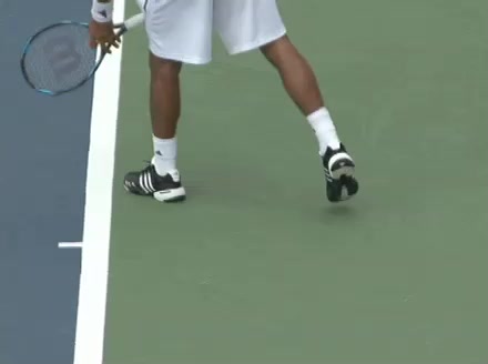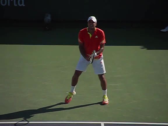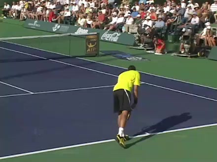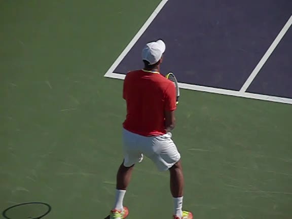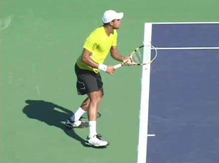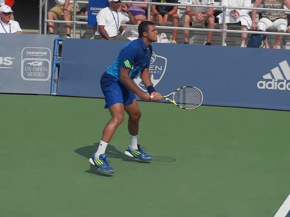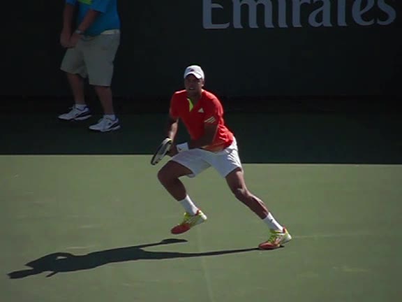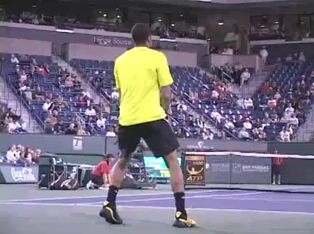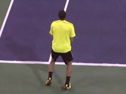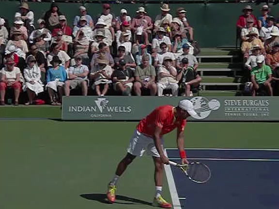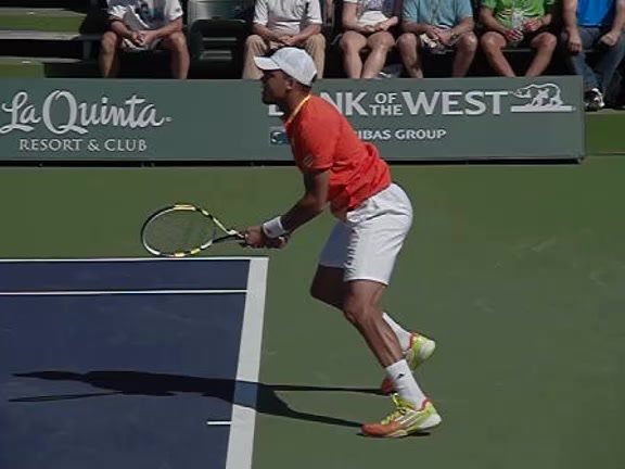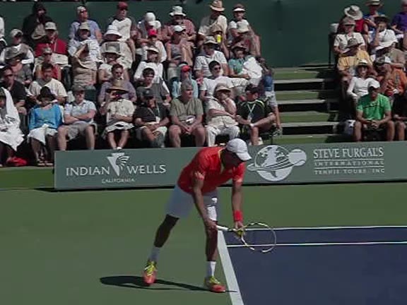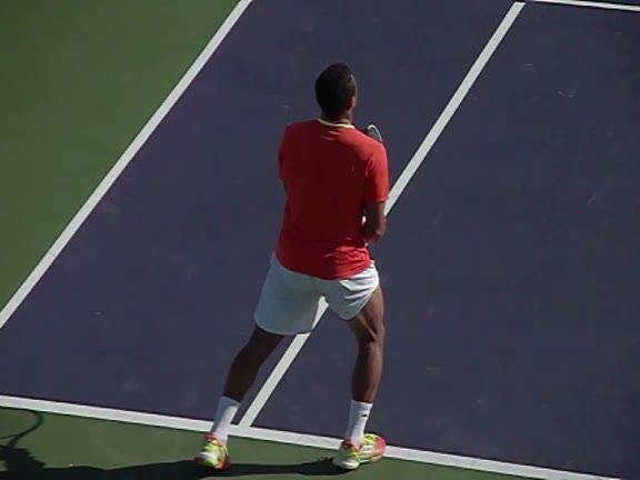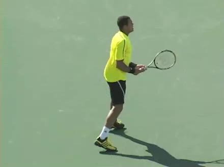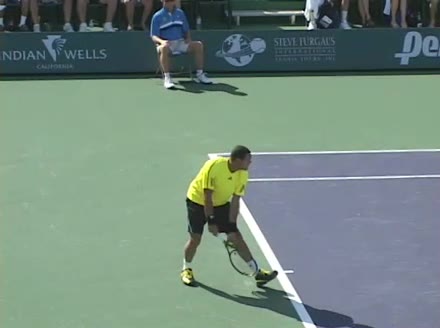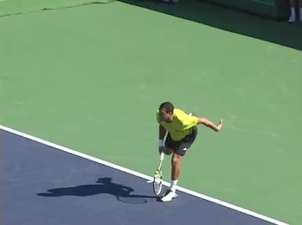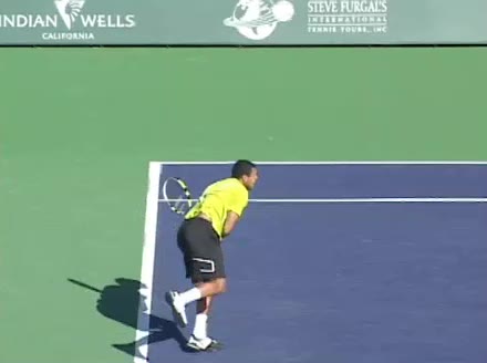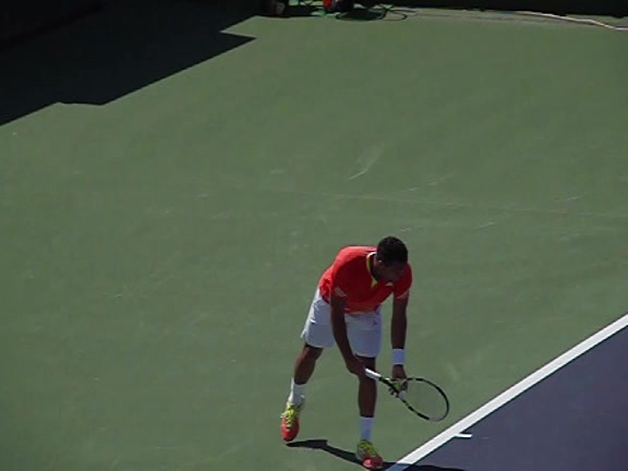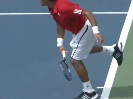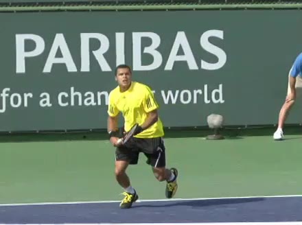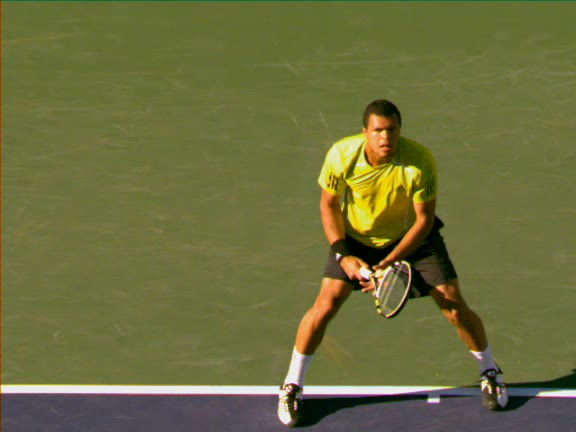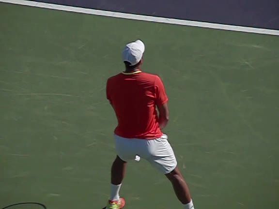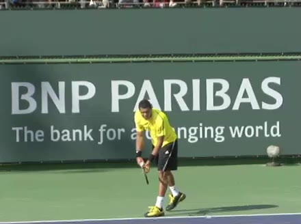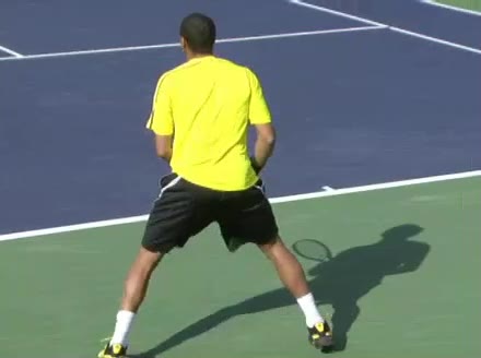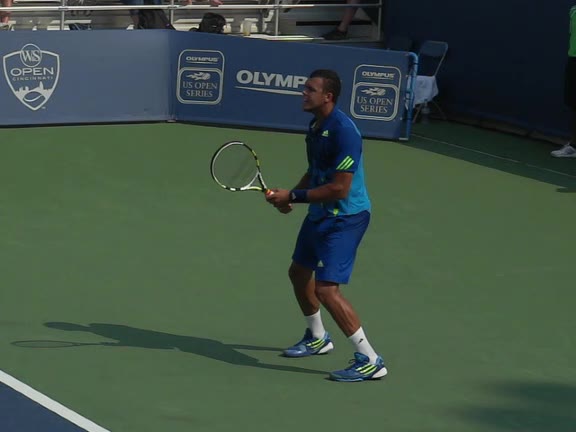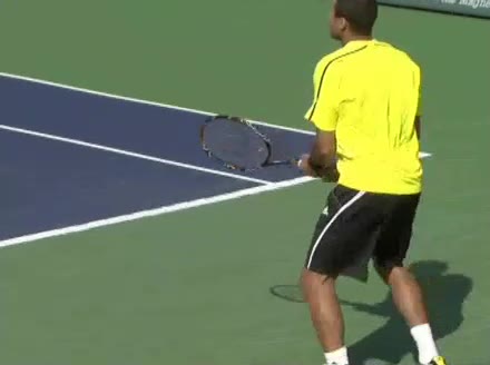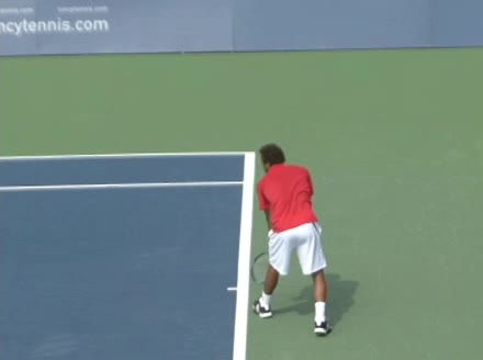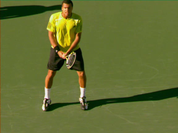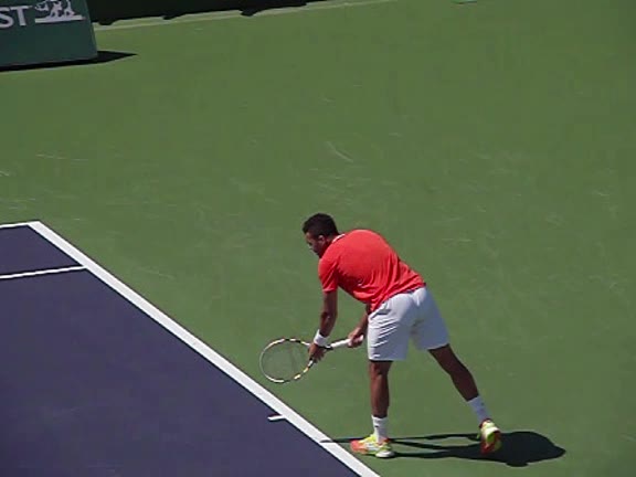 Jo-Wilfried Tsonga's second serve from the deuce side, filmed from the side. After contact he drives his weight into the court and quickly brings his non-hitting hand back toward his torso as he lands in a balanced position ready for the next shot.