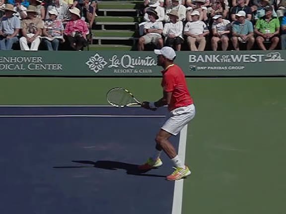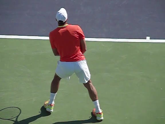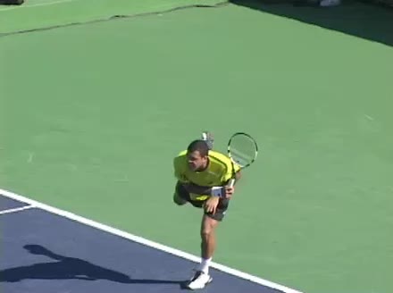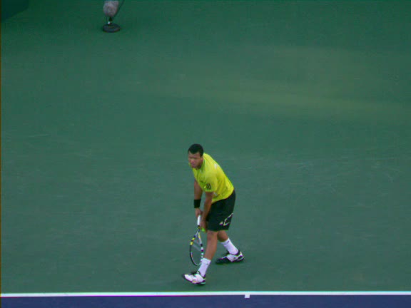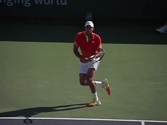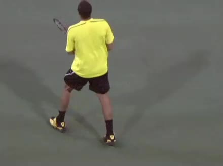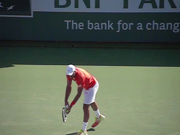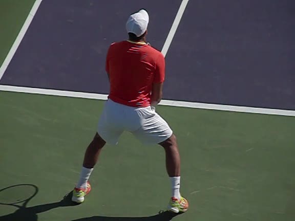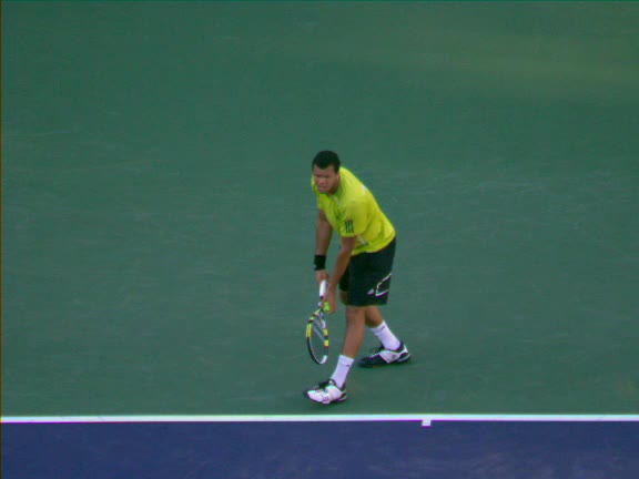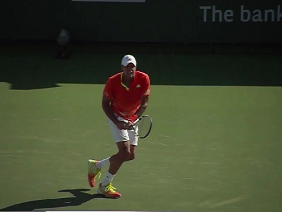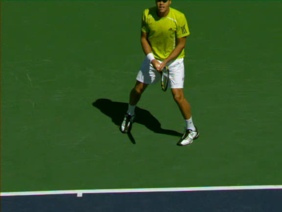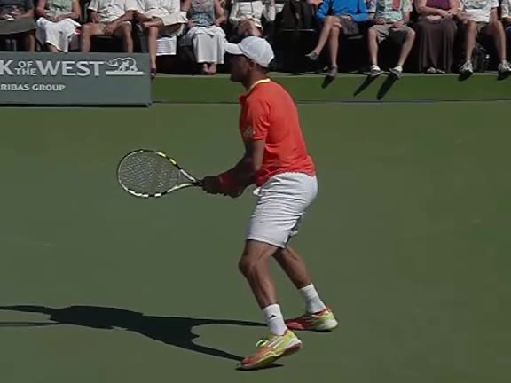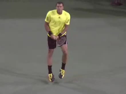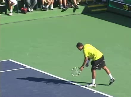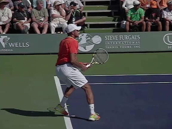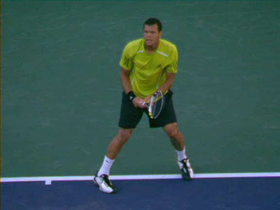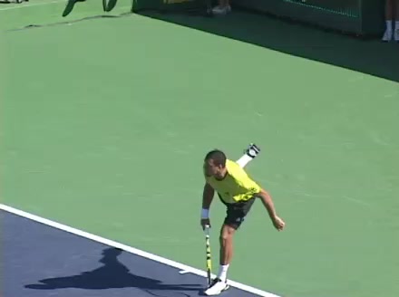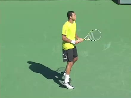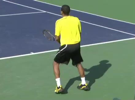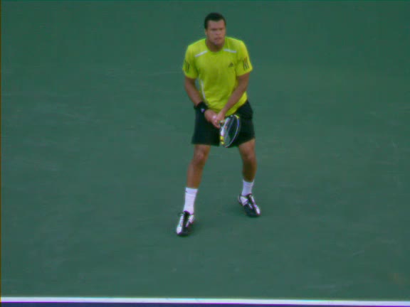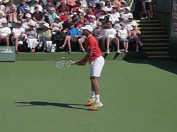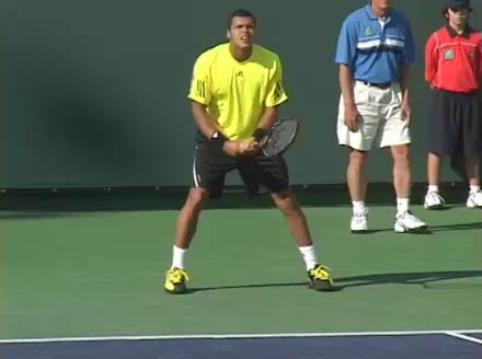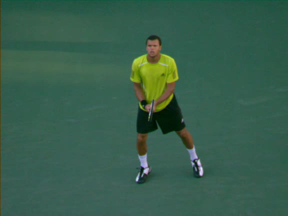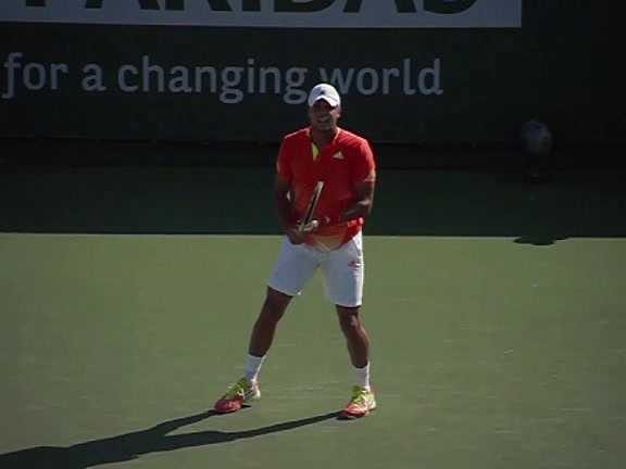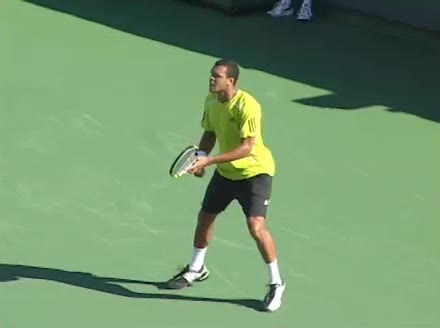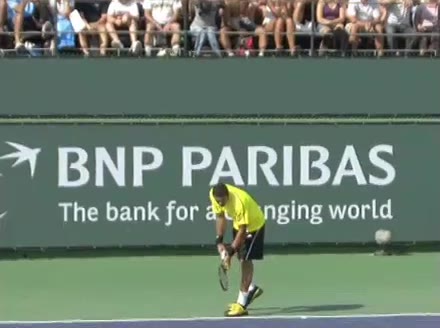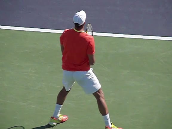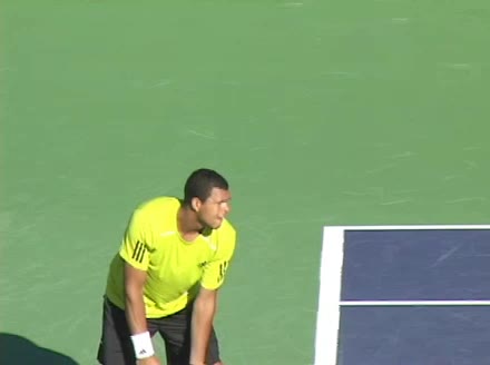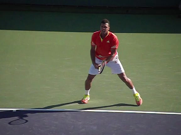 Jo-Wilfried Tsonga's second serve from the deuce side, filmed from the side. After contact he drives his weight into the court and quickly brings his non-hitting hand back toward his torso as he lands in a balanced position ready for the next shot.