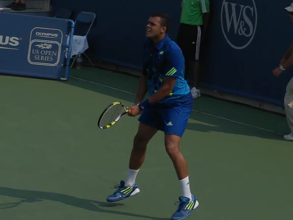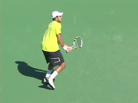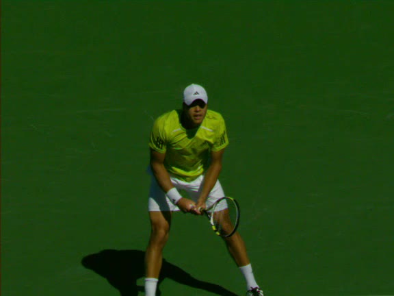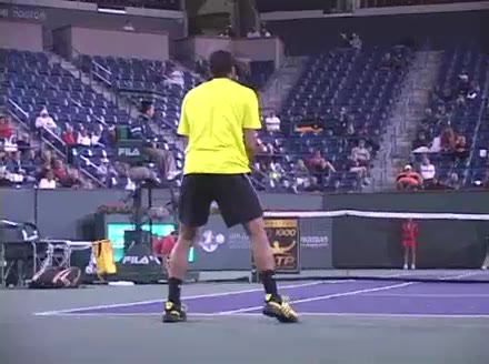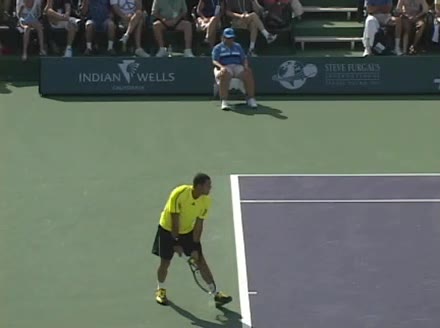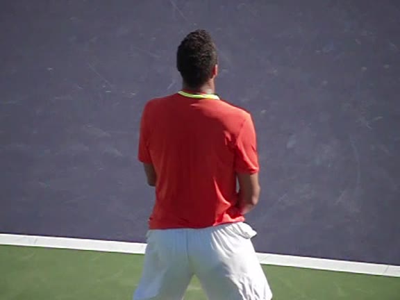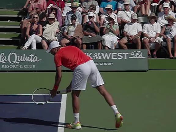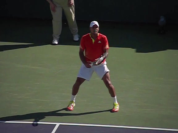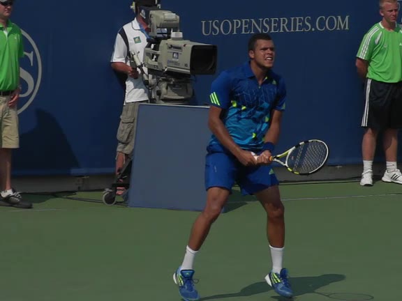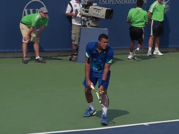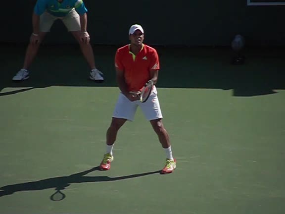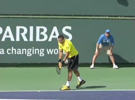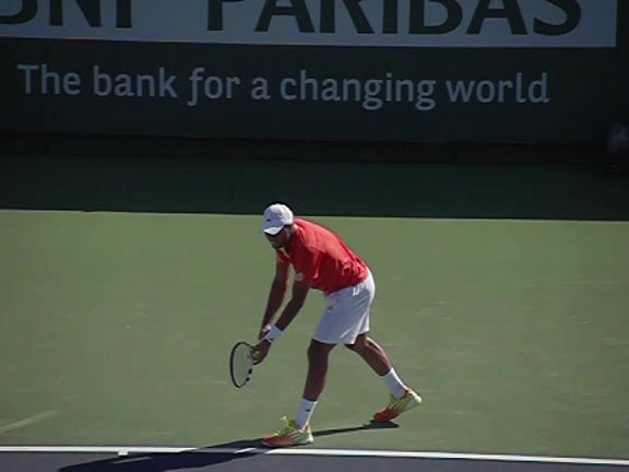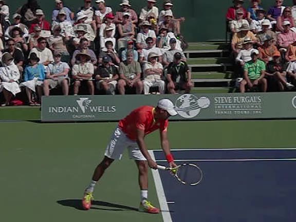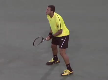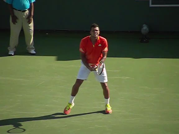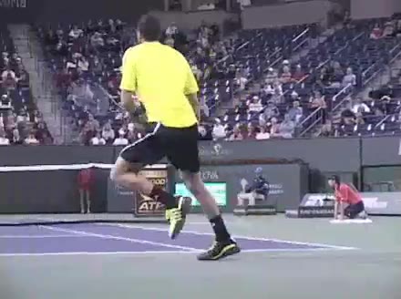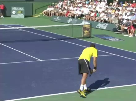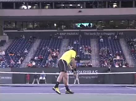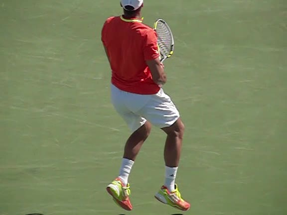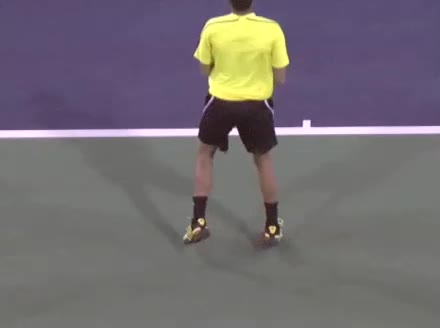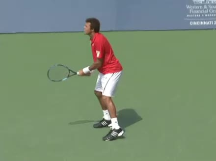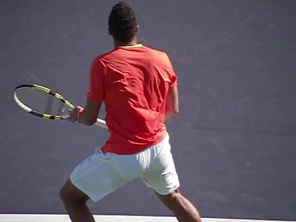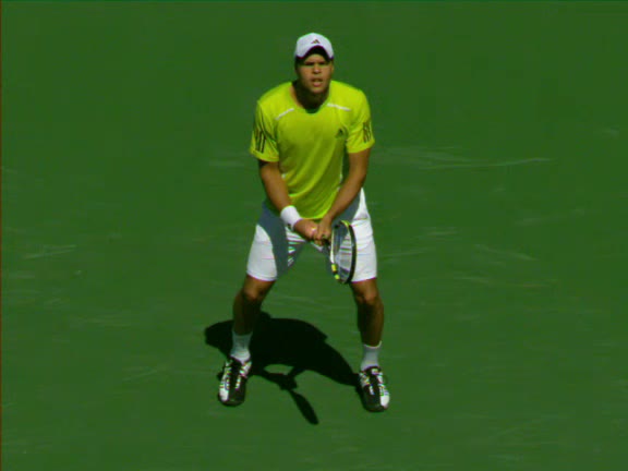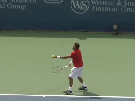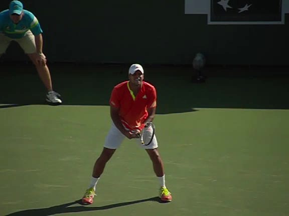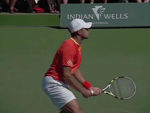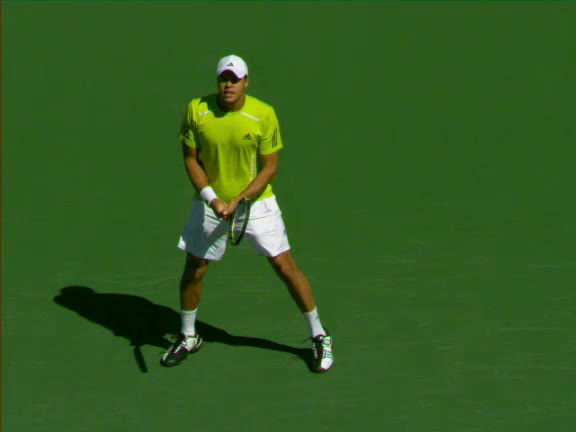 Jo-Wilfried Tsonga's second serve from the deuce side, filmed from the side. After contact he drives his weight into the court and quickly brings his non-hitting hand back toward his torso as he lands in a balanced position ready for the next shot.