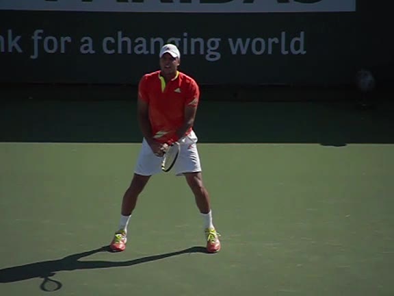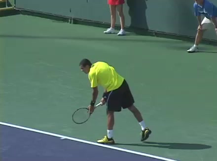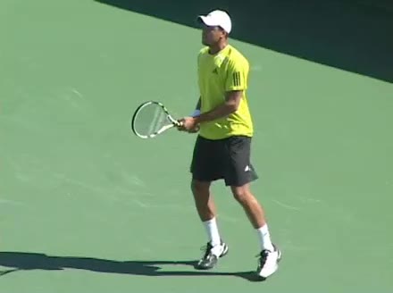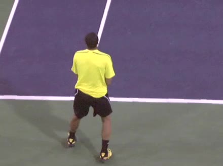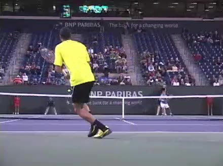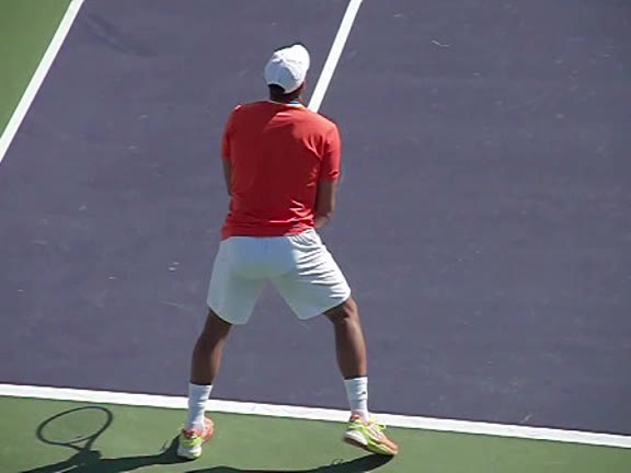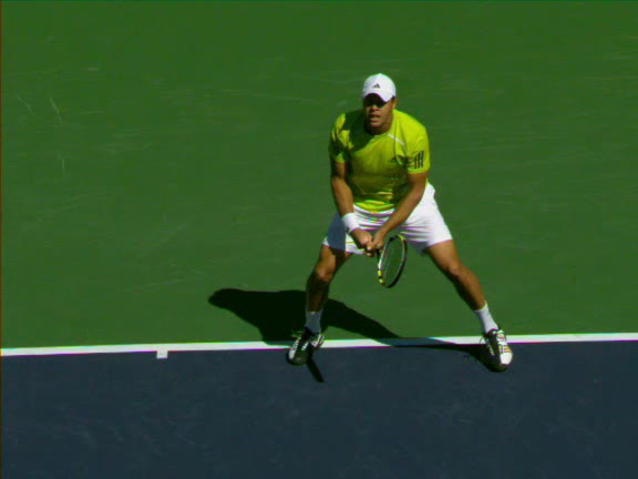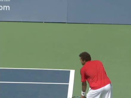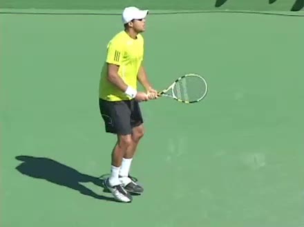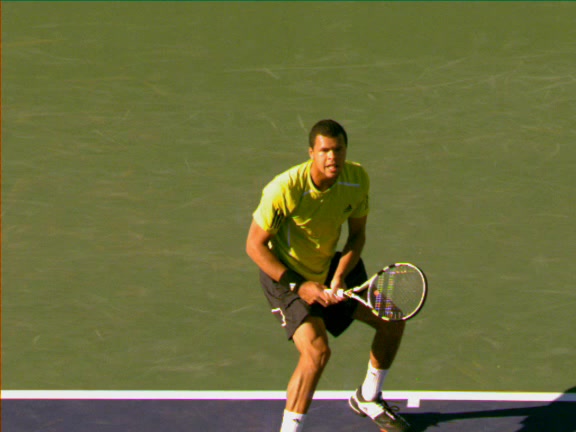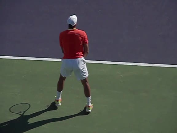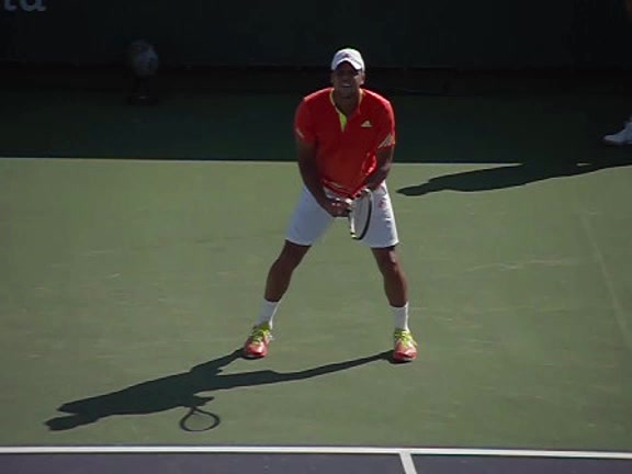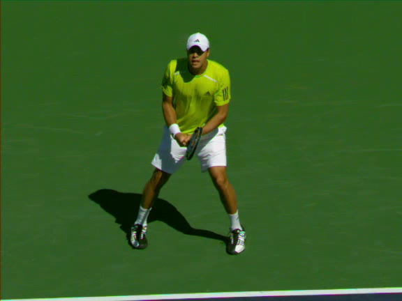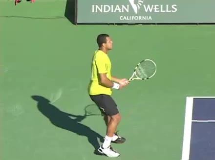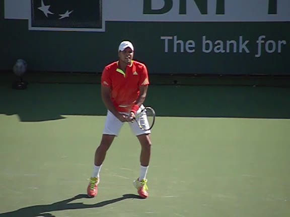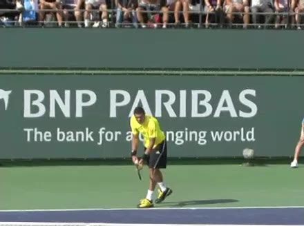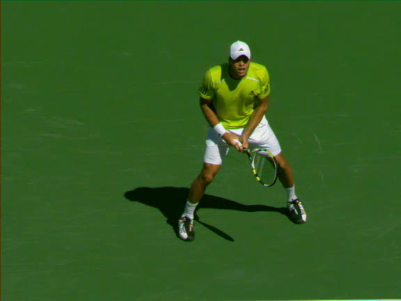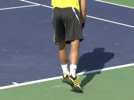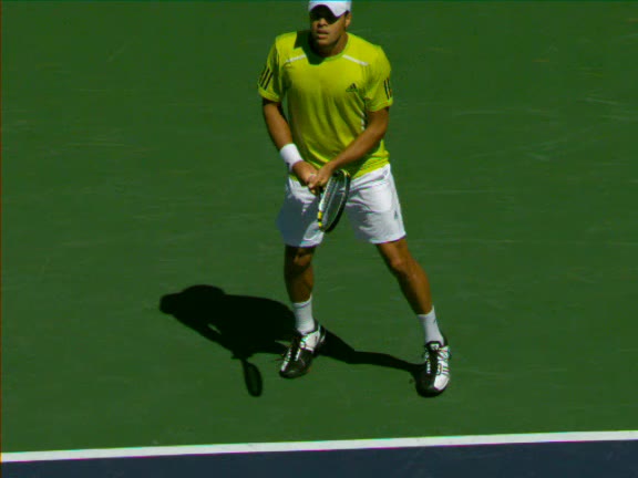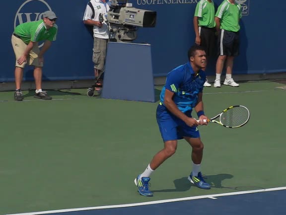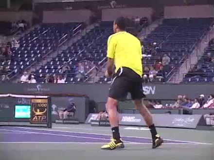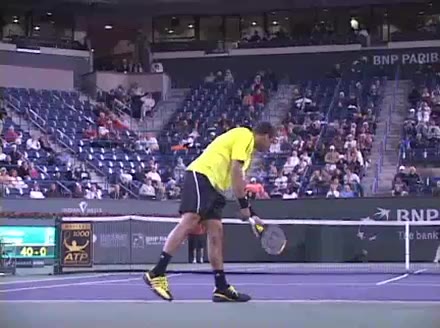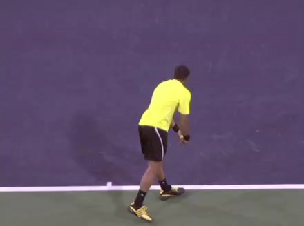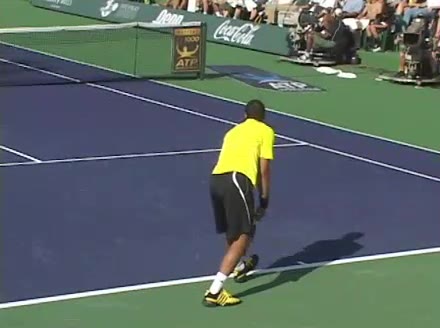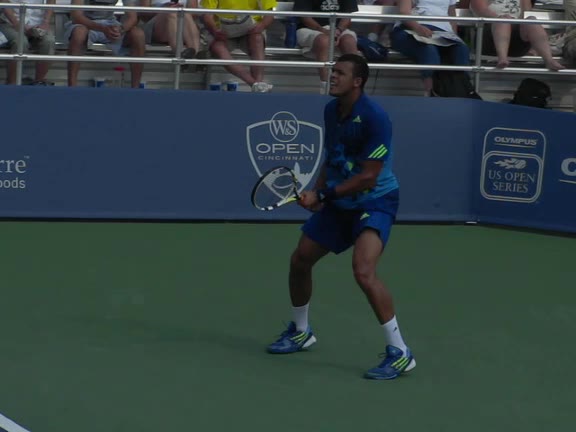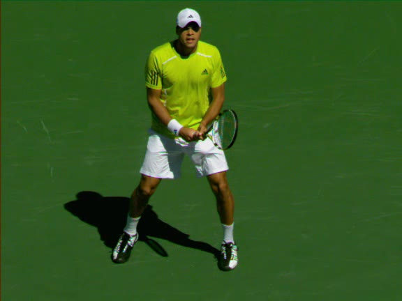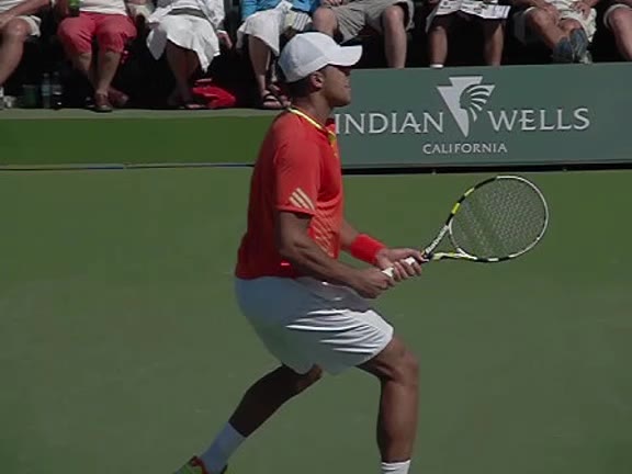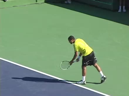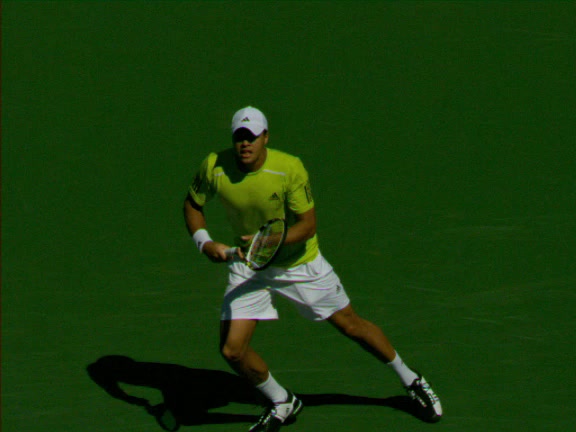Jo-Wilfried Tsonga's second serve from the deuce side, filmed from the side. After contact he drives his weight into the court and quickly brings his non-hitting hand back toward his torso as he lands in a balanced position ready for the next shot.
