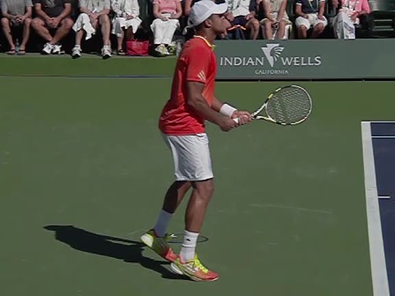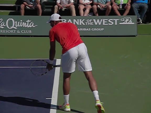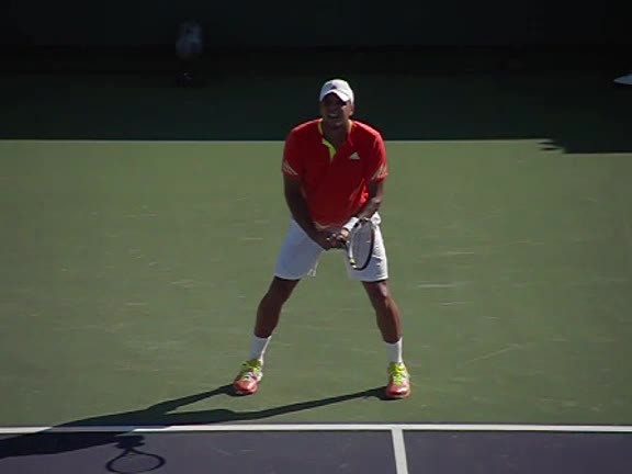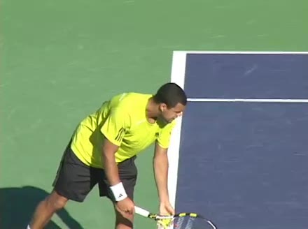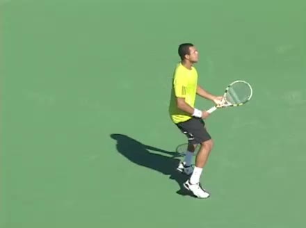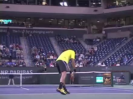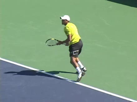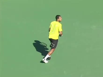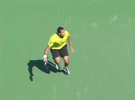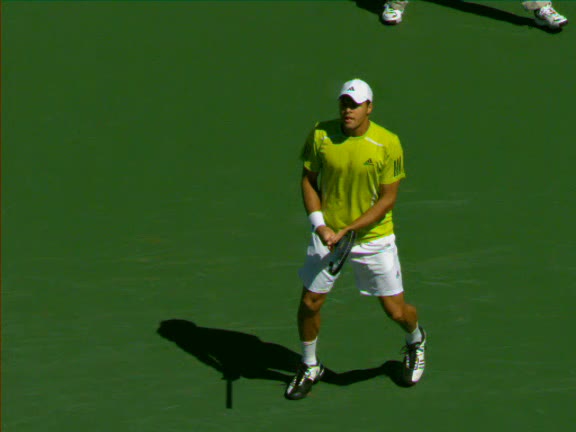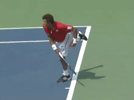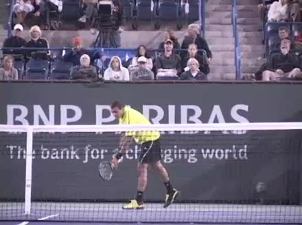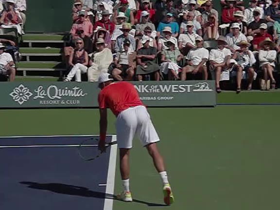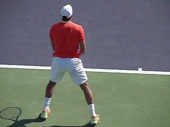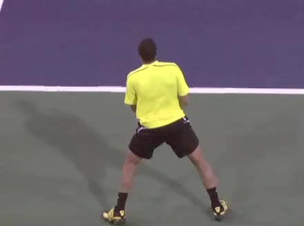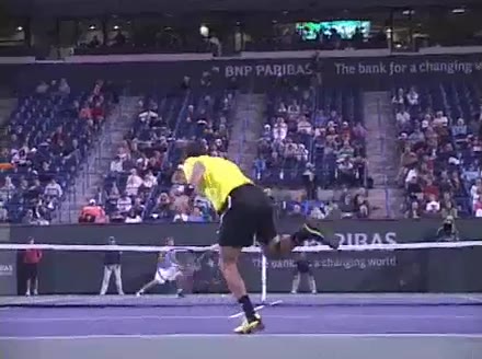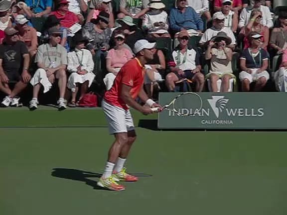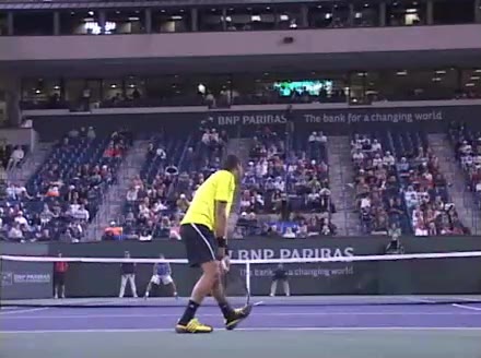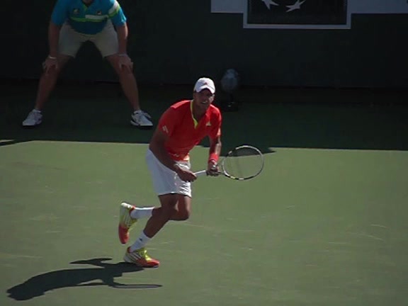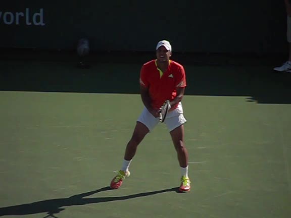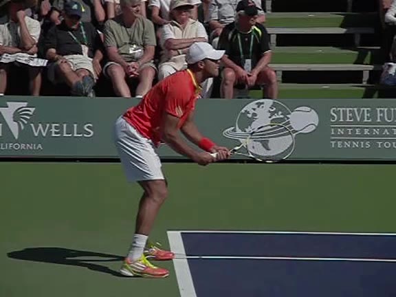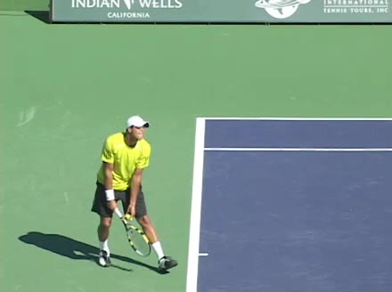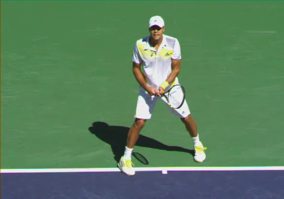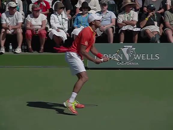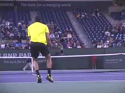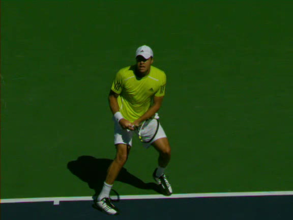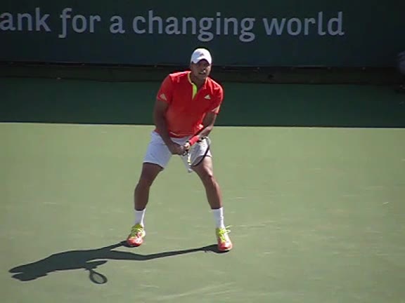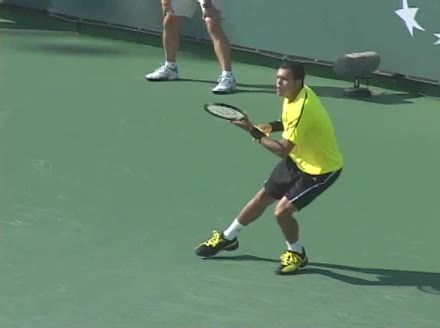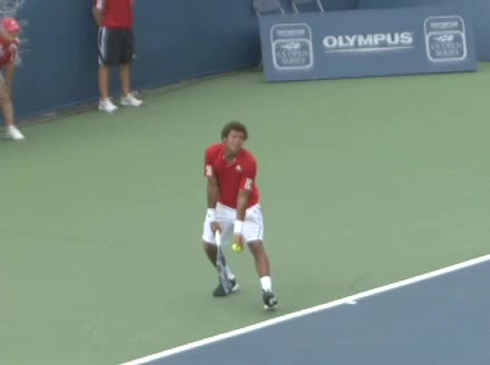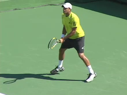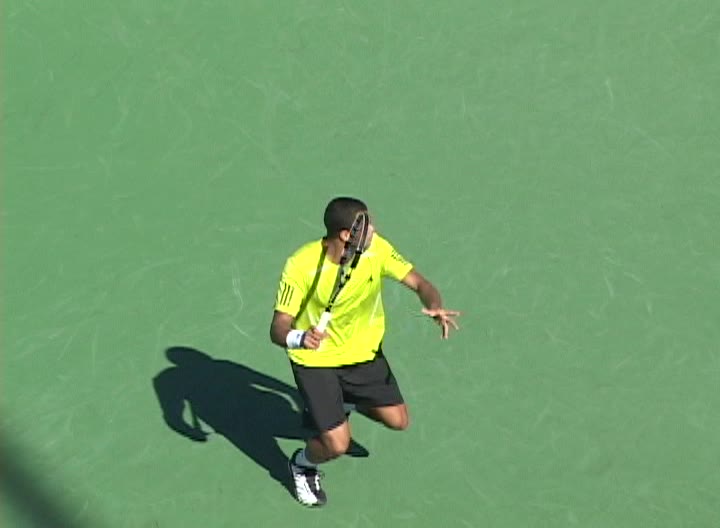 Jo-Wilfried Tsonga's second serve from the deuce side, filmed from the side. After contact he drives his weight into the court and quickly brings his non-hitting hand back toward his torso as he lands in a balanced position ready for the next shot.