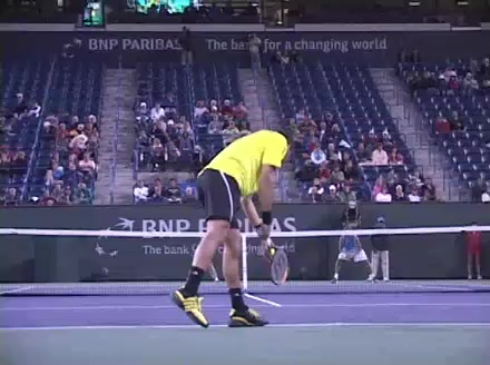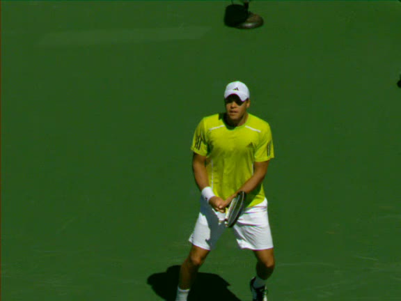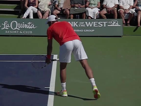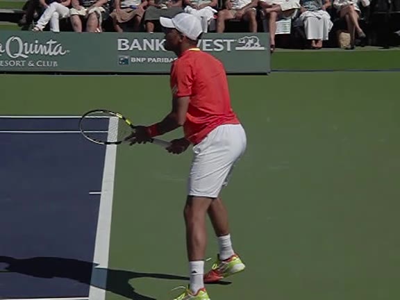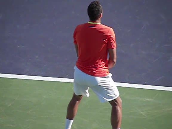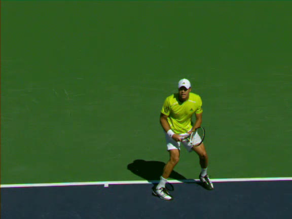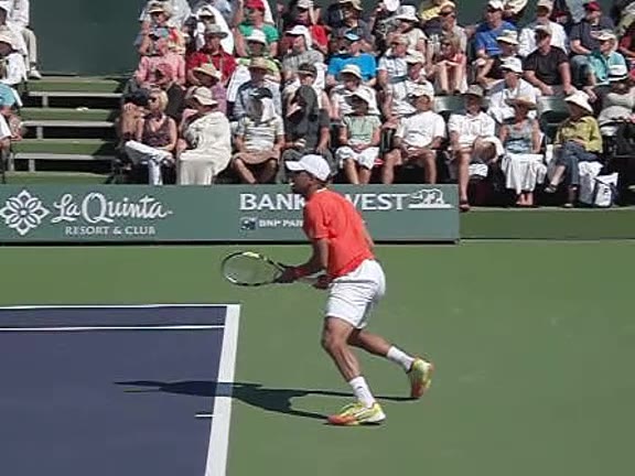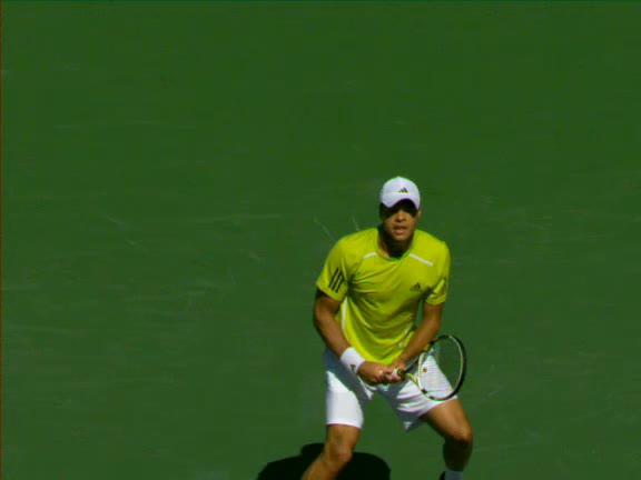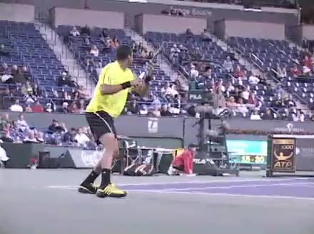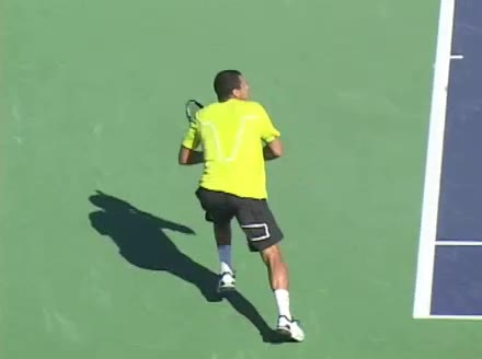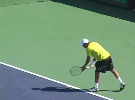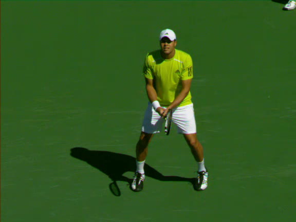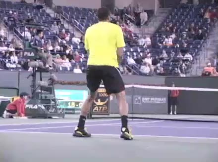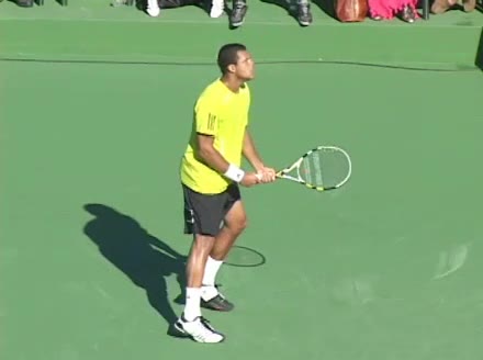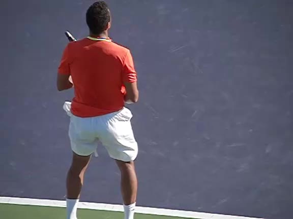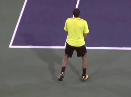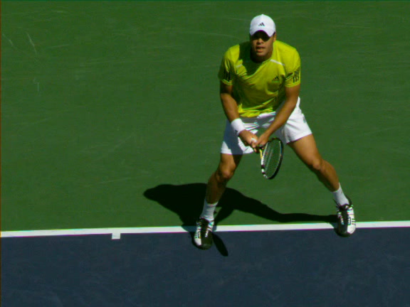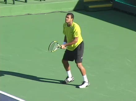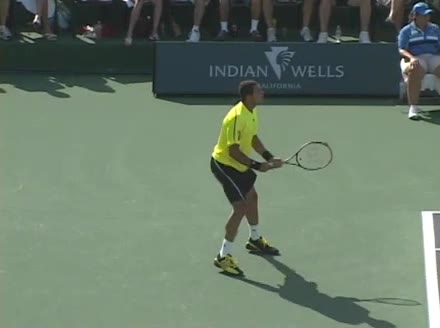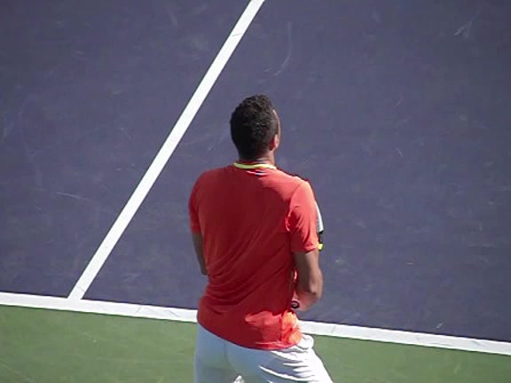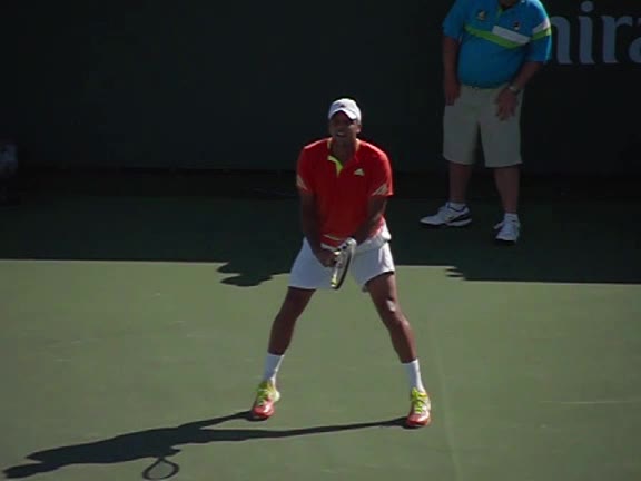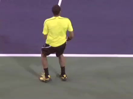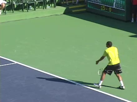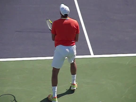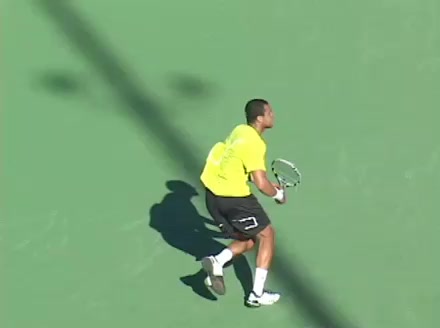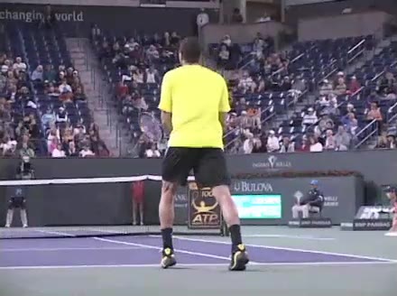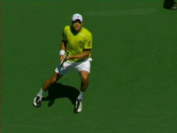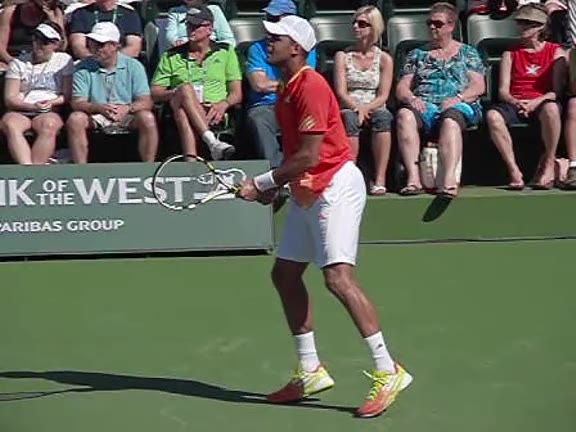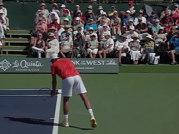 Jo-Wilfried Tsonga's second serve from the deuce side, filmed from the side. After contact he drives his weight into the court and quickly brings his non-hitting hand back toward his torso as he lands in a balanced position ready for the next shot.