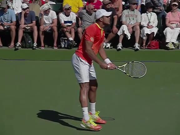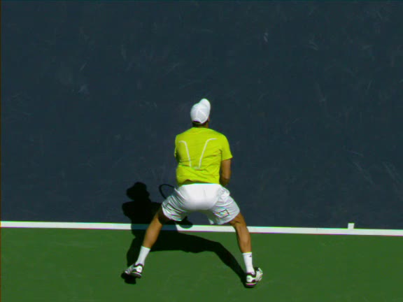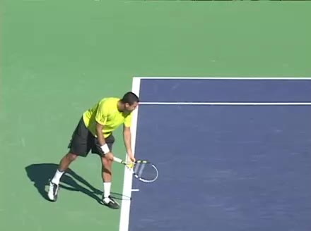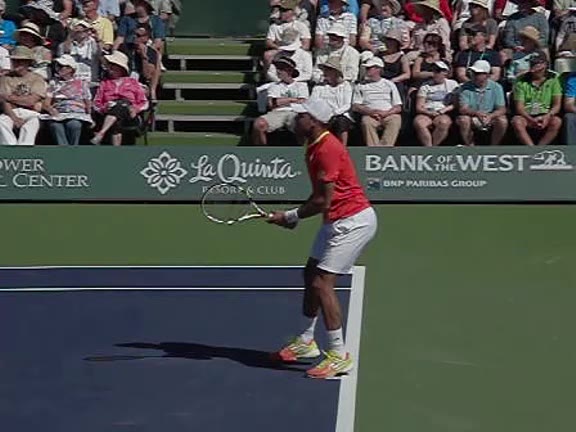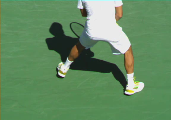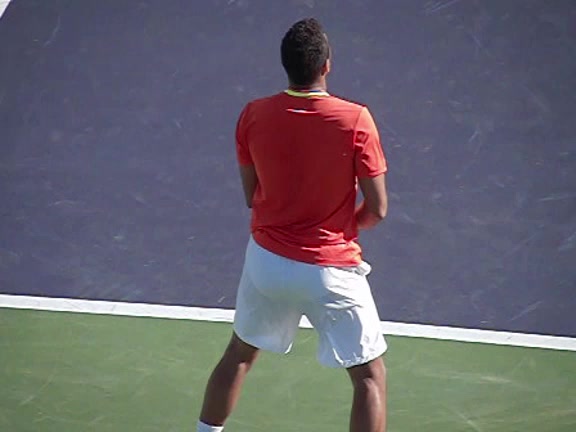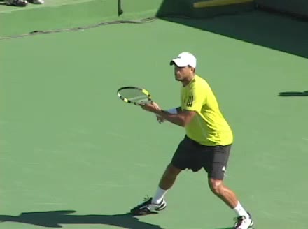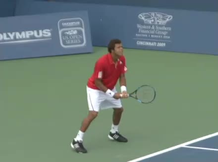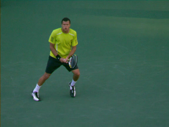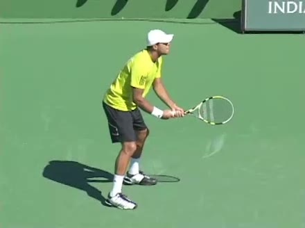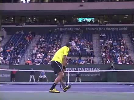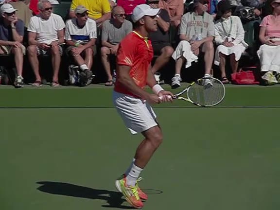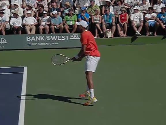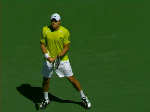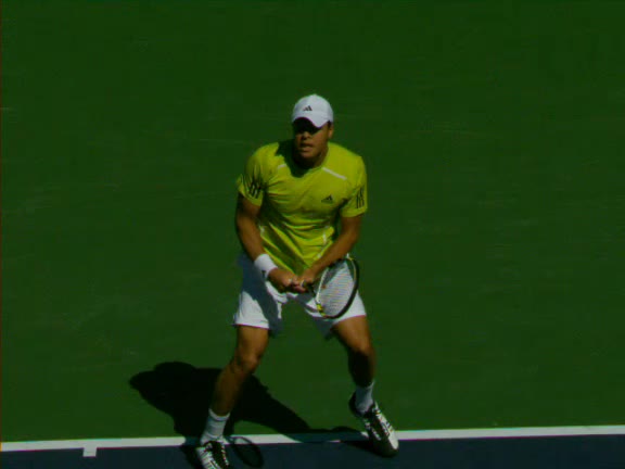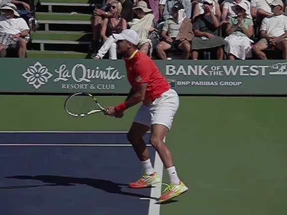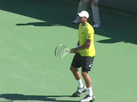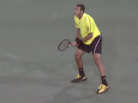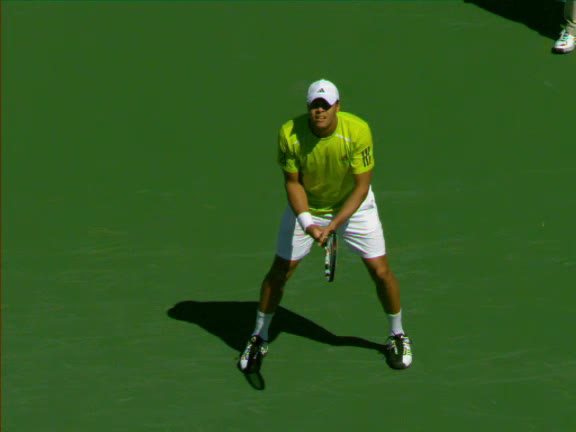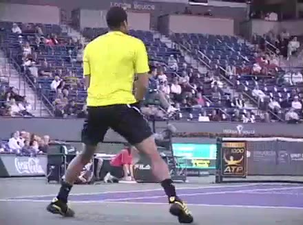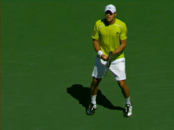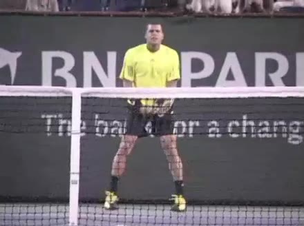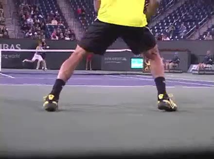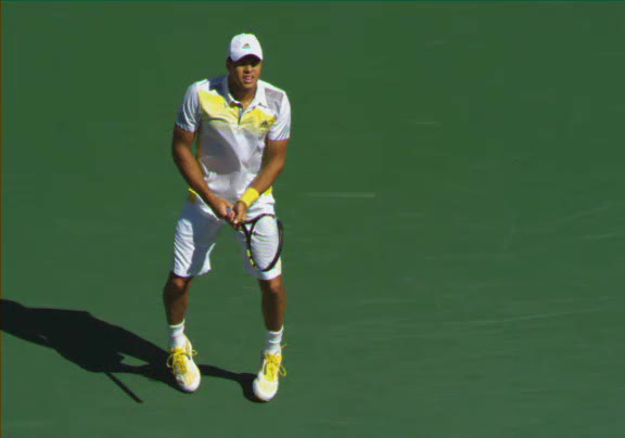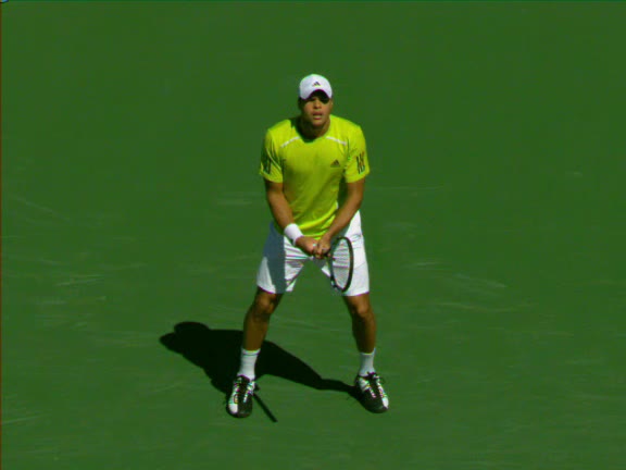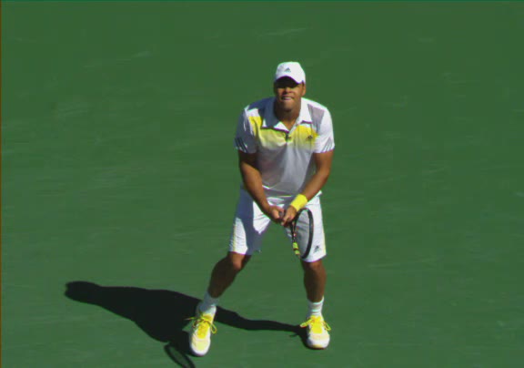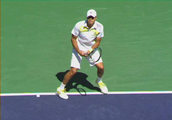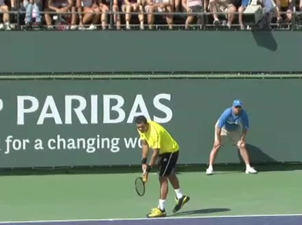 Jo-Wilfried Tsonga's second serve from the deuce side, filmed from the side. After contact he drives his weight into the court and quickly brings his non-hitting hand back toward his torso as he lands in a balanced position ready for the next shot.