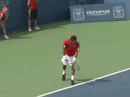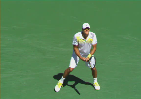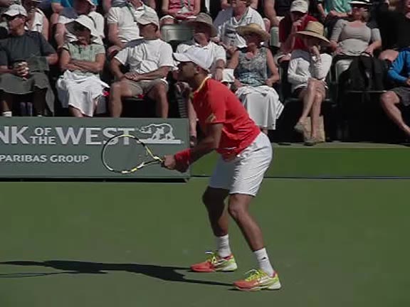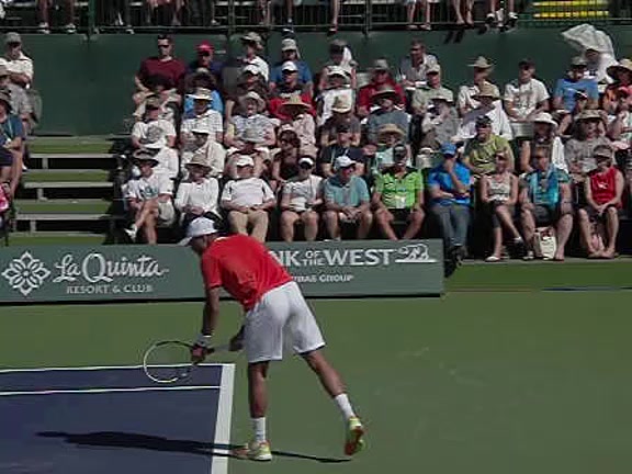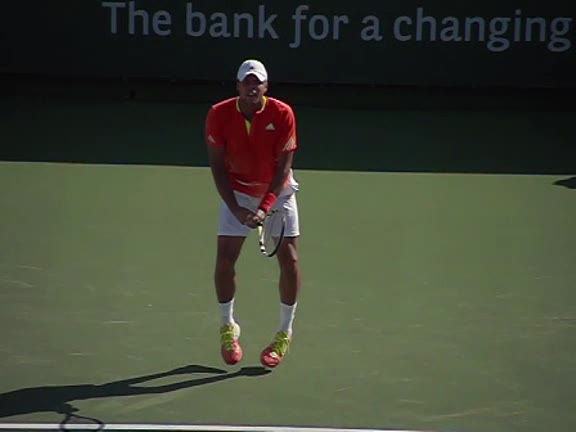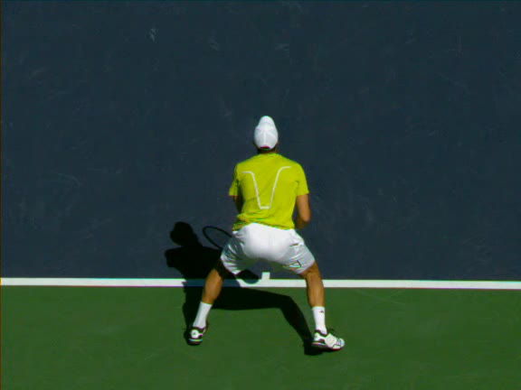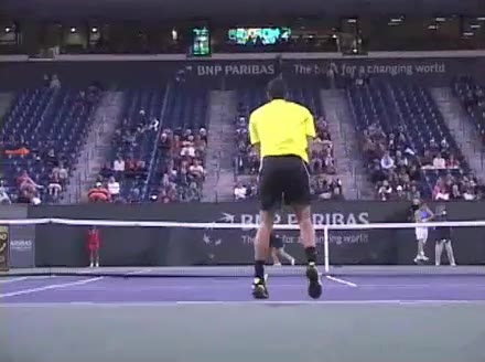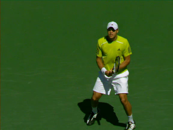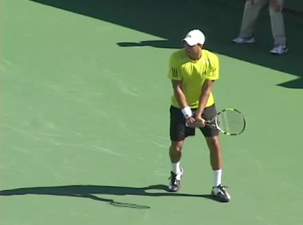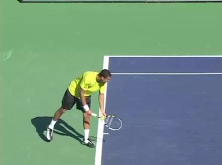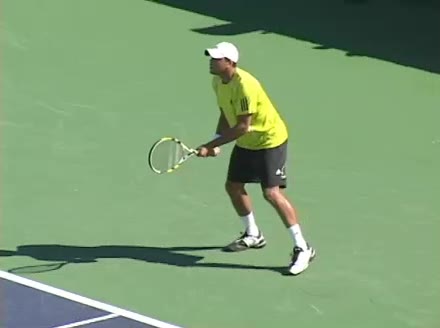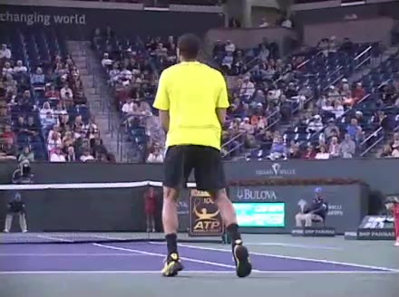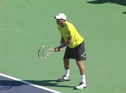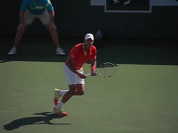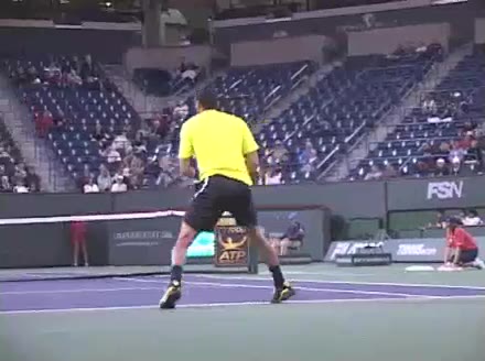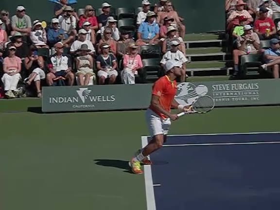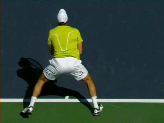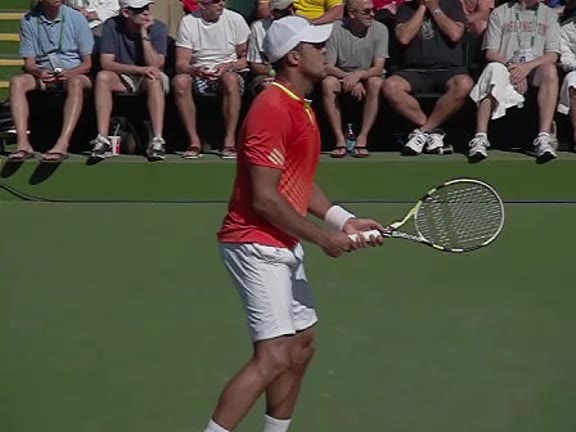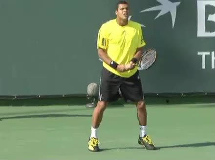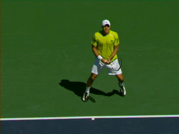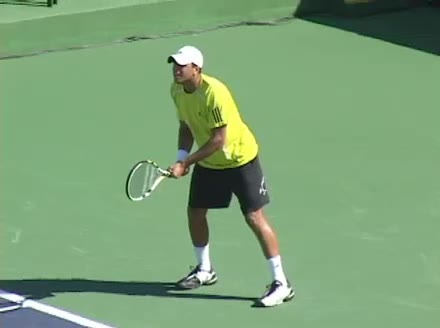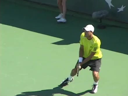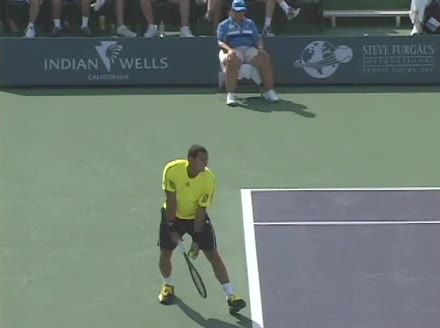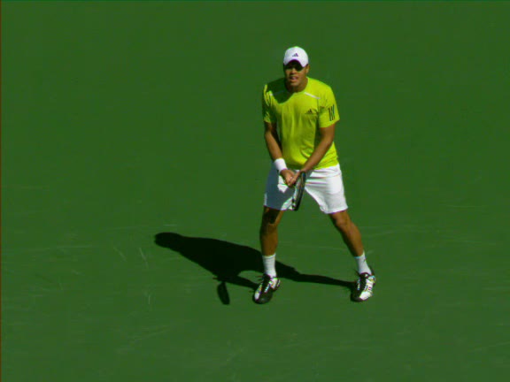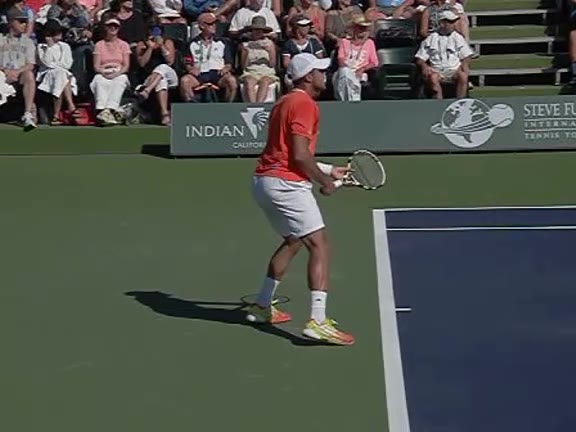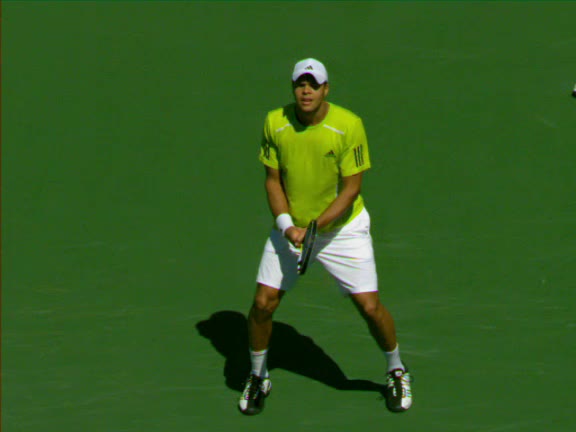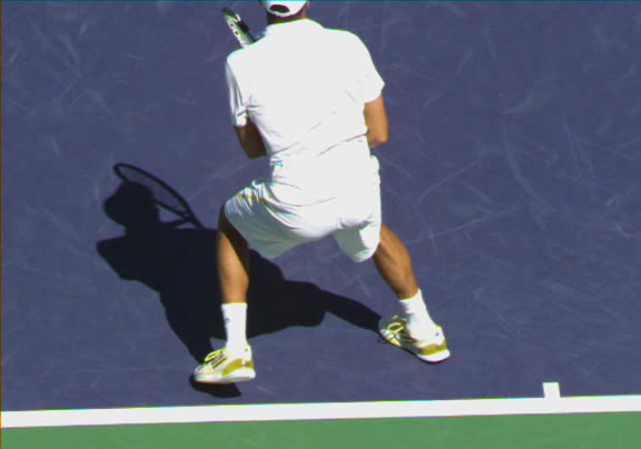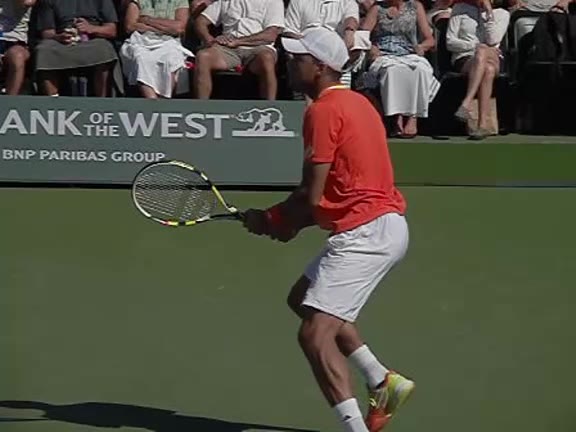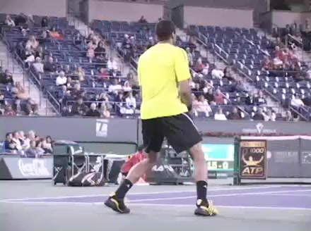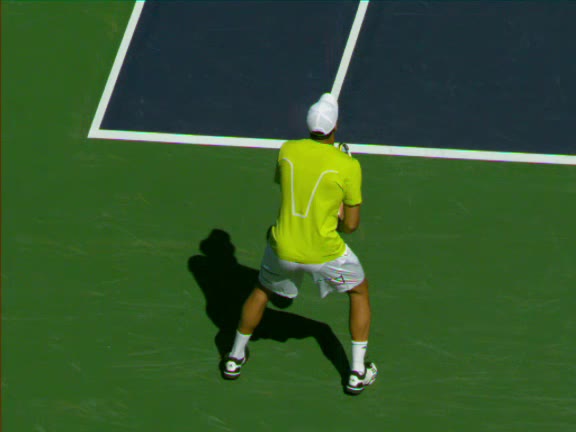 Jo-Wilfried Tsonga's second serve from the deuce side, filmed from the side. After contact he drives his weight into the court and quickly brings his non-hitting hand back toward his torso as he lands in a balanced position ready for the next shot.