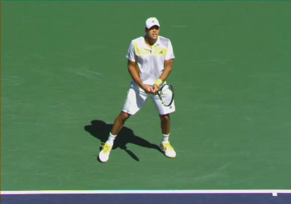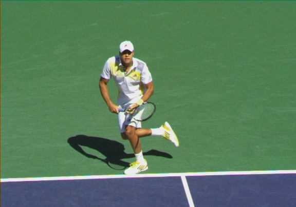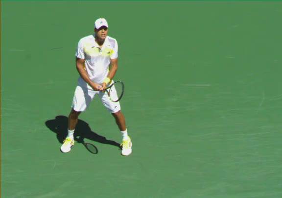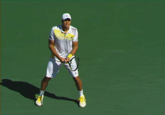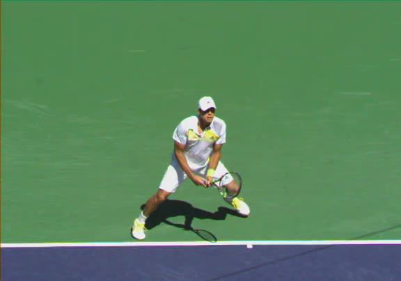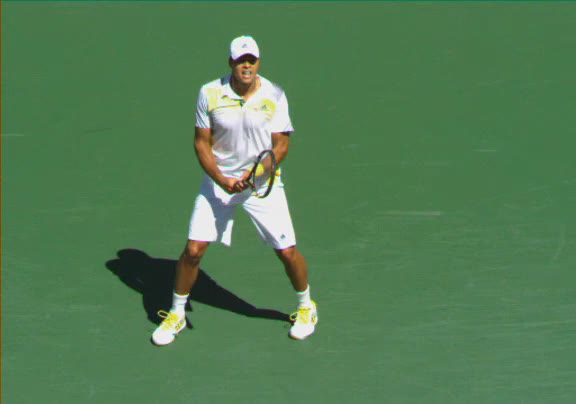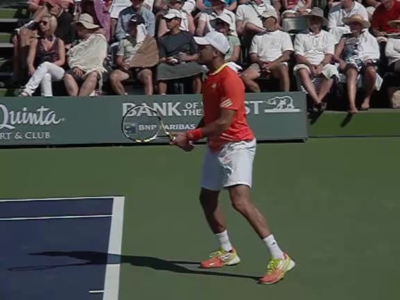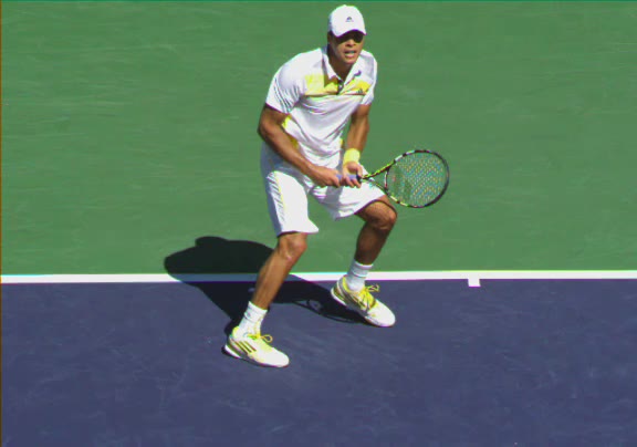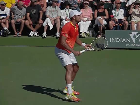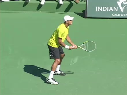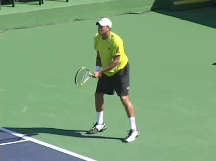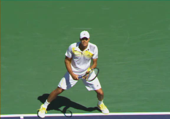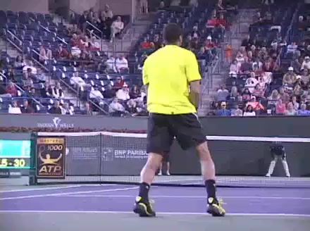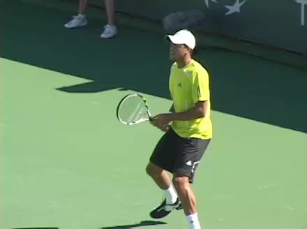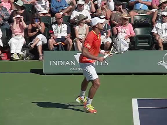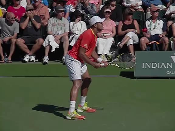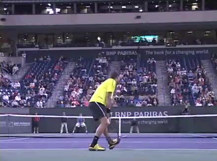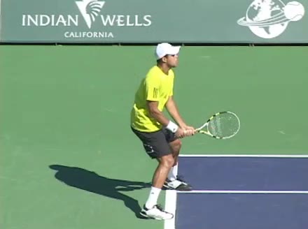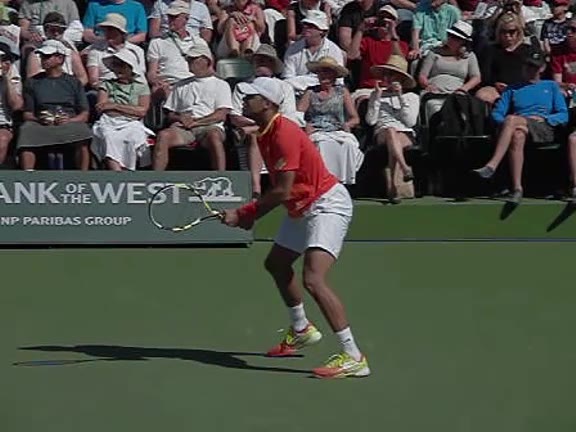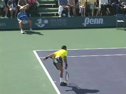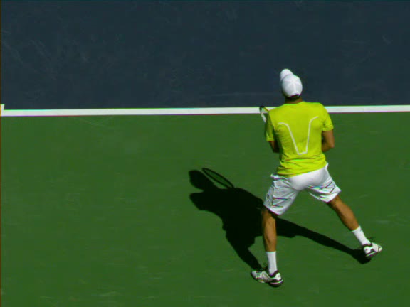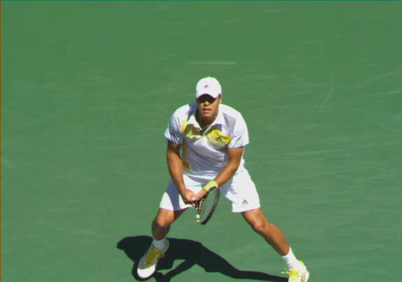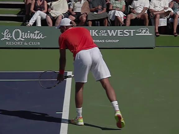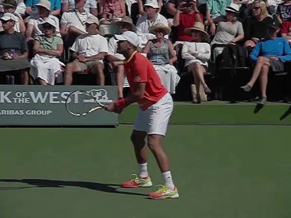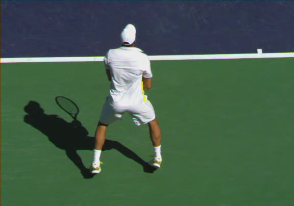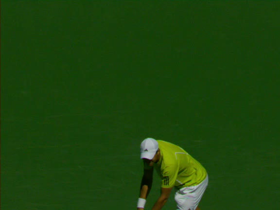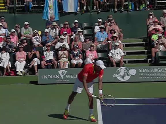 Jo-Wilfried Tsonga's second serve from the deuce side, filmed from the side. After contact he drives his weight into the court and quickly brings his non-hitting hand back toward his torso as he lands in a balanced position ready for the next shot.