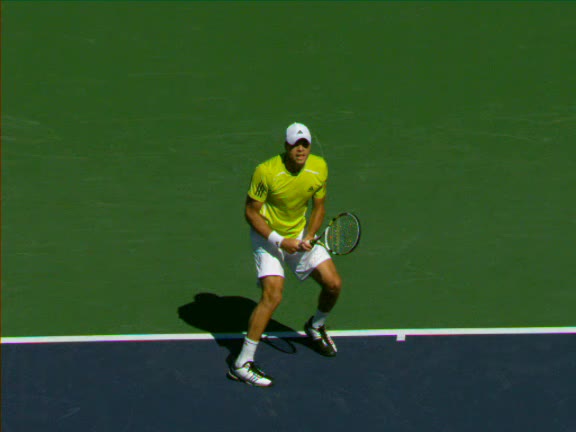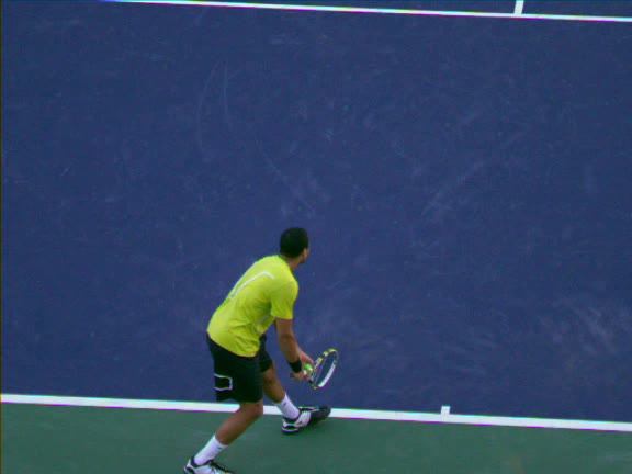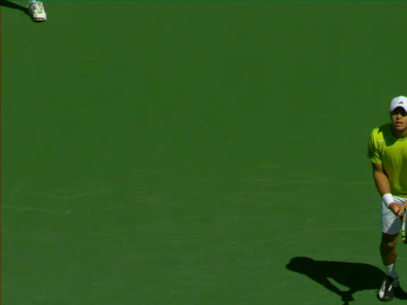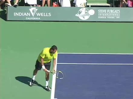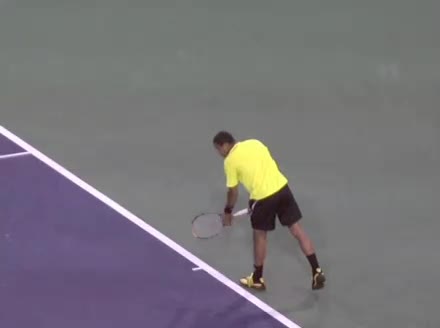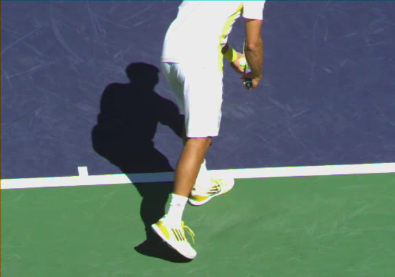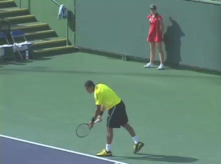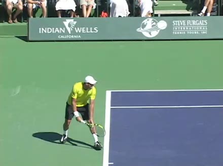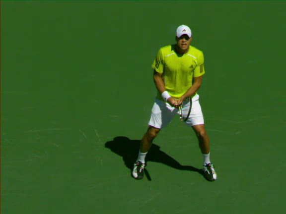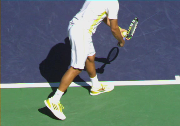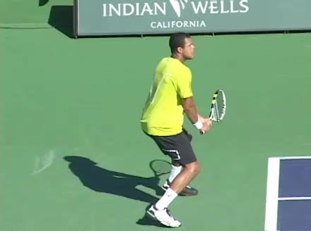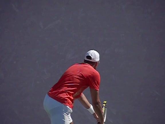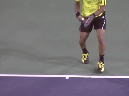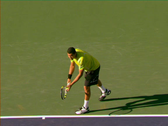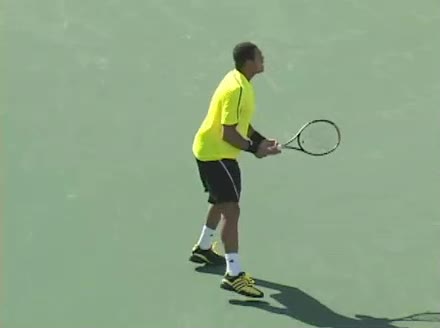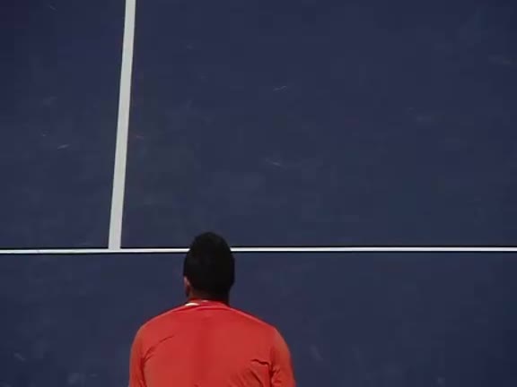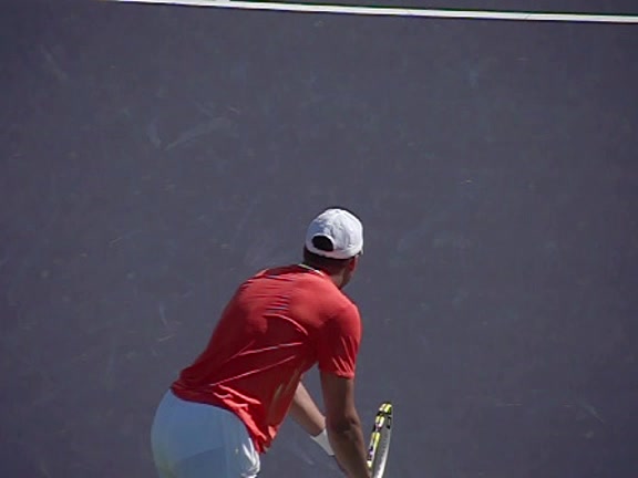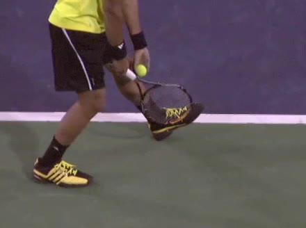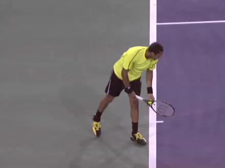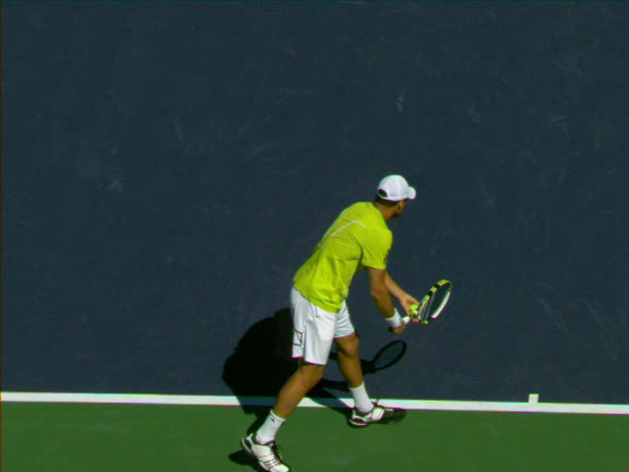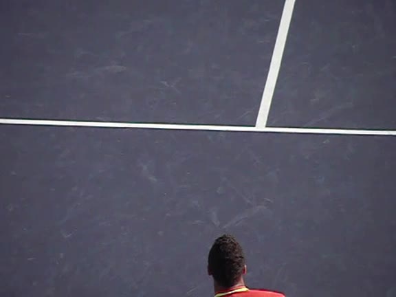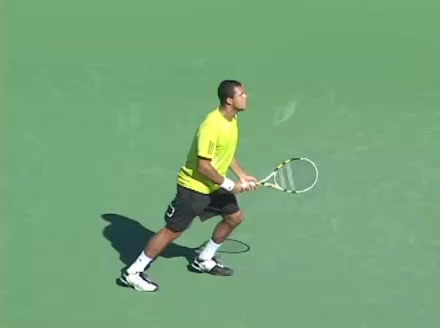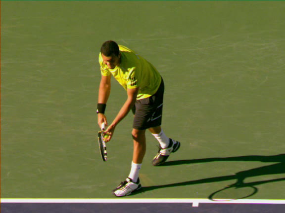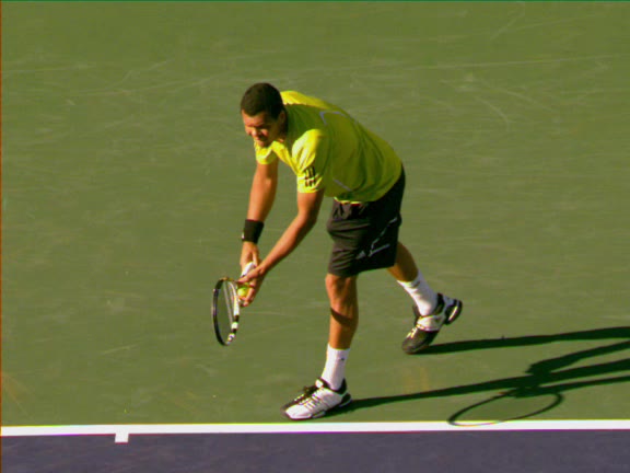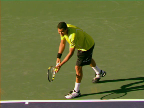 Jo-Wilfried Tsonga's second serve from the deuce side, filmed from the side. His continental grip is easy to see here, with a loose wrist that pronates aggressively through contact to add spin and safety to the serve.