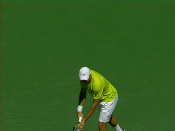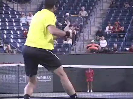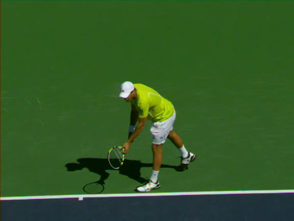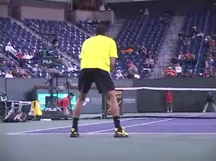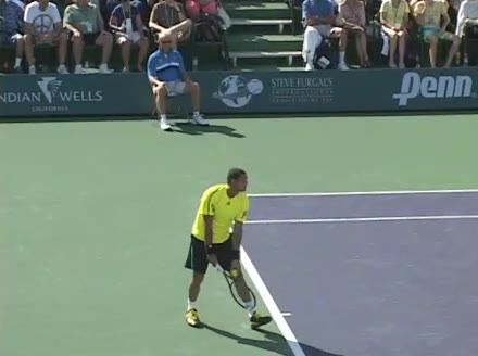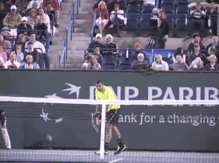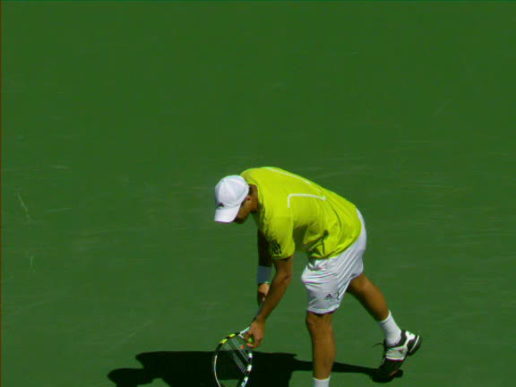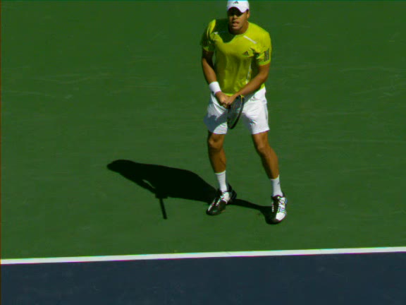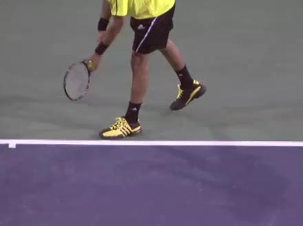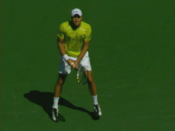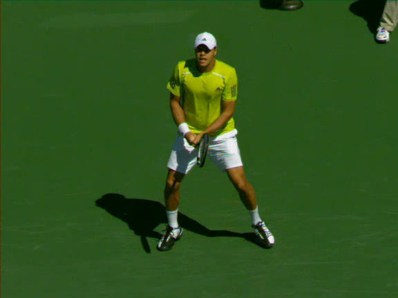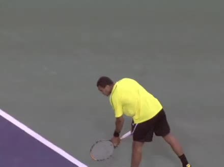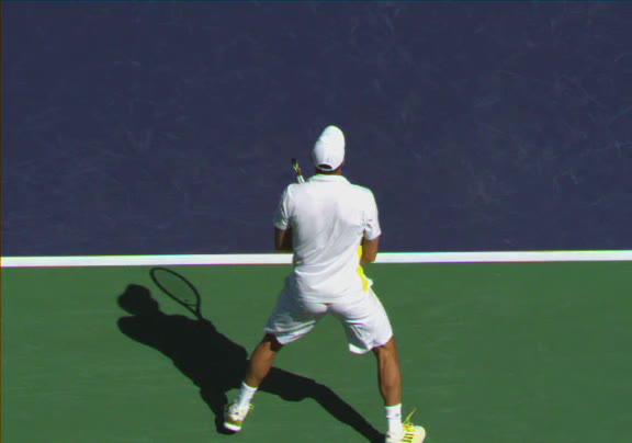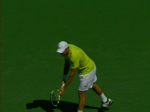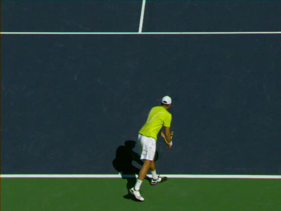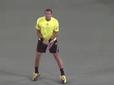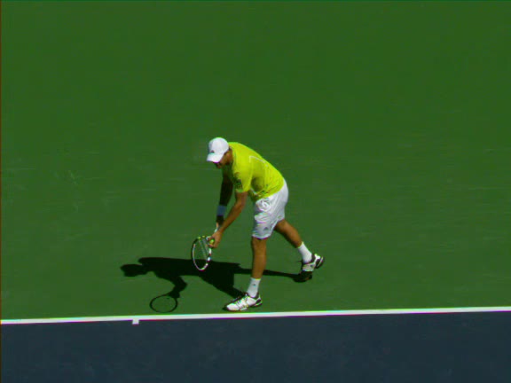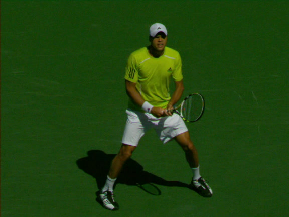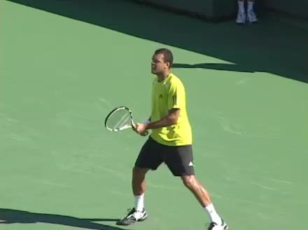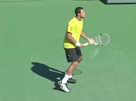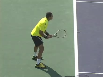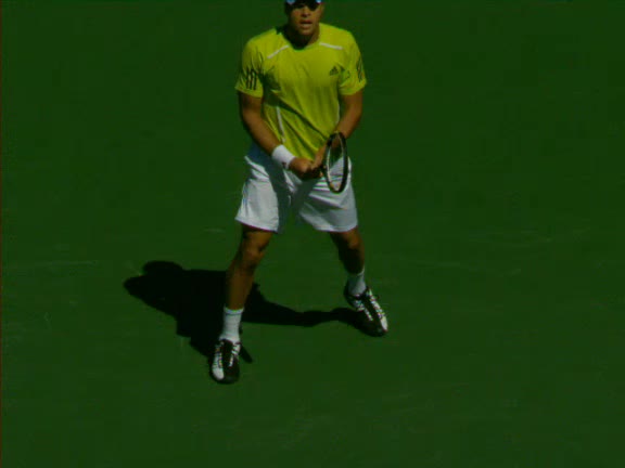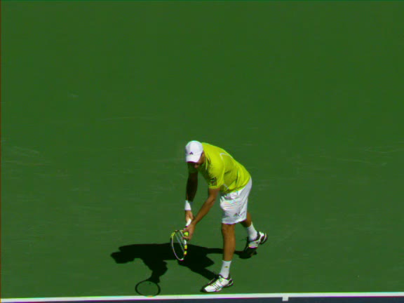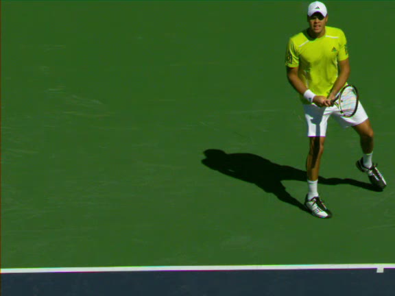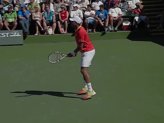 Jo-Wilfried Tsonga's second serve from the deuce side, filmed from the side. His continental grip is easy to see here, with a loose wrist that pronates aggressively through contact to add spin and safety to the serve.