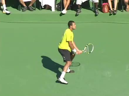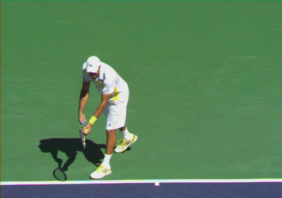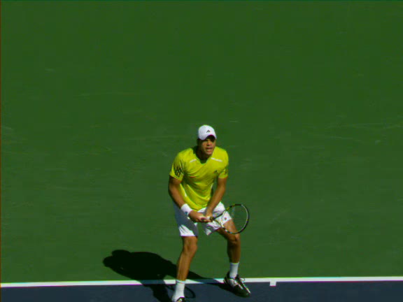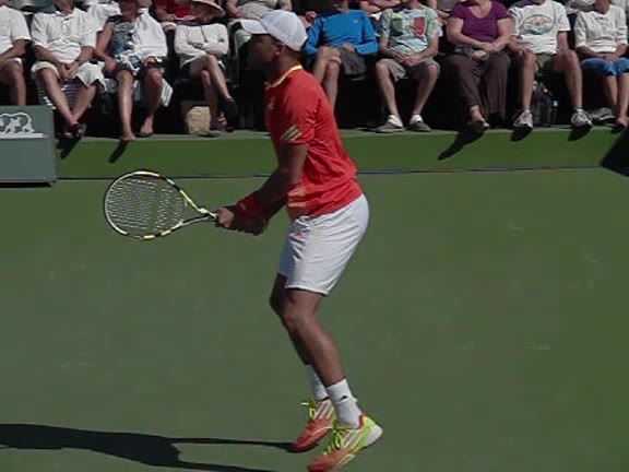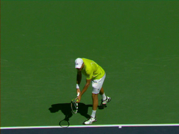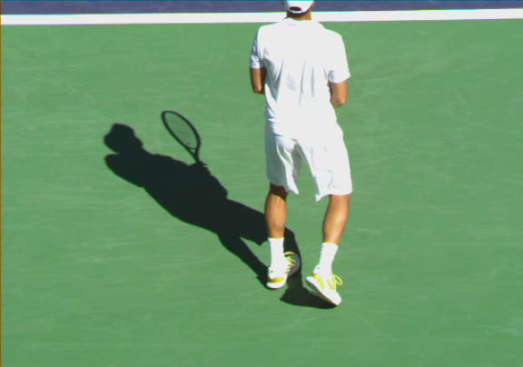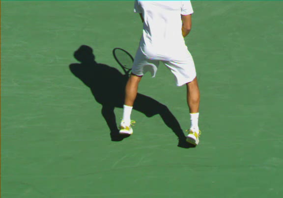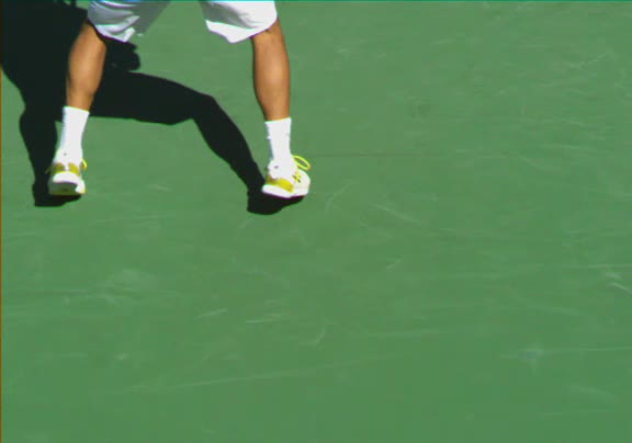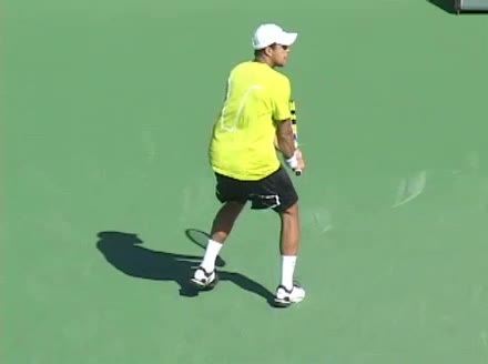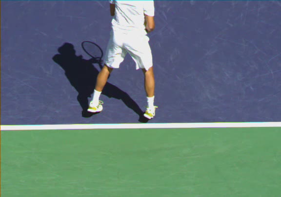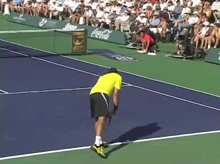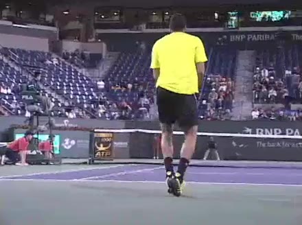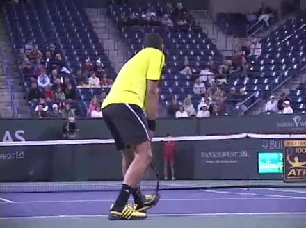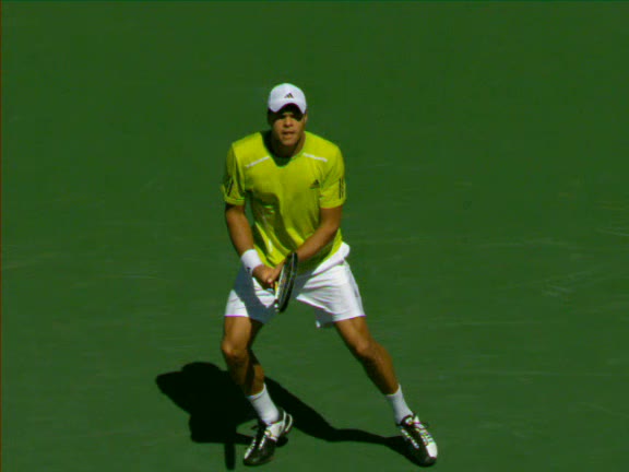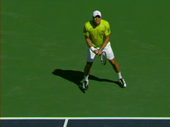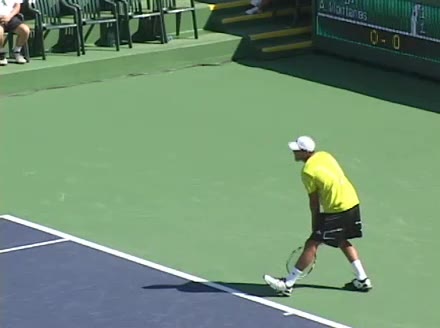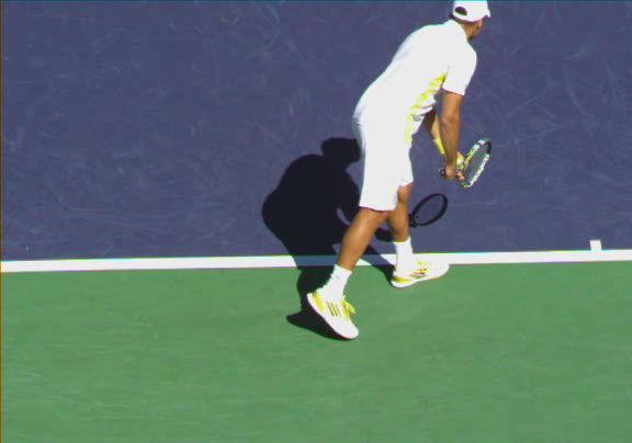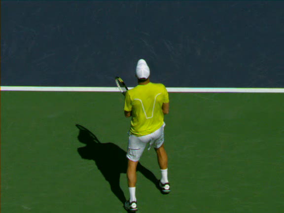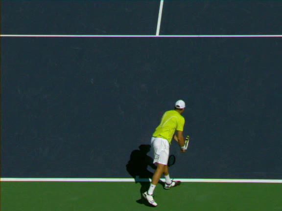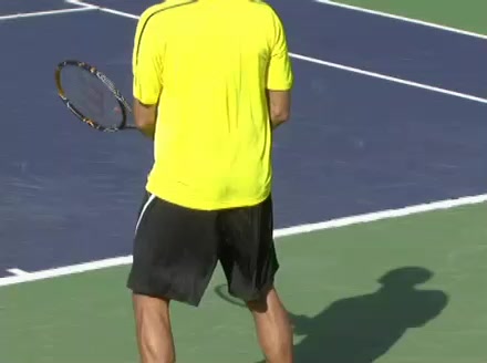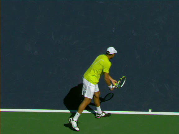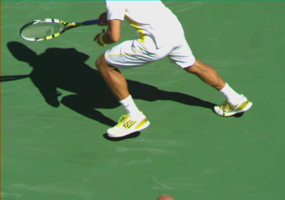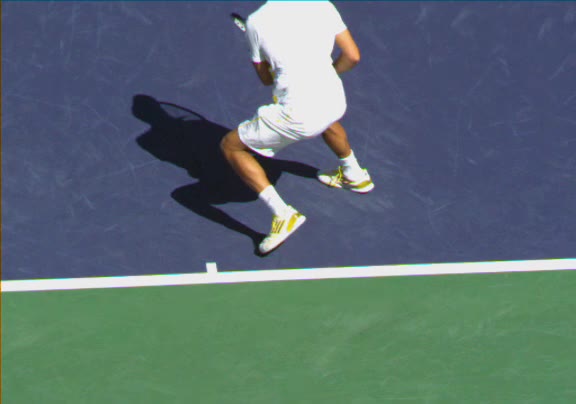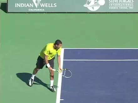 Jo-Wilfried Tsonga's second serve from the deuce side, filmed from the side. His continental grip is easy to see here, with a loose wrist that pronates aggressively through contact to add spin and safety to the serve.
