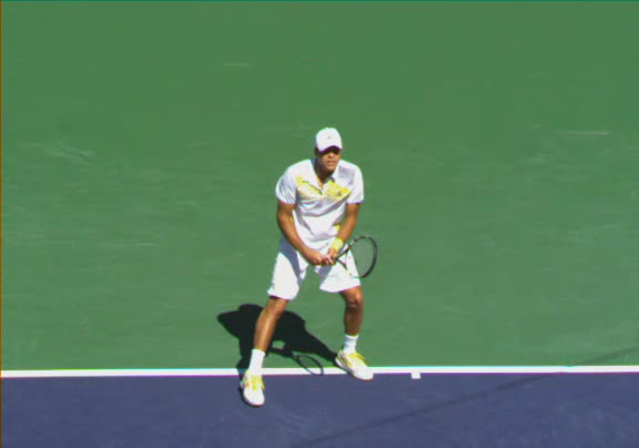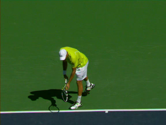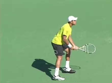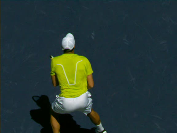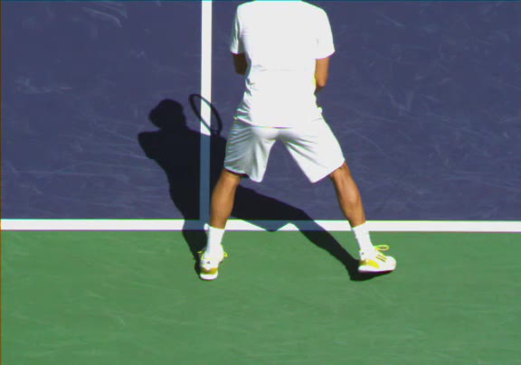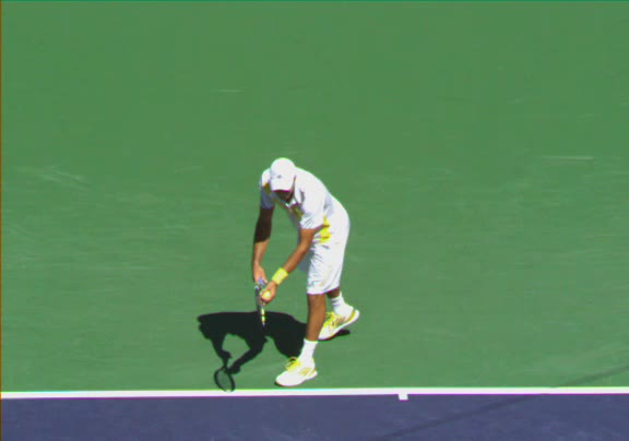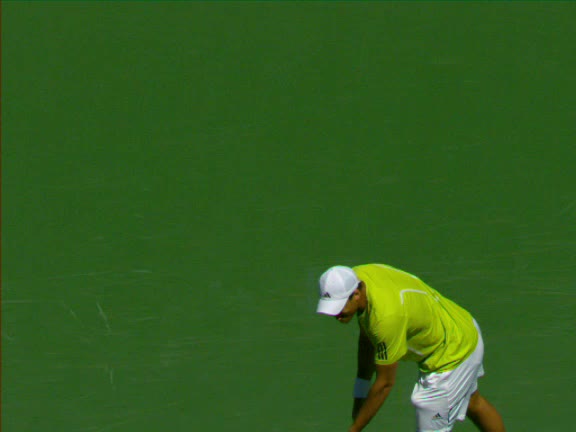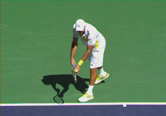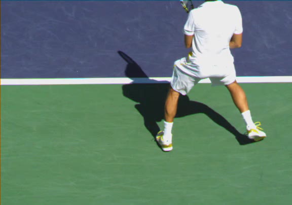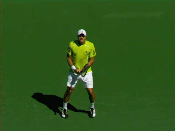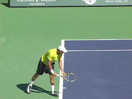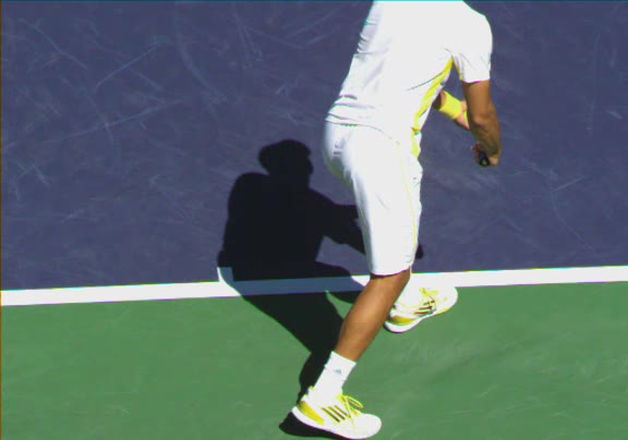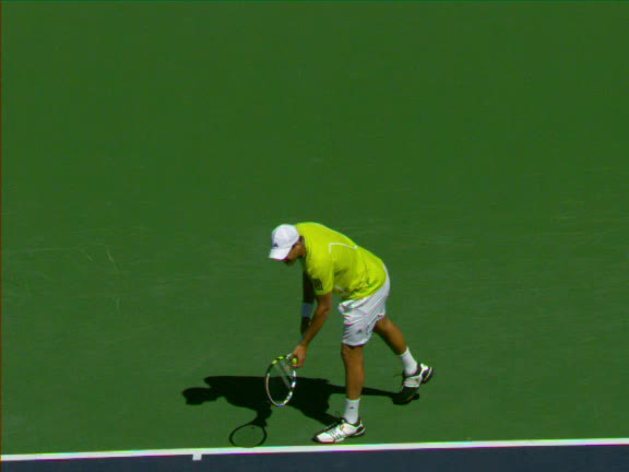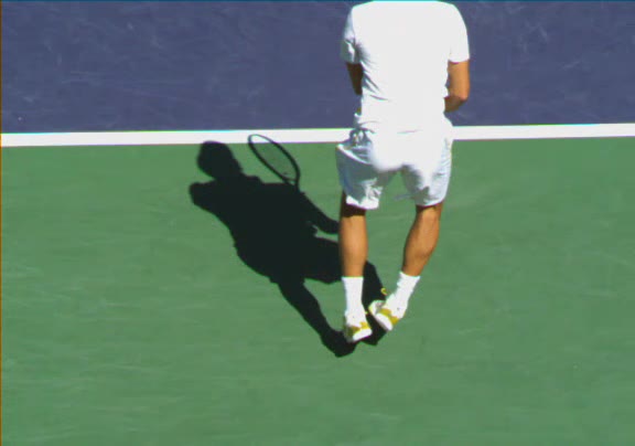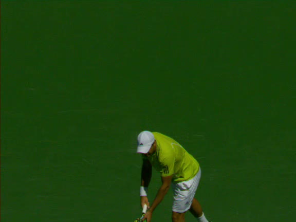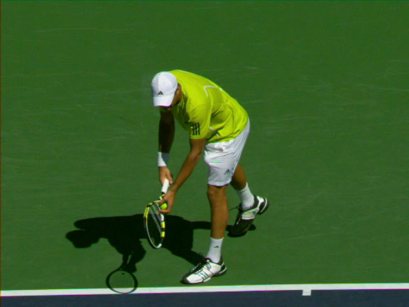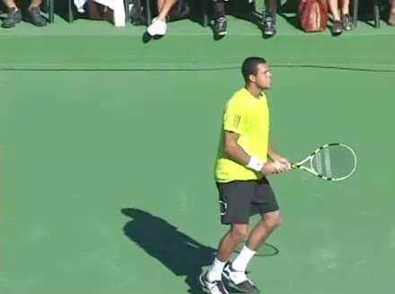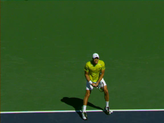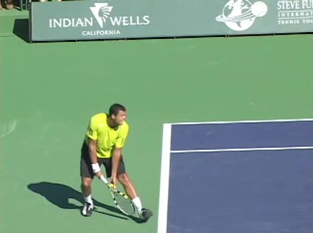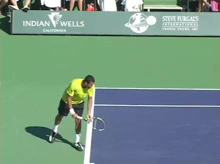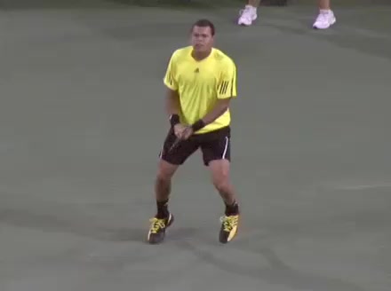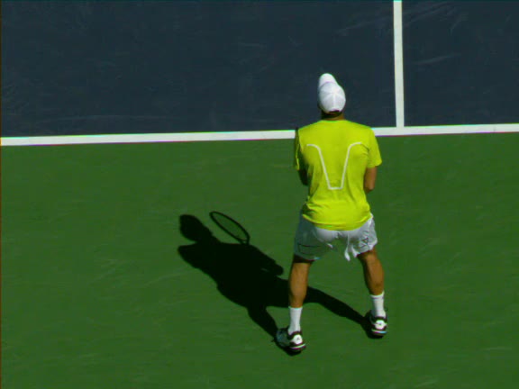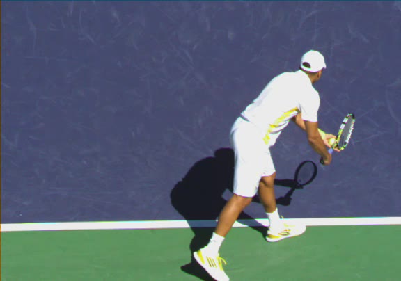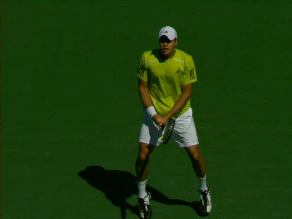 Jo-Wilfried Tsonga's second serve from the deuce side, filmed from the side. His continental grip is easy to see here, with a loose wrist that pronates aggressively through contact to add spin and safety to the serve.