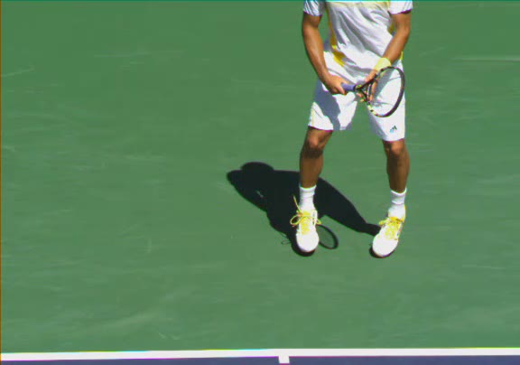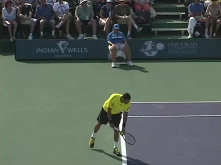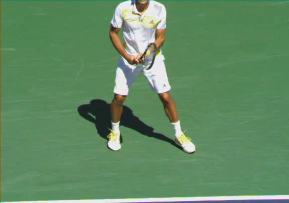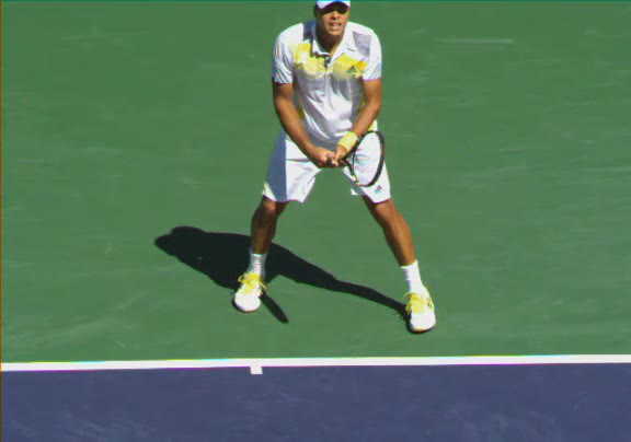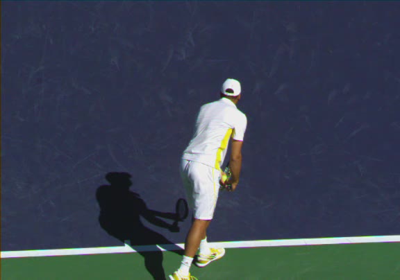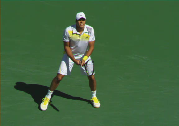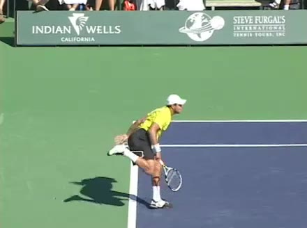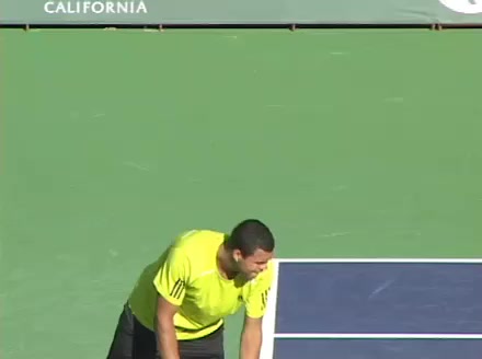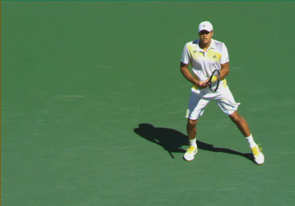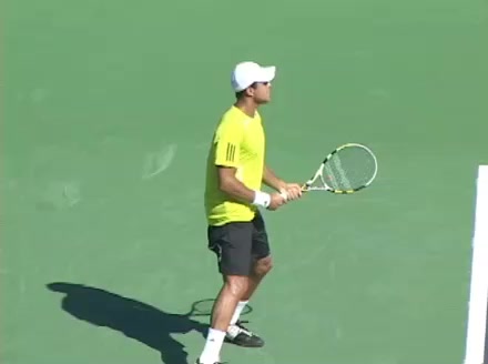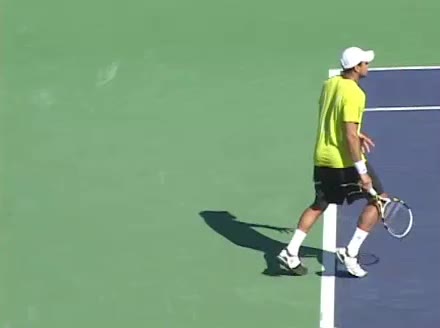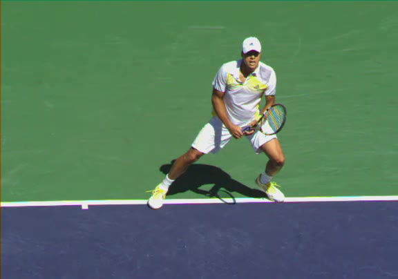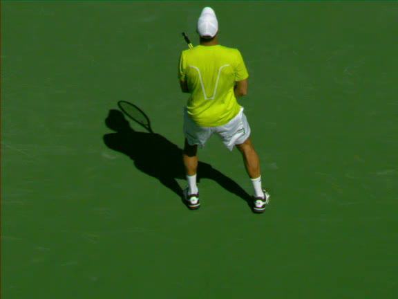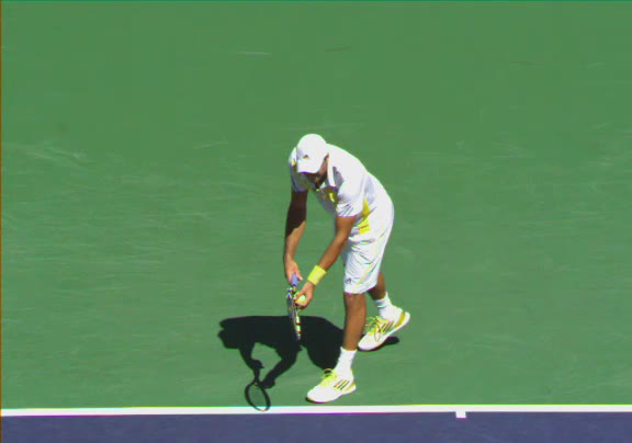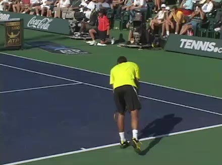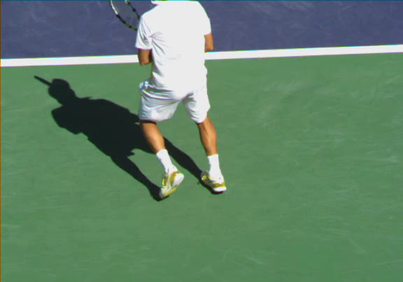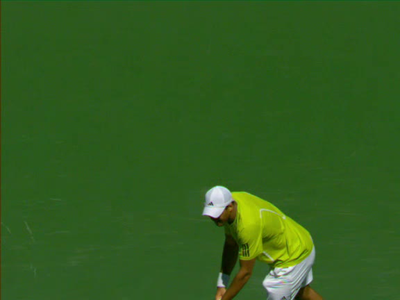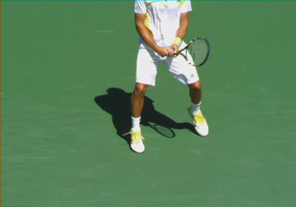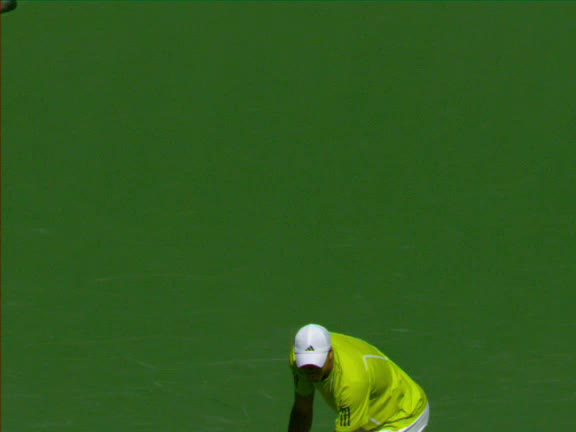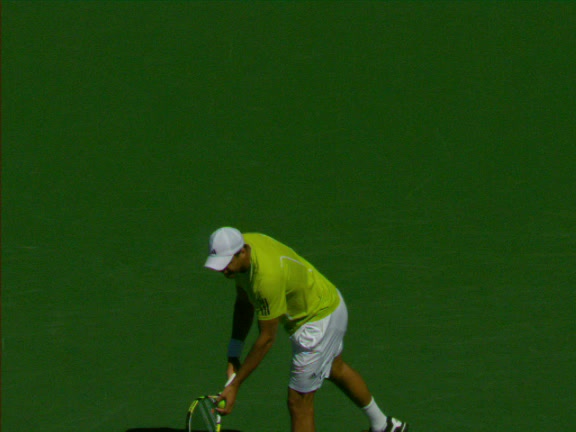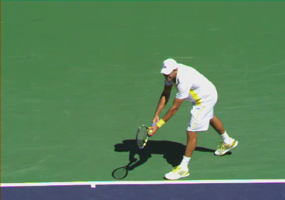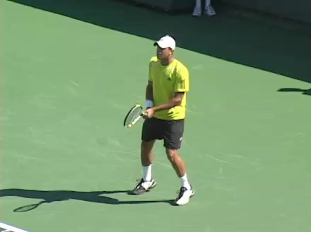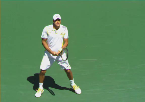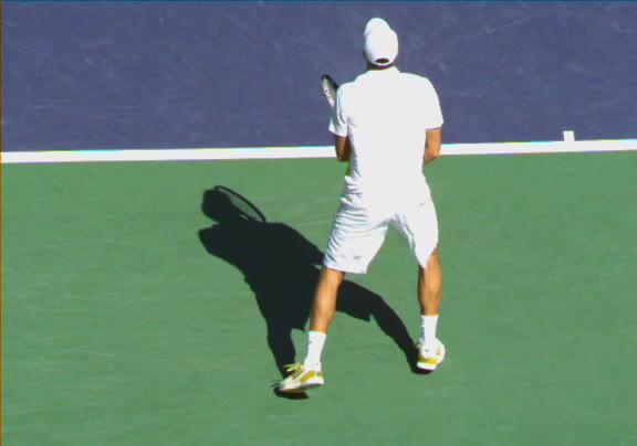 Jo-Wilfried Tsonga's second serve from the deuce side, filmed from the side. His continental grip is easy to see here, with a loose wrist that pronates aggressively through contact to add spin and safety to the serve.