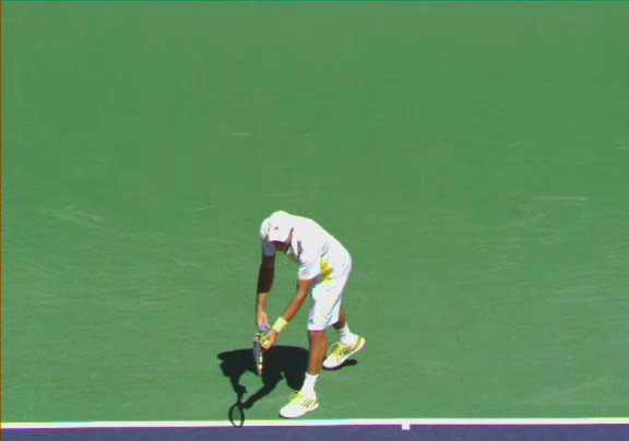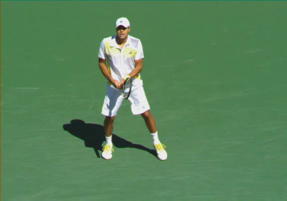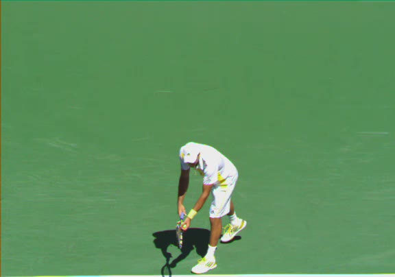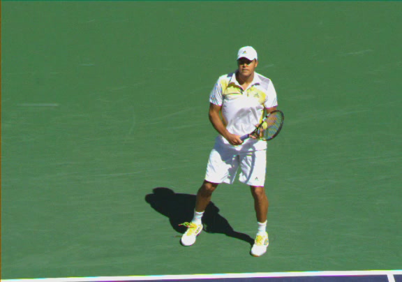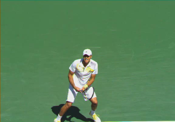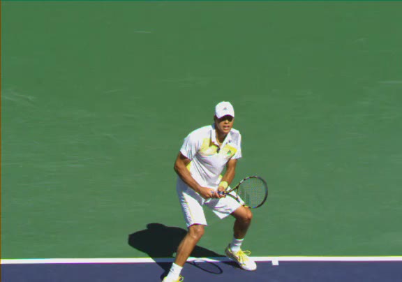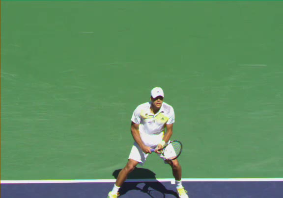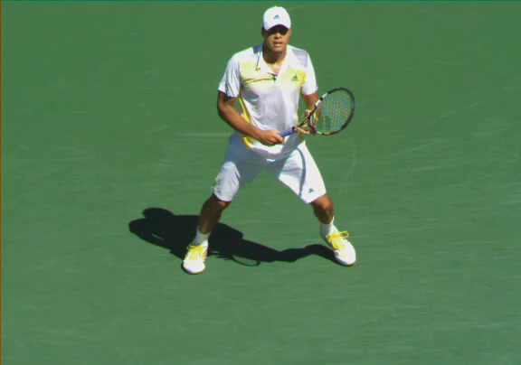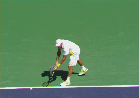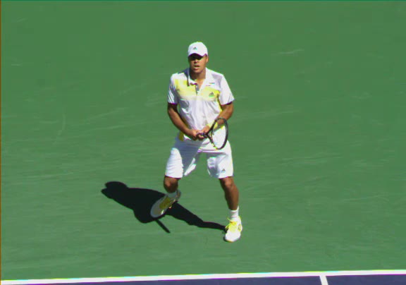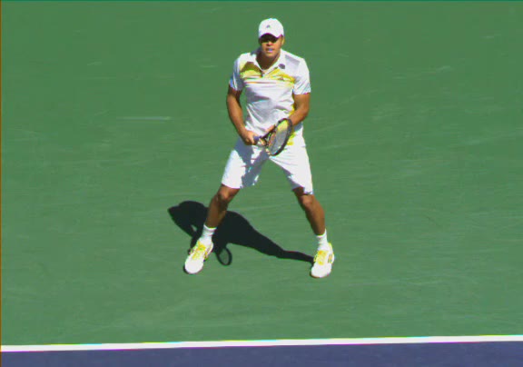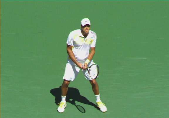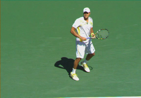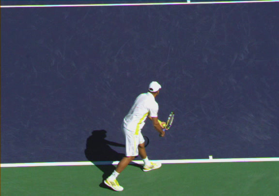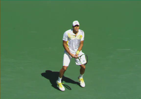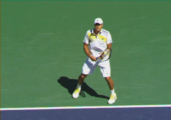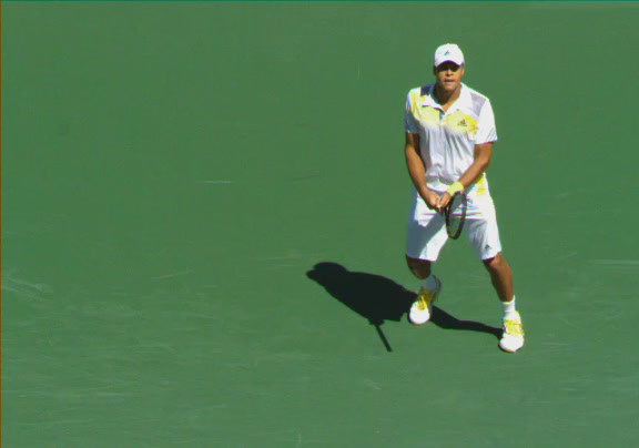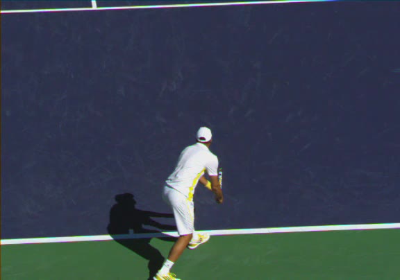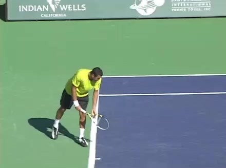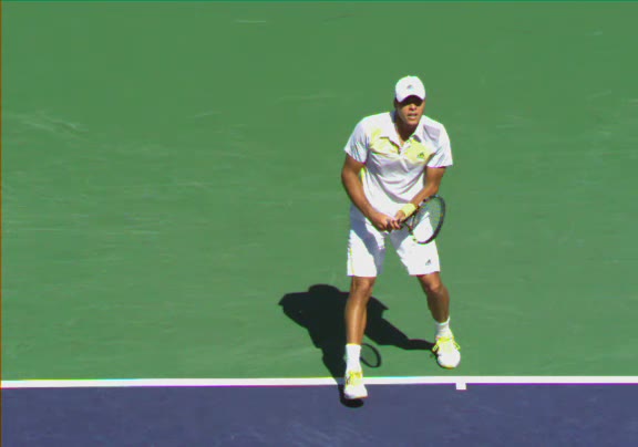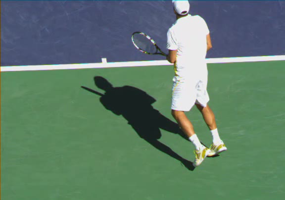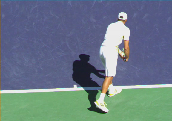 Jo-Wilfried Tsonga's second serve from the deuce side, filmed from the side. His continental grip is easy to see here, with a loose wrist that pronates aggressively through contact to add spin and safety to the serve.
