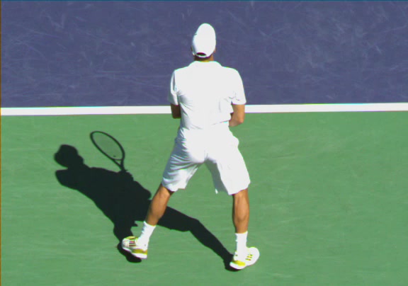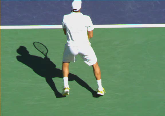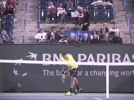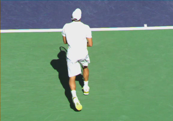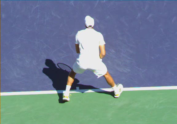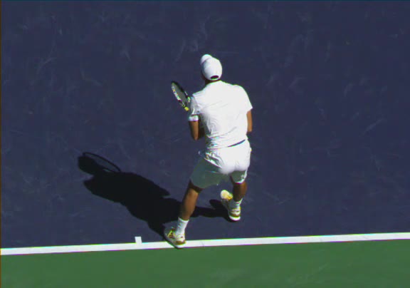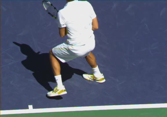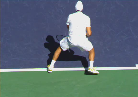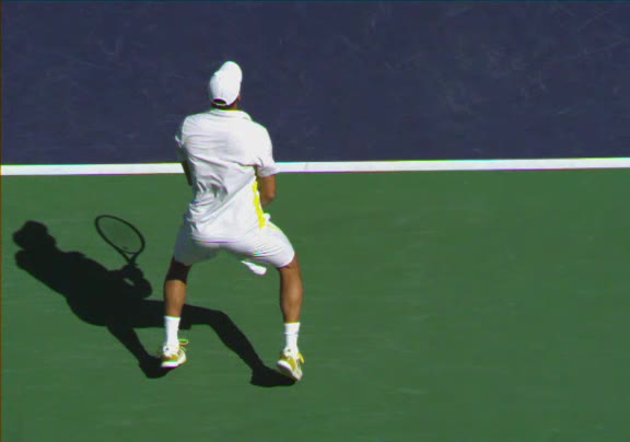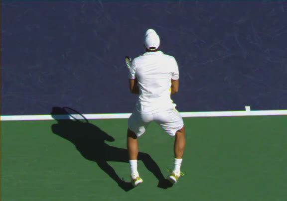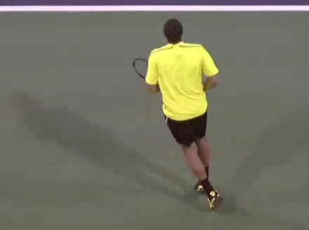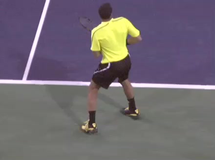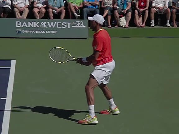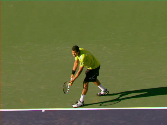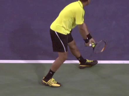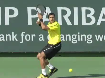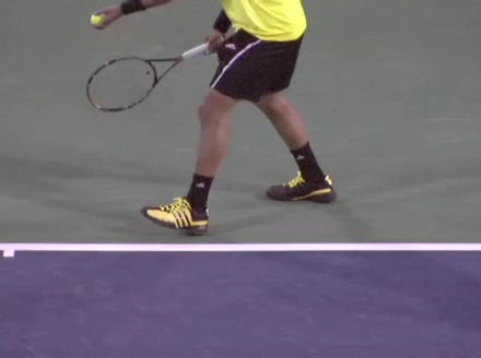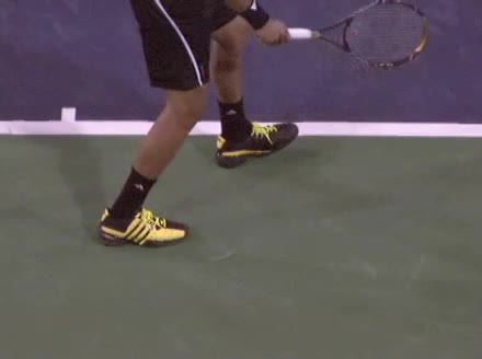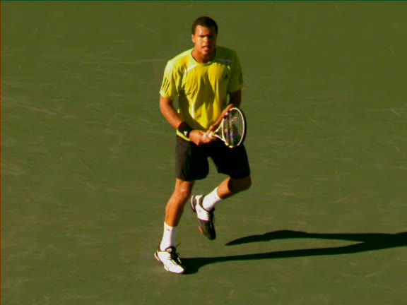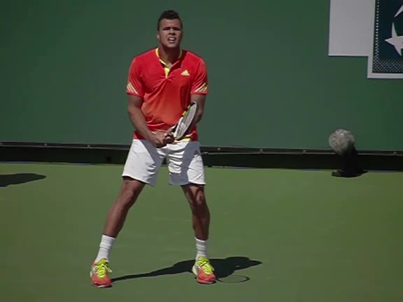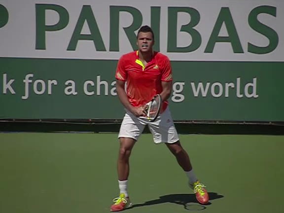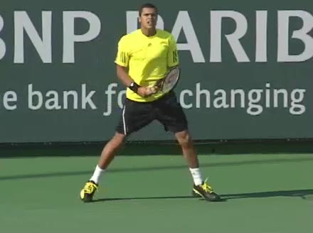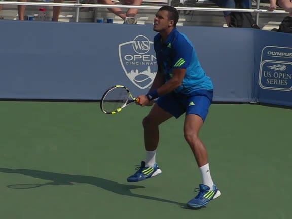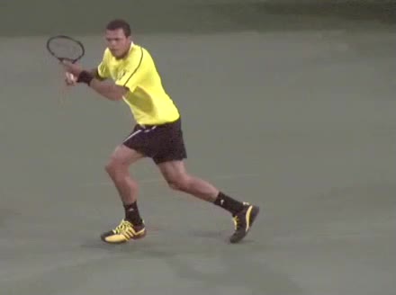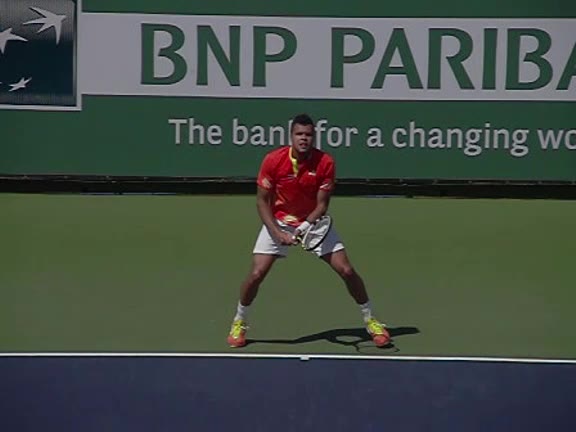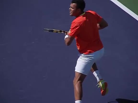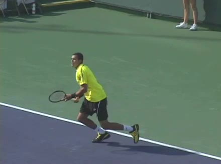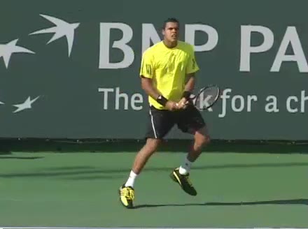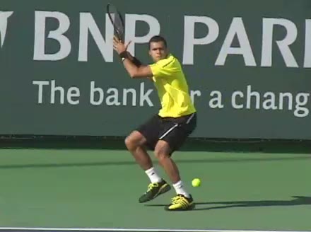 Jo-Wilfried Tsonga's running forehand slice from a neutral court position, filmed from the front at 500 fps. After contact, his racquet finishes out in front with the non-hitting hand extending back for counterbalance as he transfers his weight forward into a compact recovery stance.