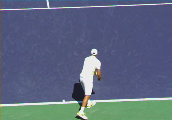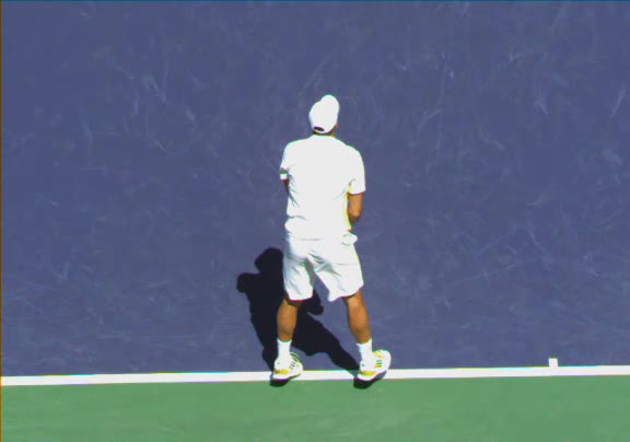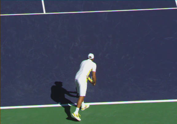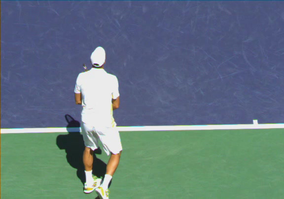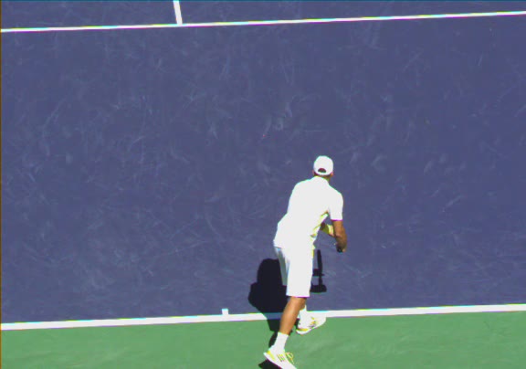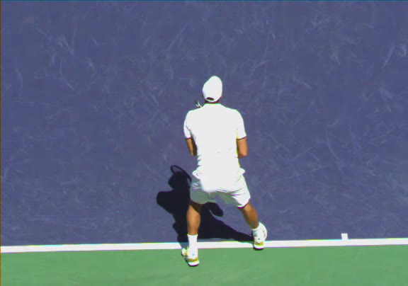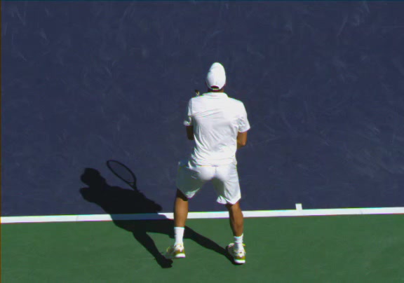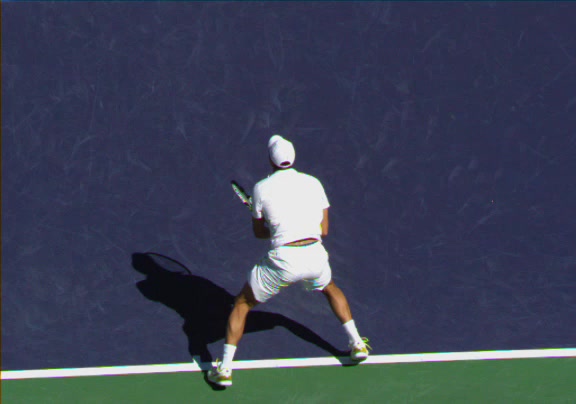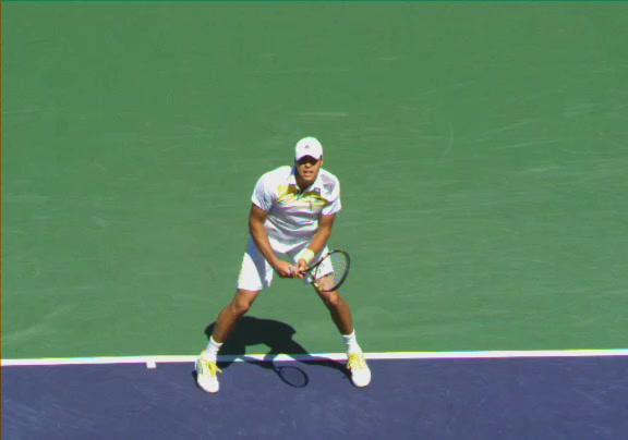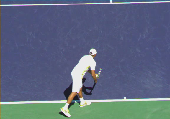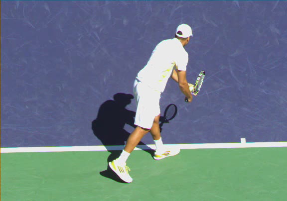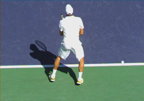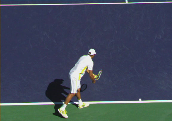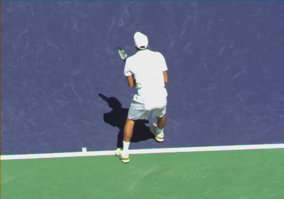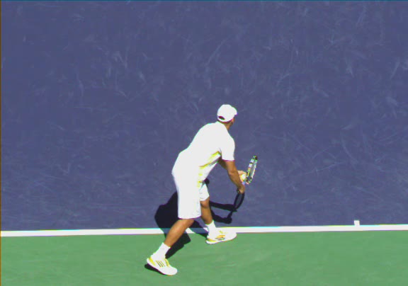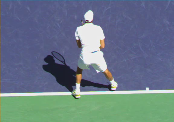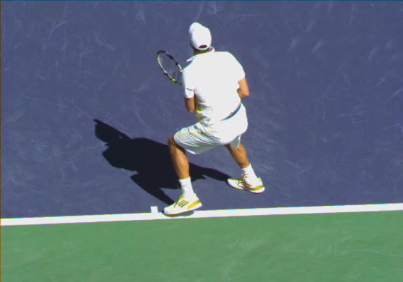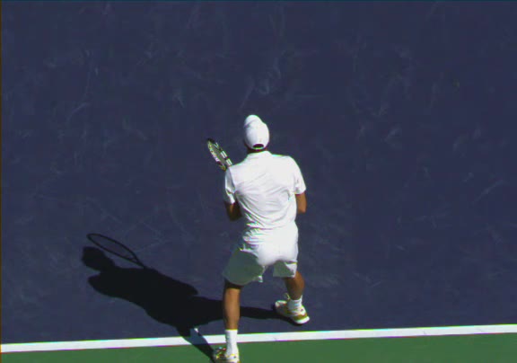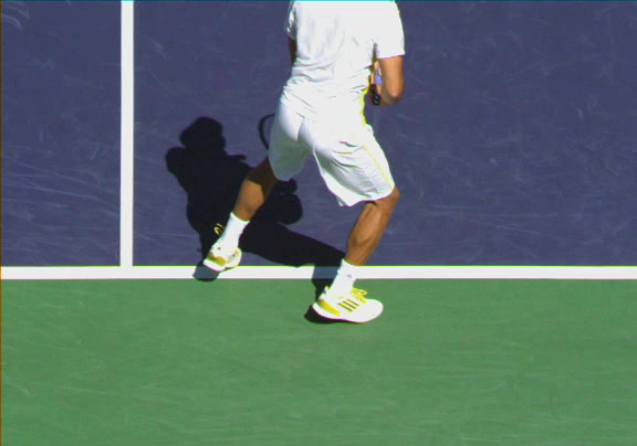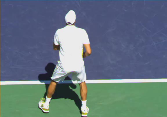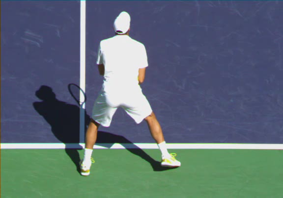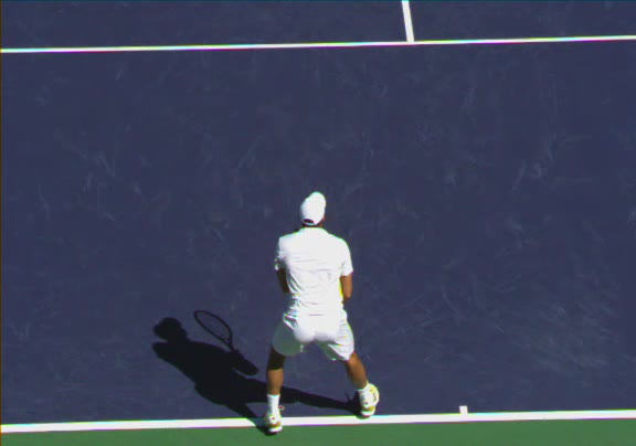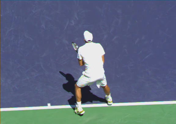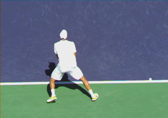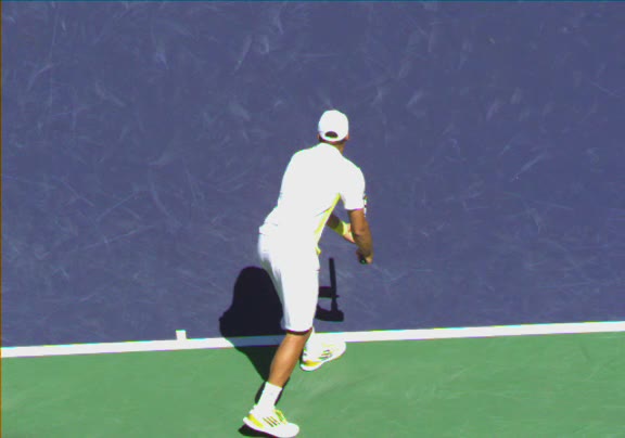 Jo-Wilfried Tsonga's running forehand slice from a neutral court position, filmed from the front at 500 fps. After contact, his racquet finishes out in front with the non-hitting hand extending back for counterbalance as he transfers his weight forward into a compact recovery stance.