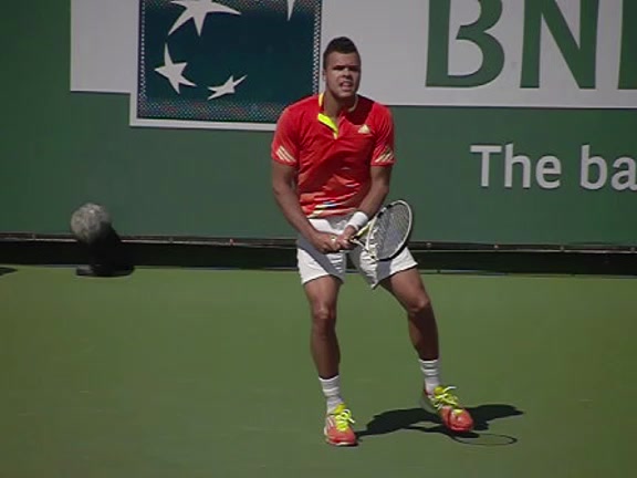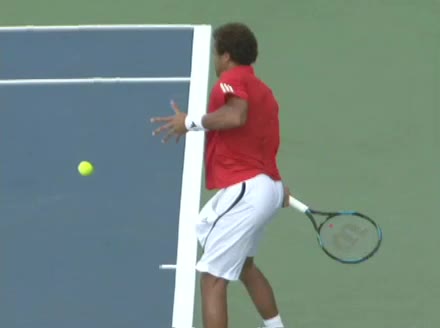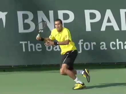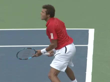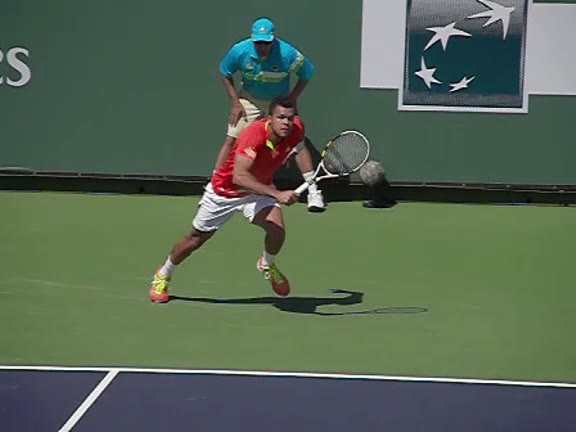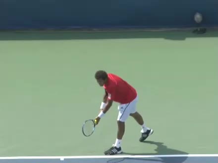 Jo-Wilfried Tsonga's running backhand slice from the front, filmed from a front angle at 240 fps. His follow-through extends out in front with the racket face slightly open while his non-hitting arm counterbalances behind him before he regathers into a neutral ready position.