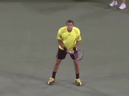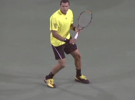 Jo-Wilfried Tsonga's backhand slice from a short court position, filmed from the front at 240 fps. His hips stay relatively closed while his knees maintain a moderate bend, with the front leg bracing and the back leg lightly loading to support the slicing motion.