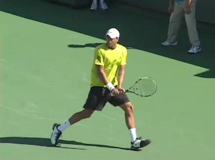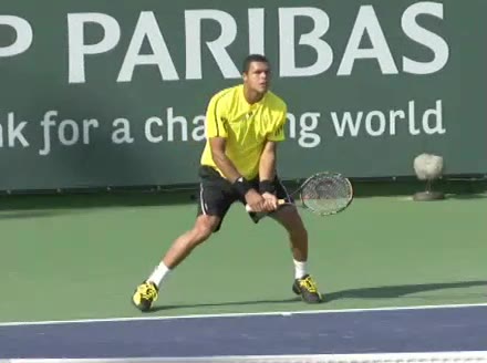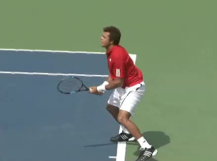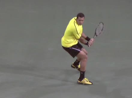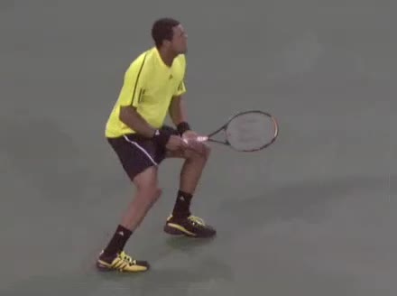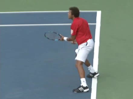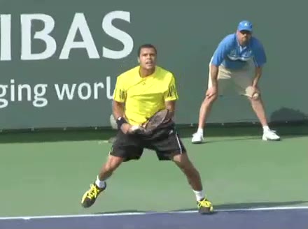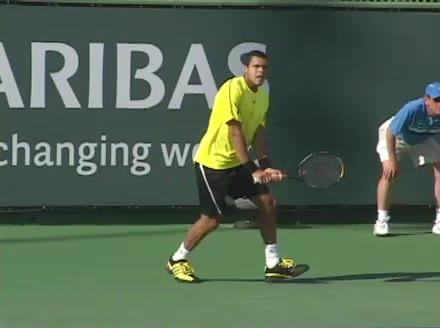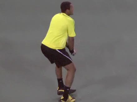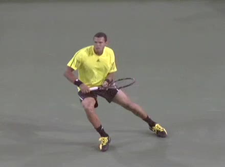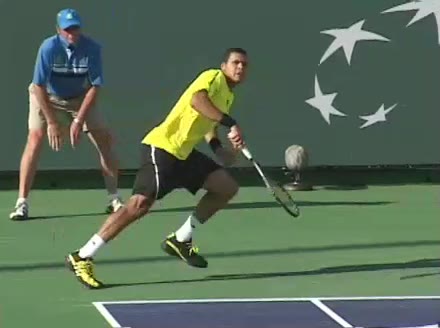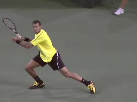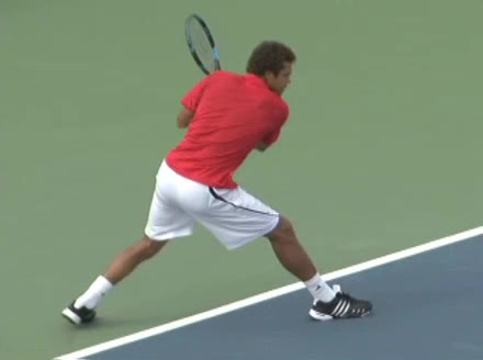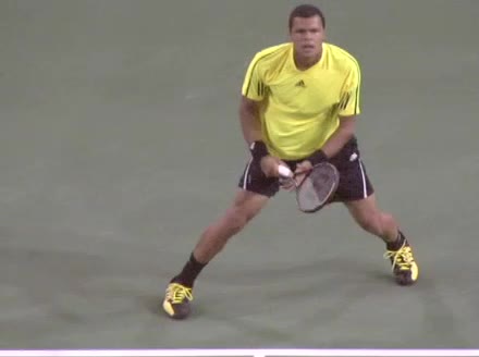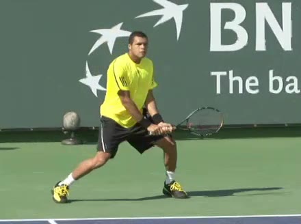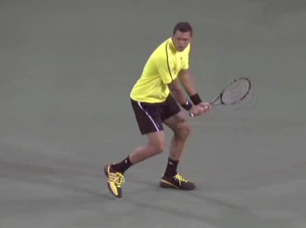 Jo-Wilfried Tsonga's backhand while moving back from a neutral position, filmed from a court-level front angle. His hips stay relatively closed to the net as he retreats, with a pronounced knee bend and strong push off the outside leg to stabilize before swinging.