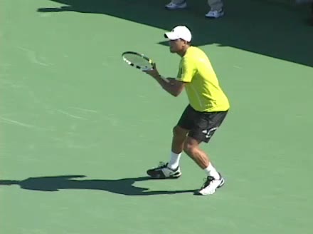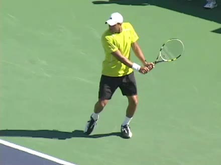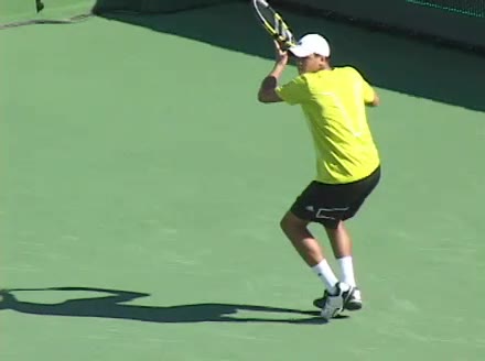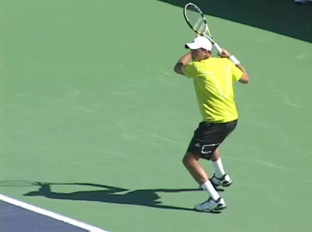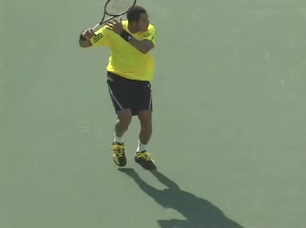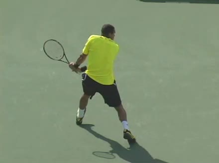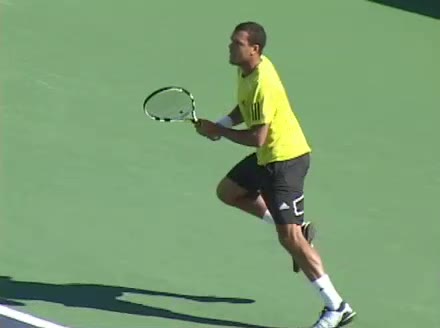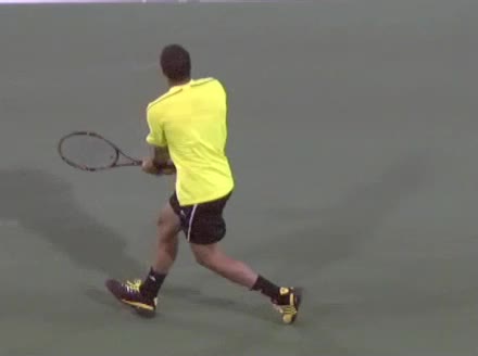 Jo-Wilfried Tsonga's running backhand slice from a neutral court position, filmed from a rear angle at 240 fps. His shoulders rotate early as the trunk coils against the direction of movement, then uncoil in sequence with the hitting arm to keep the racquet face stable through contact.