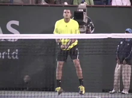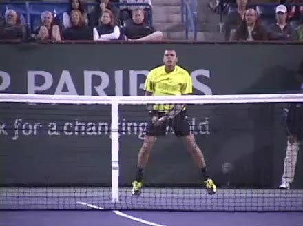 Jo-Wilfried Tsonga's forehand approach and overhead into a forehand volley from the center of the court, filmed from a court-level front angle. After contact he drives his weight forward through the court, with his non-hitting hand tucking in as he quickly resets the racquet in front of his body to recover for the next ball.