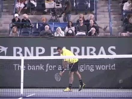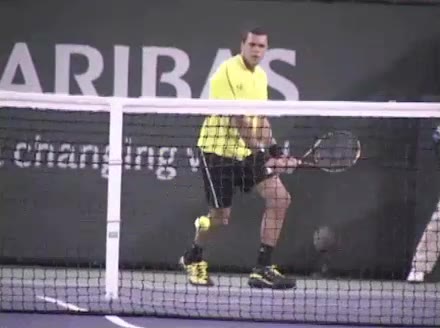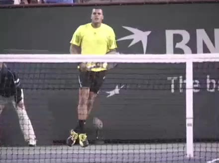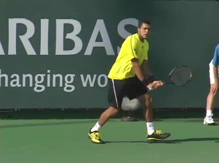 Jo-Wilfried Tsonga's running backhand slice from the front, filmed from a court-level front angle. The racket face stays slightly open at contact with the ball struck around waist height, and the high-to-low swing path produces a distinct downward cutting motion through impact.