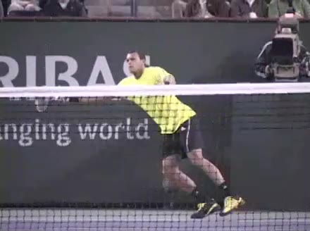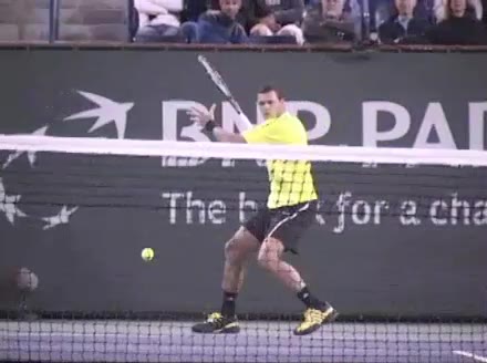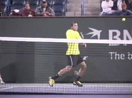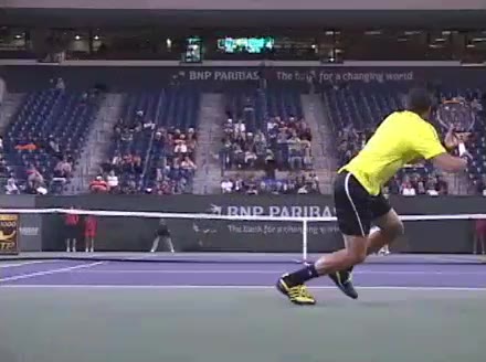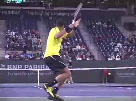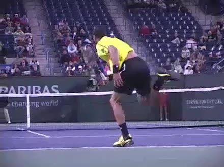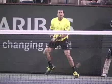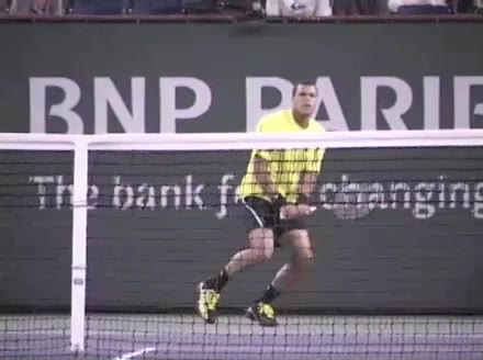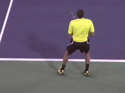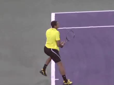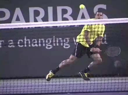 Jo-Wilfried Tsonga's forehand approach and backhand volley from the side, filmed from a side angle. His shoulders load with a pronounced coil before the forehand, then uncoil into contact as the trunk continues rotating forward into the backhand volley, showing a clear sequential transfer from torso to arms.