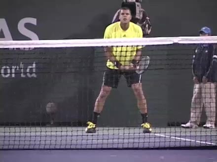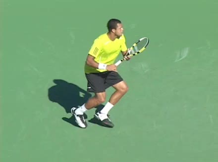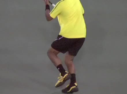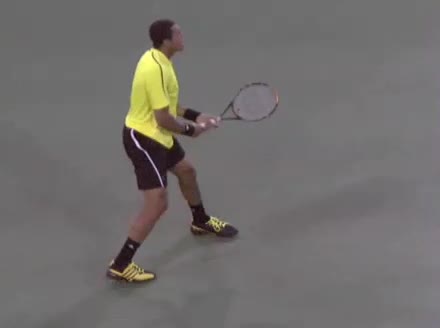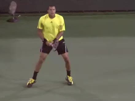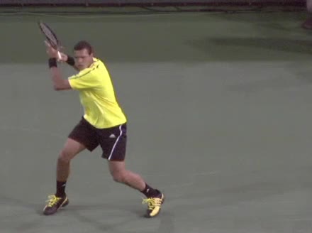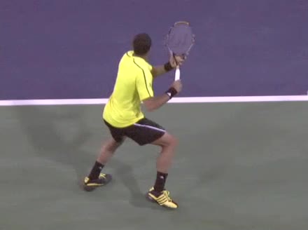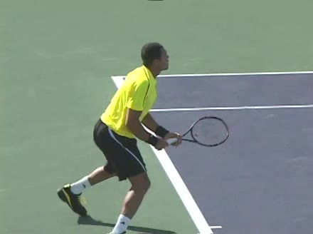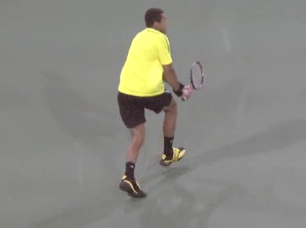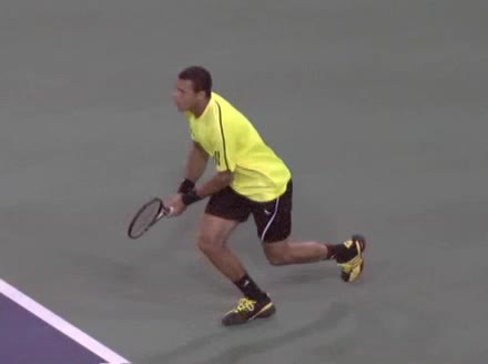 Jo-Wilfried Tsonga's forehand approach shot followed by a forehand volley and backhand slice while moving back from the center of the court, filmed from the side. His follow-through carries his momentum forward into the court before he quickly regroups with his non-hitting hand helping the racquet return to a neutral ready position as he recovers.