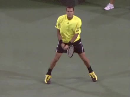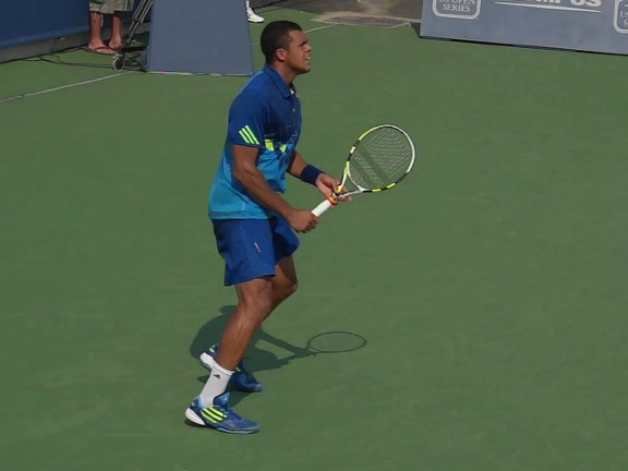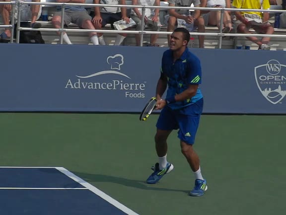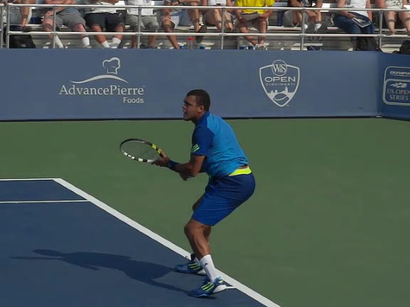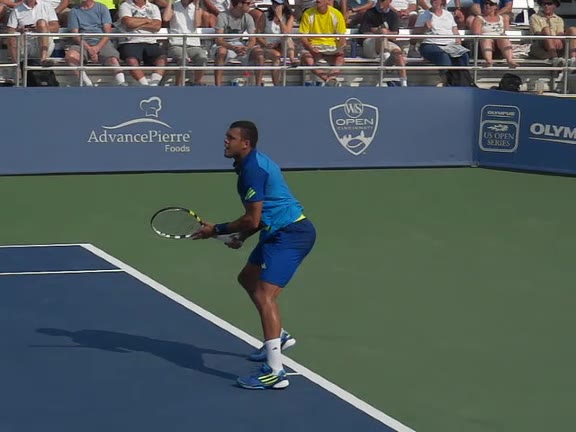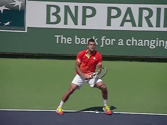 Jo-Wilfried Tsonga's backhand slice from a wide position, filmed from a front angle. His stance stays mostly neutral as he steps out to the wide ball, with a small adjustment step after contact to recover back toward the center.