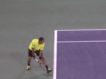 Jo-Wilfried Tsonga's running forehand slice from the front of the court, filmed from a front angle. His footwork features quick adjustment steps into a semi-open stance, with a pronounced left-leg plant that lets him stay low and recover forward after contact.