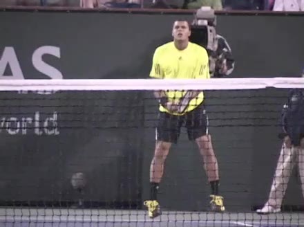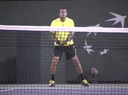 Jo-Wilfried Tsonga's forehand approach and backhand volley from the center of the court, filmed from a court-level front angle. The racket face on both shots is clearly visible, with the forehand contact made slightly in front of his body and the backhand volley struck with a firm, slightly open face to keep the ball low and controlled.
