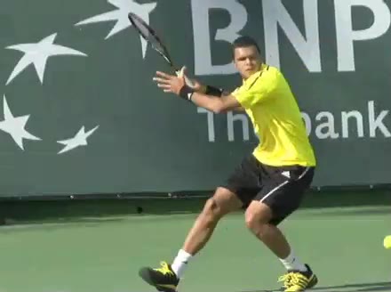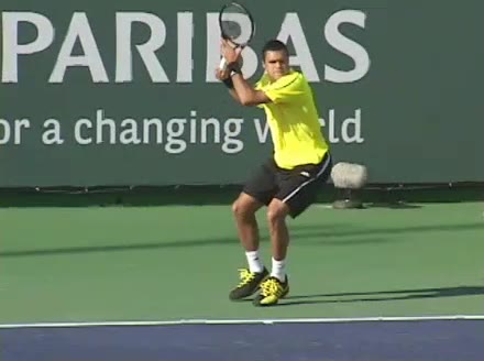 Jo-Wilfried Tsonga's forehand approach shot from a central position, filmed from a court-level front angle. His shoulders rotate aggressively ahead of the hips on the forward swing, with a pronounced trunk uncoil that continues through the shot into his movement toward the net.