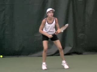 Kalindi’s forehand from the center of the baseline, filmed from a side CourtLevel angle. Her shoulders load well past 90 degrees relative to the hips before uncoiling, making the trunk rotation and sequential release through contact easy to compare with the teaching points in Joe Dinoffer’s junior development system.