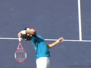 Flash's second serve from the baseline, filmed from a rear court-level angle. The contact point is slightly above head height with the racket face more closed, emphasizing an upward brushing motion that accelerates the racket head up and across the ball.