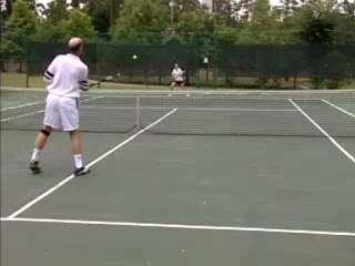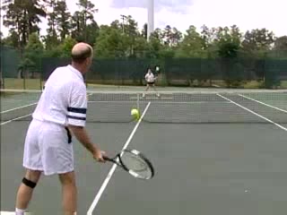 Joe Dinoffer's kneeling and standing FH/BH demo from center court, filmed from a front animation angle. The contact point is illustrated with the racket face staying square to the target zone as the hand leads slightly ahead of the racket head through impact.