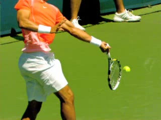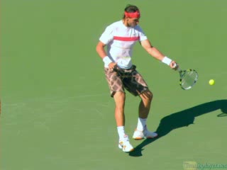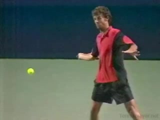 Gustavo "Guga" Kuerten's groundstrokes from the center of the court, filmed from a side animation angle. His extreme western forehand grip and pronounced wrist lag before contact are clearly visible in the animation frames.