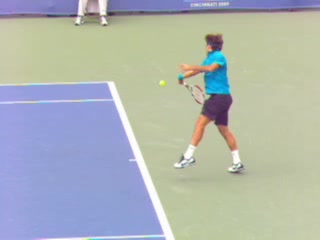 Federer's FH from the center of the baseline, filmed from a side CourtLevel angle. His shoulders rotate well past 90 degrees relative to the net on the unit turn, then the trunk uncoils ahead of the arm swing, with the hitting shoulder finishing fully wrapped across his body.
