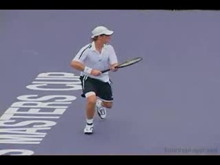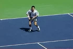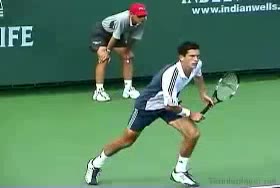 Michael Friedman's forehand from the center of the court, filmed from an animated instructional angle. The animation clearly depicts the hips turning ahead of the shoulders while the knees stay flexed to drive the legs through the stroke.