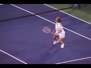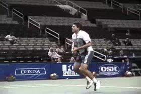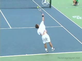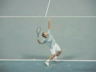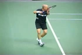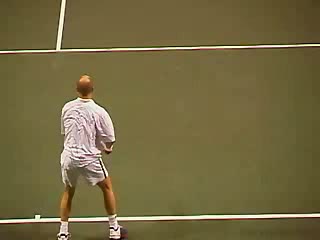 Agassi's overhead from the center of the court, filmed from a rear angle. His hips stay relatively closed as he turns and loads, with a pronounced knee bend and upward leg drive into the contact.