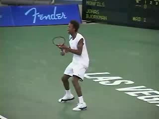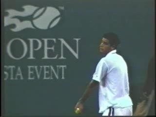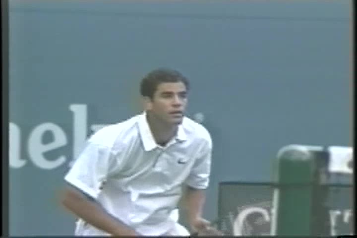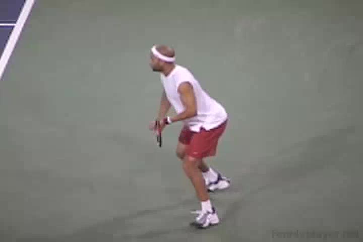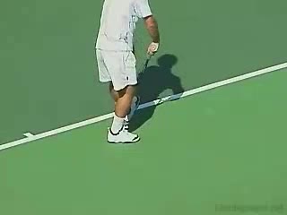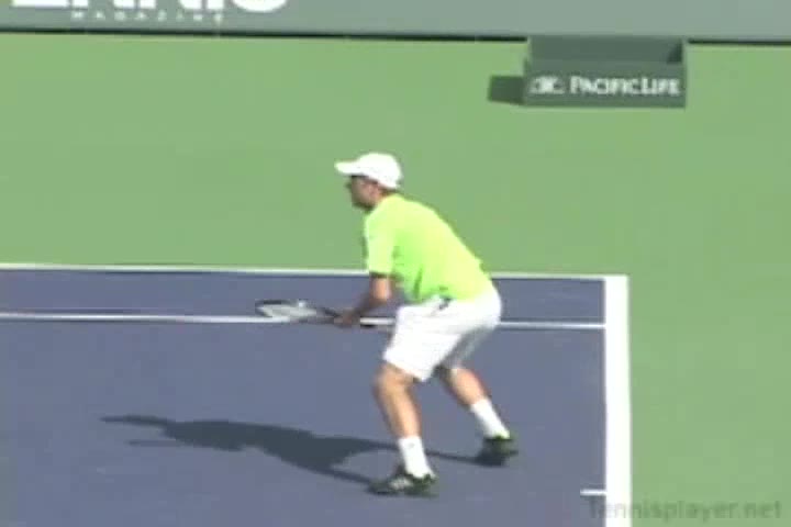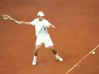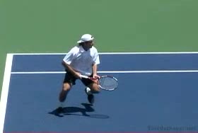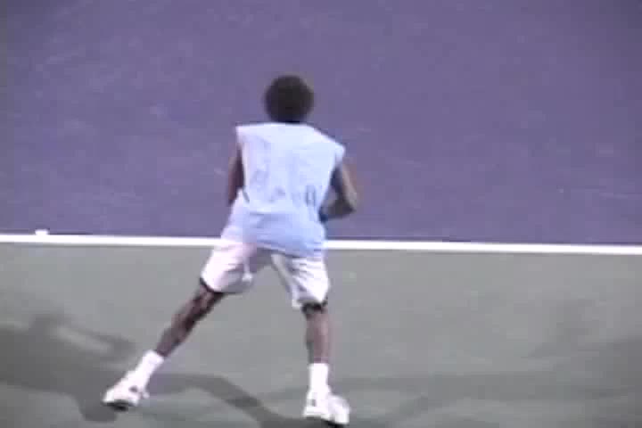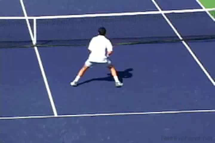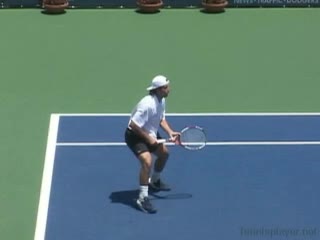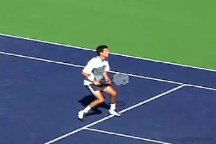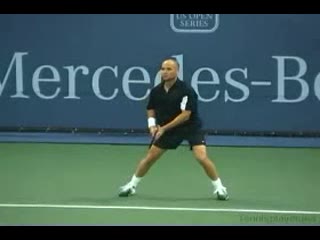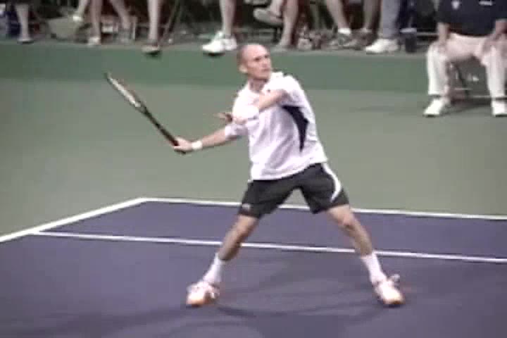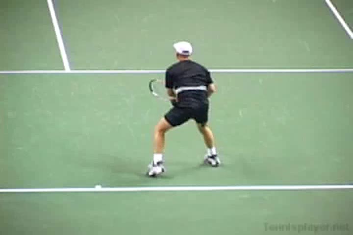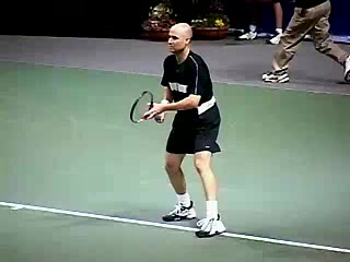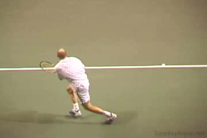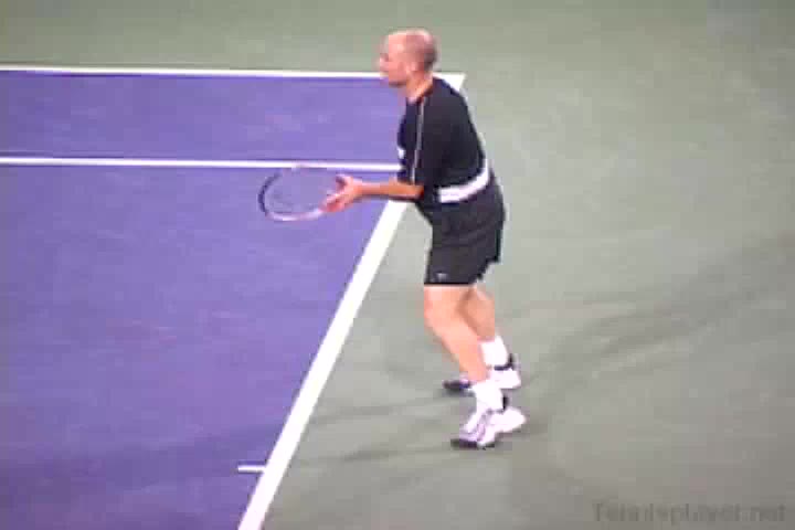 Andre Agassi’s forehand on the rise from a neutral baseline position, filmed from a side CourtLevel angle. His early split step into a compact adjustment hop sets up a semi-open stance, followed by a quick recovery step that keeps him tight to the baseline.