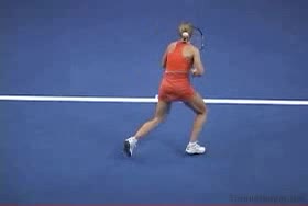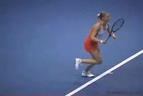 Dementieva's forehand approach from the short court, filmed from the side. Her hips stay slightly closed as she moves forward, with a pronounced knee bend and strong forward leg drive that keeps her momentum flowing through the court.