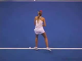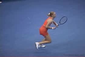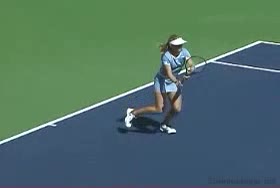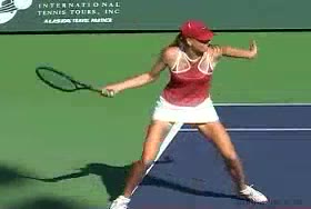 Dementieva's forehand from the baseline, filmed from the side. Her small adjustment steps keep her in a neutral stance before contact, then she uses a pronounced forward cross-step into the court to maintain continuous forward flow.