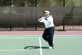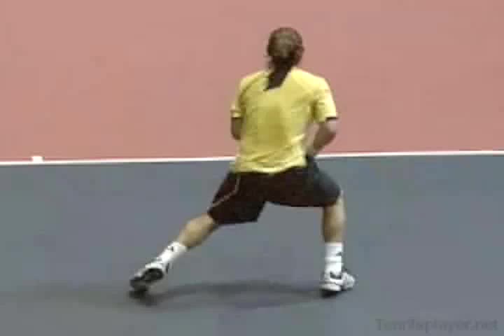Michael Friedman's footwork medley from a neutral court position, filmed from a side angle. His shoulders and trunk rotate as a unit over a stable pelvis, with a clear coil and uncoil sequence that syncs upper-body rotation to each planting step.