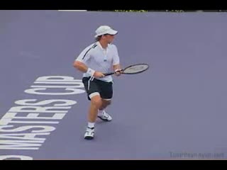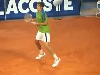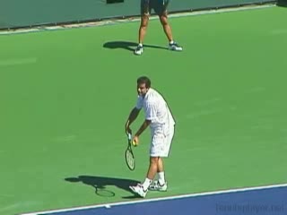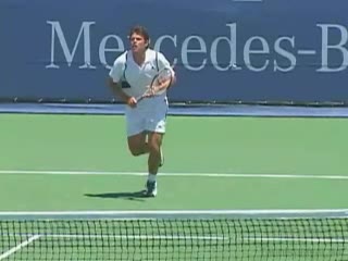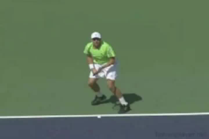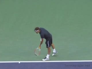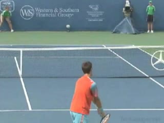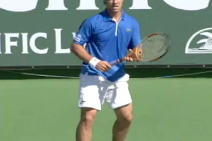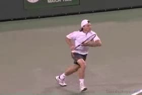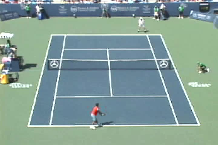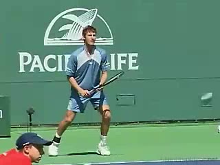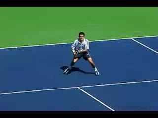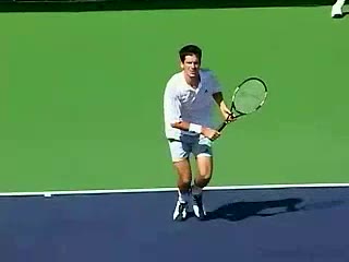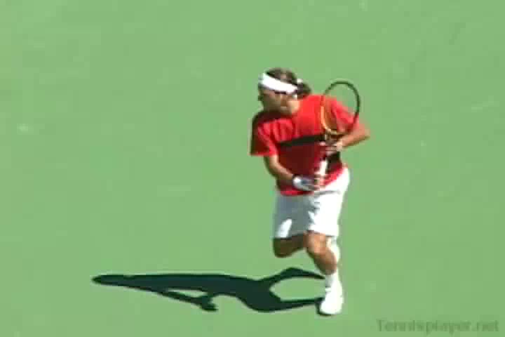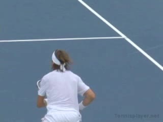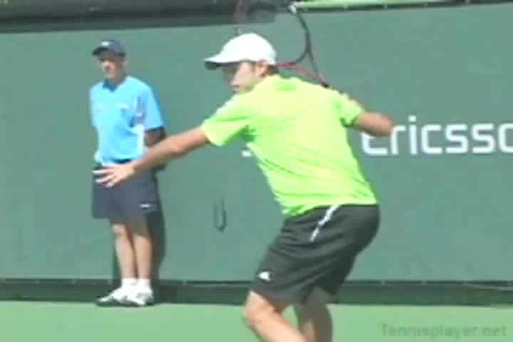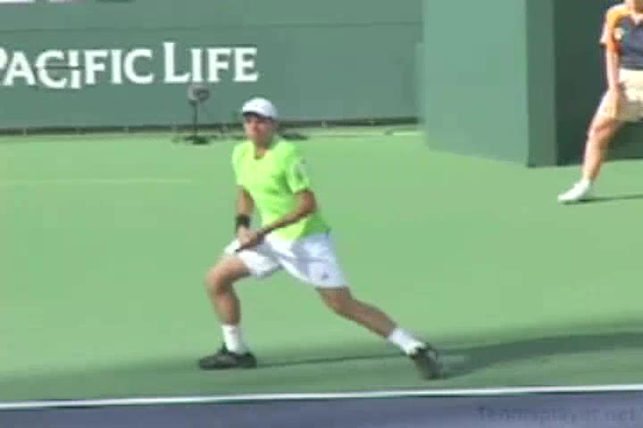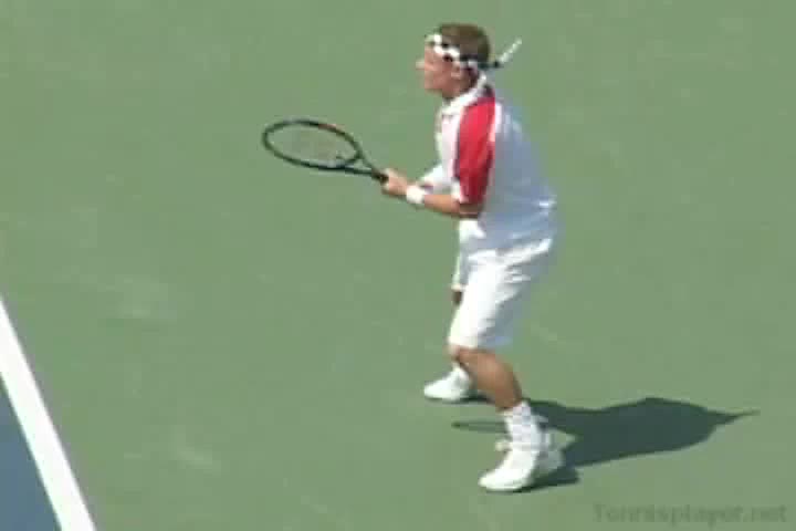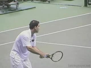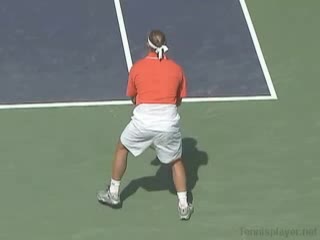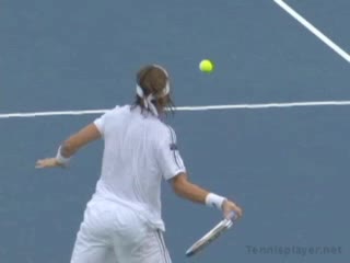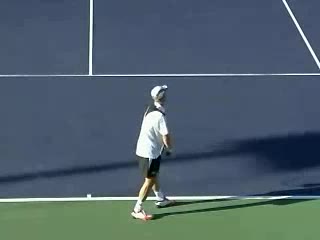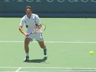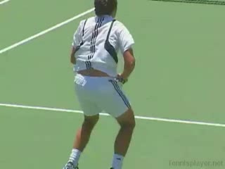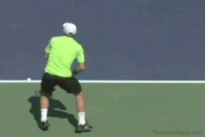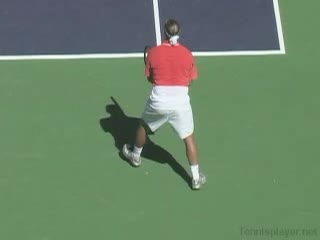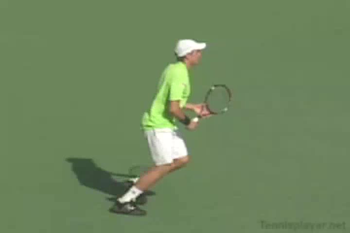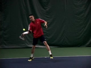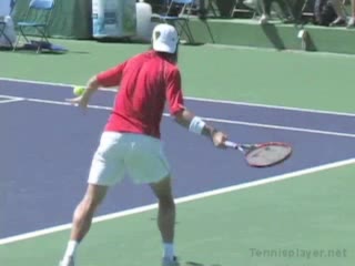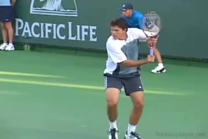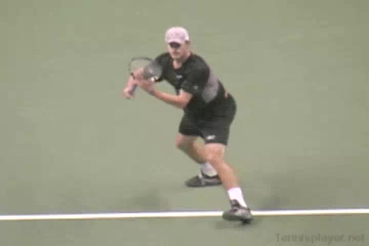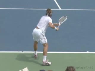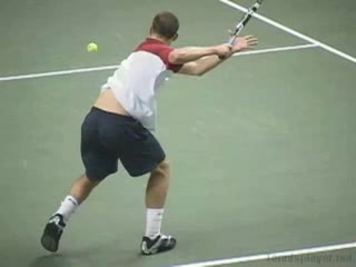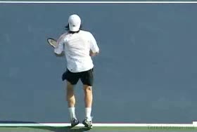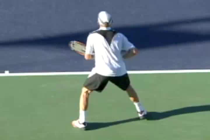 Michael Friedman's forehand from the center of the court, filmed from a rear angle. From this view you can see his semi-western grip stay firm while his wrist maintains a consistent lag before snapping forward into contact.