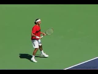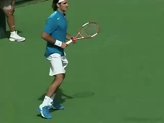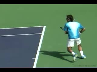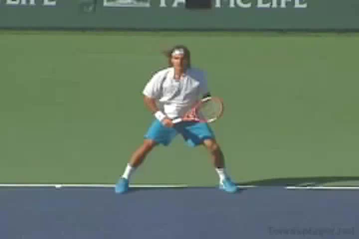 Nadal's return from a neutral return position, filmed from a side animation angle. His follow-through finishes around shoulder height with the non-hitting hand counterbalancing in front of his body before he quickly resets into a compact ready position.
