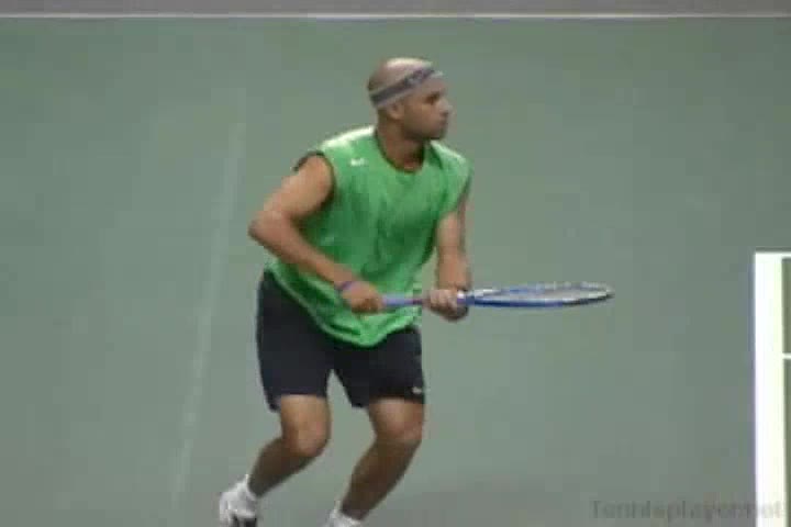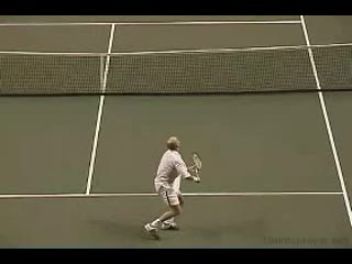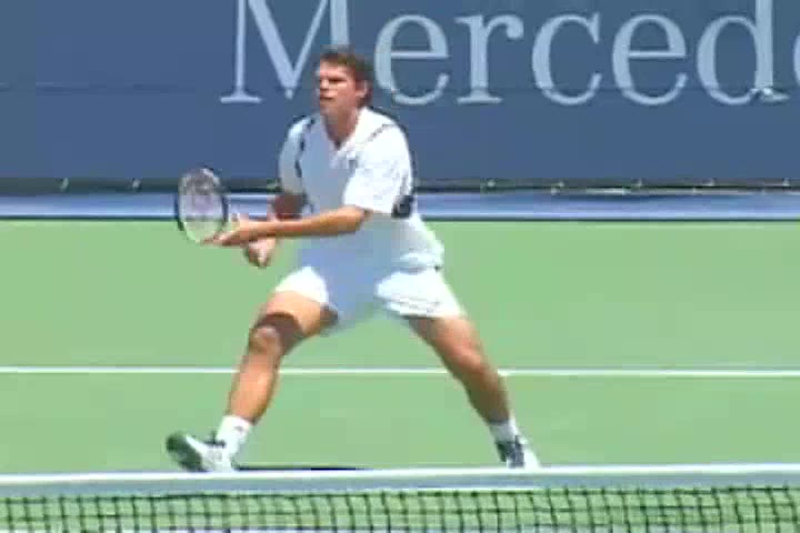 Henman's forehand volley from the net area, filmed from the side. His continental grip stays firm with minimal grip change, and his wrist remains stable with almost no wrist snap, creating a compact punching action through contact.