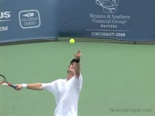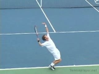 Michael Friedman's serve from a central position, filmed from a court-level angle. After contact he moves forward into the court with his weight transferring toward the net and his non-hitting hand dropping quickly into a compact ready position for the volley.